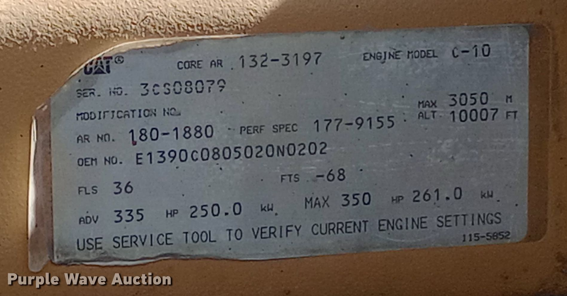 2000 Peterbilt 357 dump truck. Miles: 296,295 on odometer, Hours: 4,301 on meter, VIN: 1NPALT0XXYN531143. Engine Caterpillar C10, Serial: 3CS08079, Displacement: 10.3L, Cylinders: 6, Fuel type: Diesel, Engine brake. Transmission Eaton Fuller, Manual, Speed: 8. Chassis Axles: Tandem, Suspension: Spring over walking beam, Brakes: Air, PTO, GVWR: 73,200 lbs. Interior AC, Heat, Cruise control. Features Dump bed 15' L x 96" W, Side height: 38", Side board height: 9.5", Bed type: Steel, Ram: Single, End gate: Air operated. Tires Front: 425/65R22.5, Rear: 11R22.5. Kansas title. Title distribution may be delayed up to 14 days from verification of funds. El Dorado, KS 67042