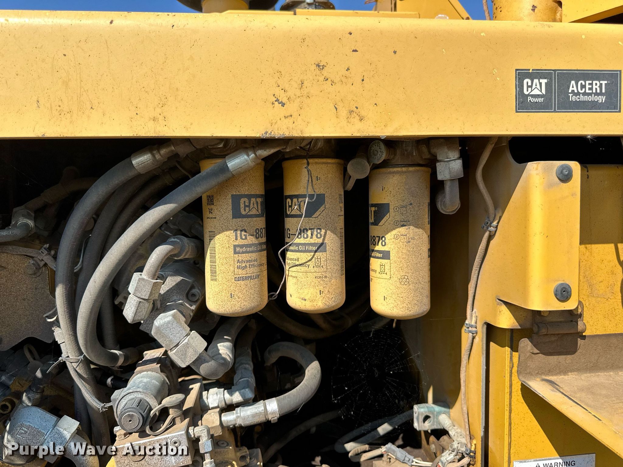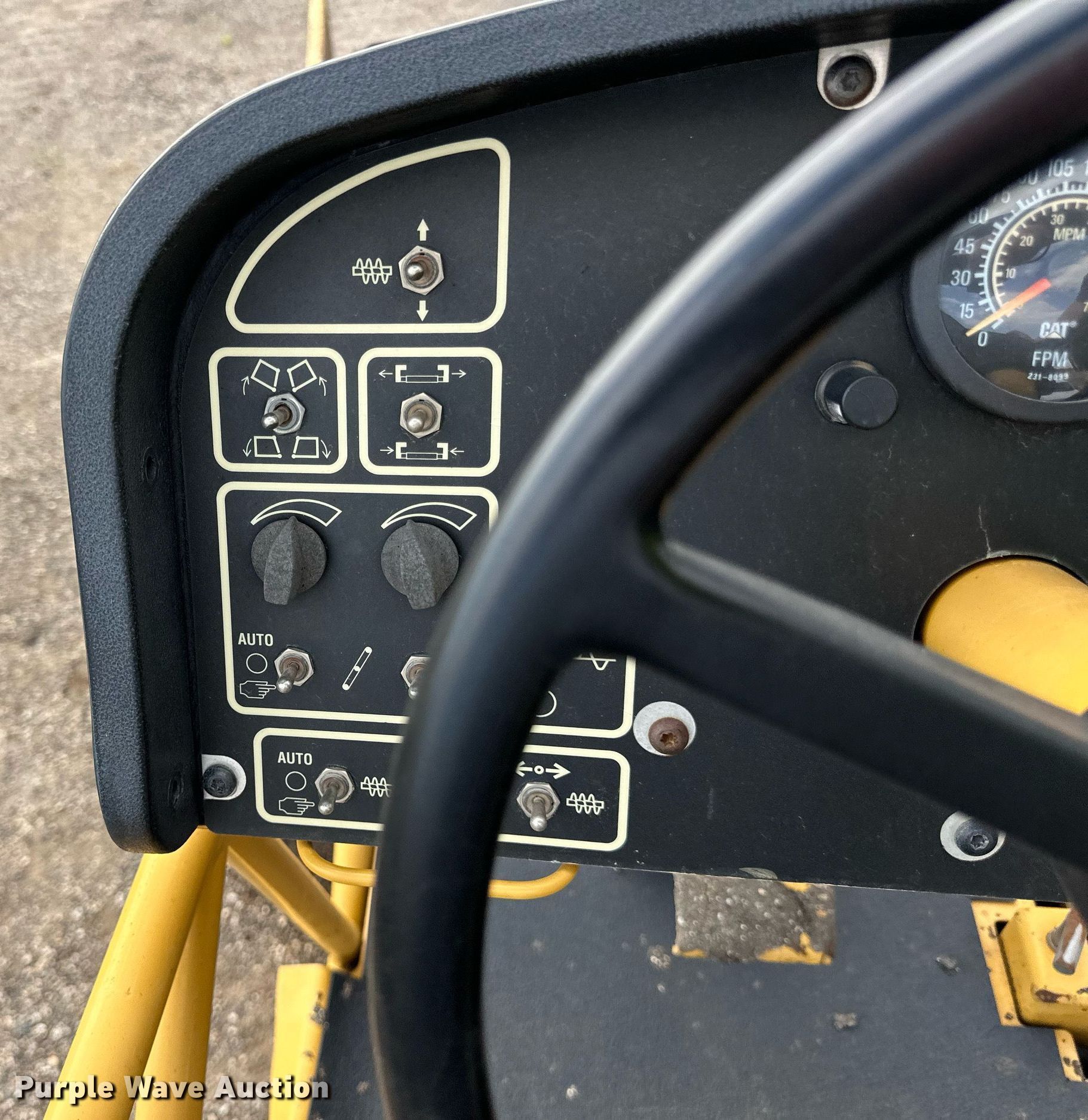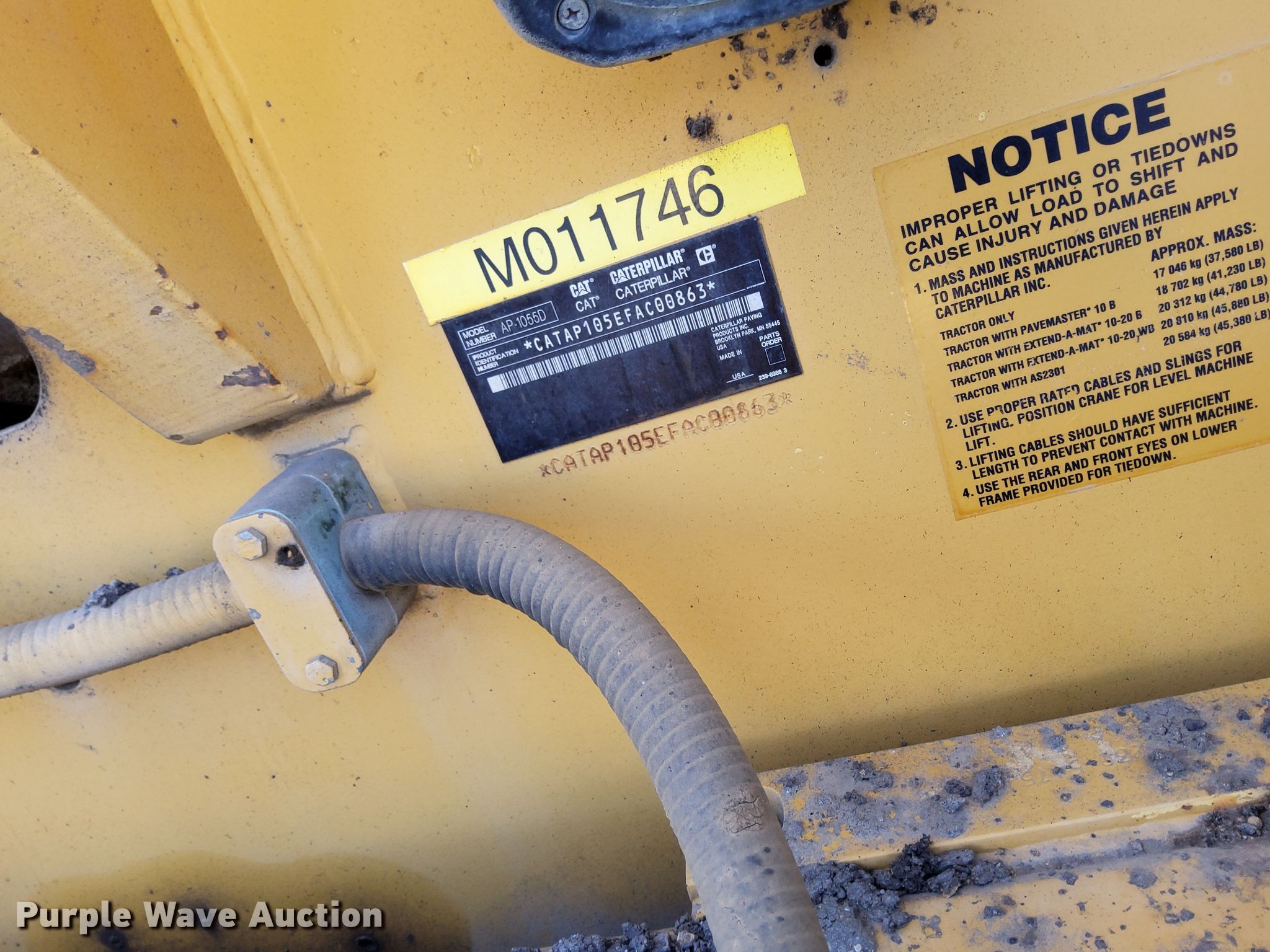 2011 Caterpillar AP1055D paver. Hours: 9,878 on meter, Serial: CATAP105EFAC00863. Engine Caterpillar C7, Cylinders: 6, Fuel type: Diesel. Transmission Hydrostatic. Features Screed Caterpillar 10-20B, Serial: BWN02992, Paving width: 10' to 20', Extensions Quantity: 2, Screed heater: Electric, Front spread hopper width: 11', Material conveyor Width: 45", Wash down system, Ground level remote. Tracks Width: 18", Rubber. Notes Dead battery. Knife River Co.. Williston, ND 58801