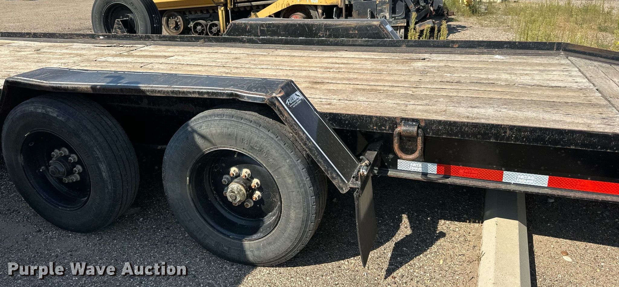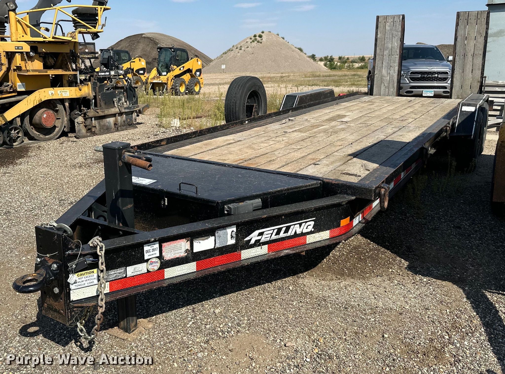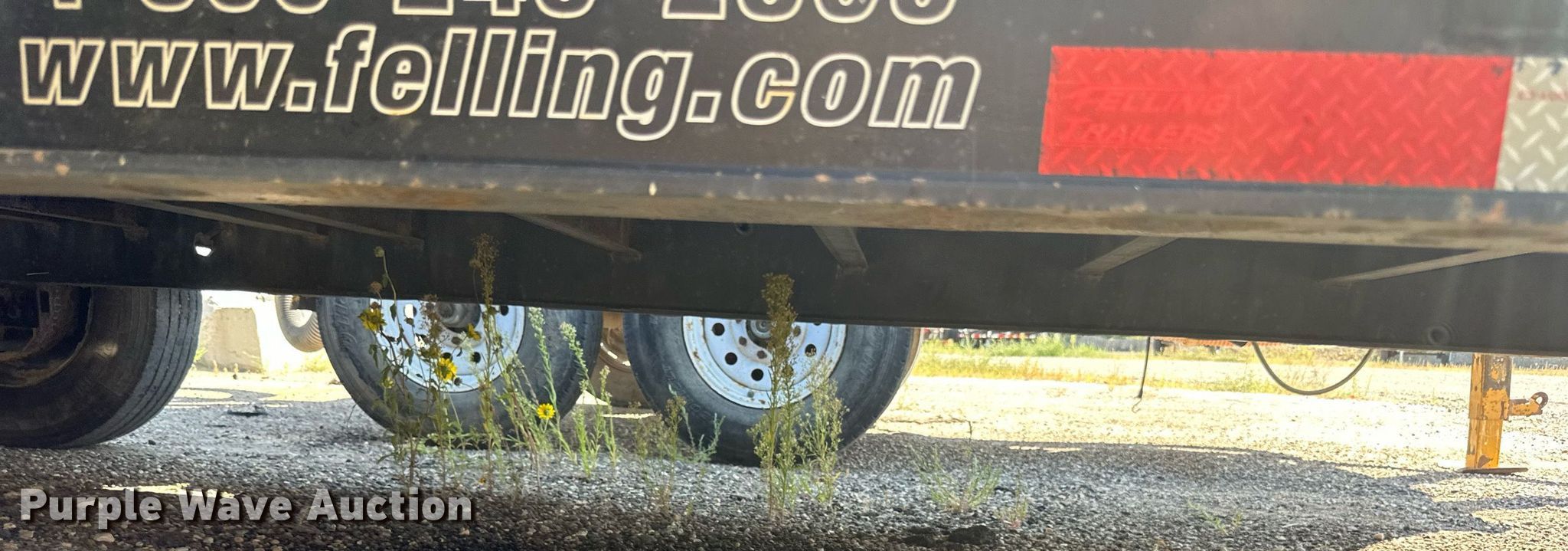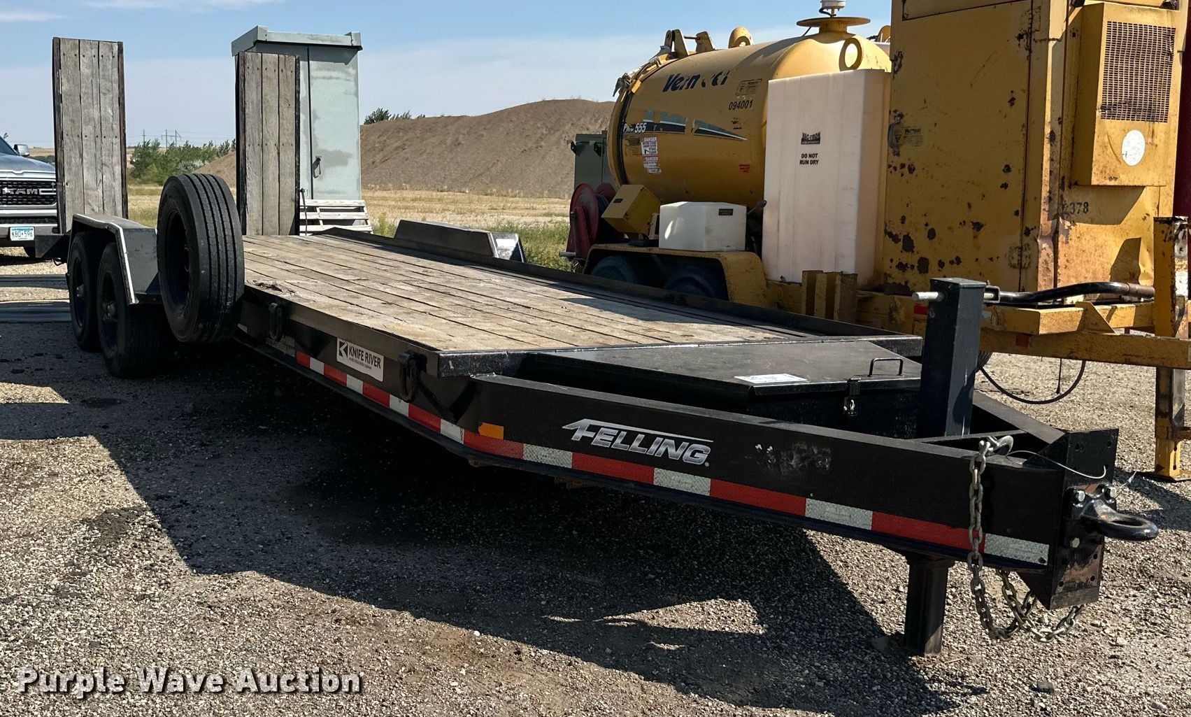 2014 Felling FT20 equipment trailer. VIN: 5FTEE2521E1000142. Dimensions Overall: 31' L x 102" W, Deck: 22' L x 82" W, Rear deck length: 22', Deck height: 2' 6", Tail length: 3', Ramps: Manual Length: 6' 7". Features Deck type: Wood. Chassis Hitch: Pintle, Landing gear: Single, Suspension: Spring, Brakes: Electric, Axles: Tandem, GVWR: 24,000 lbs. Tires Steel wheels, Size: 235/75R17.5. North Dakota title. Knife River Co.. Williston, ND 58801