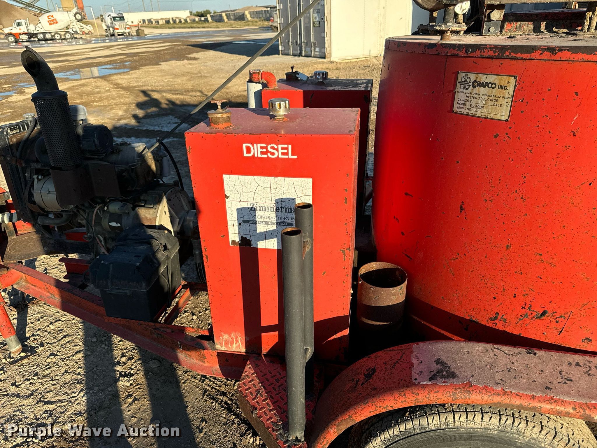 Crafco EZ Pour pot hole patcher. Hours: 1,765 on meter, Serial: 90 2 068 2EP. Engine Izuzu, Cylinders: 3, Fuel type: Diesel. Features Capacity: 200 gallons. Tires Size: ST205/75R14. Notes Dead battery. This is worksite support equipment and will not come with a title. Transfer of ownership documentation will be a bill of sale. Knife River Corporation. Bismarck, ND 58504