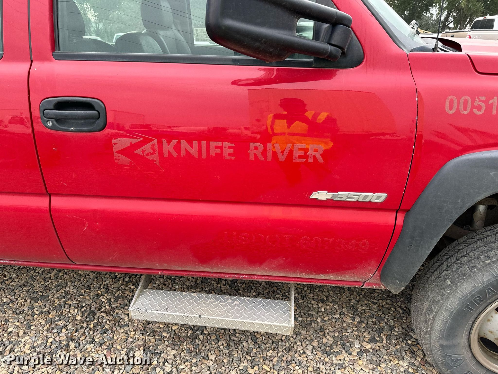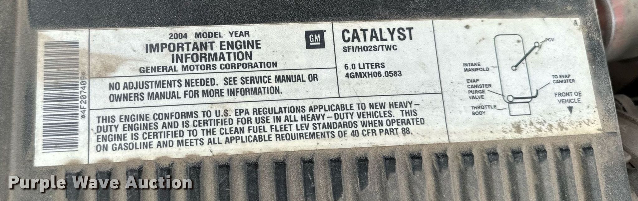 2004 Chevrolet Silverado 3500 Crew Cab pickup truck. Miles: 336,830 on odometer, Hours: 15,356 on meter, VIN: 1GCJC33U64F207409, Unit #: 005121. Engine Displacement: 6.0L V8 OHV, Cylinders: 8, Fuel type: Gas. Transmission Automatic. Interior AC, Heat, Cruise control. Tires Size: LT215/85R16. North Dakota title. Knife River Corporation. Bismarck, ND 58504