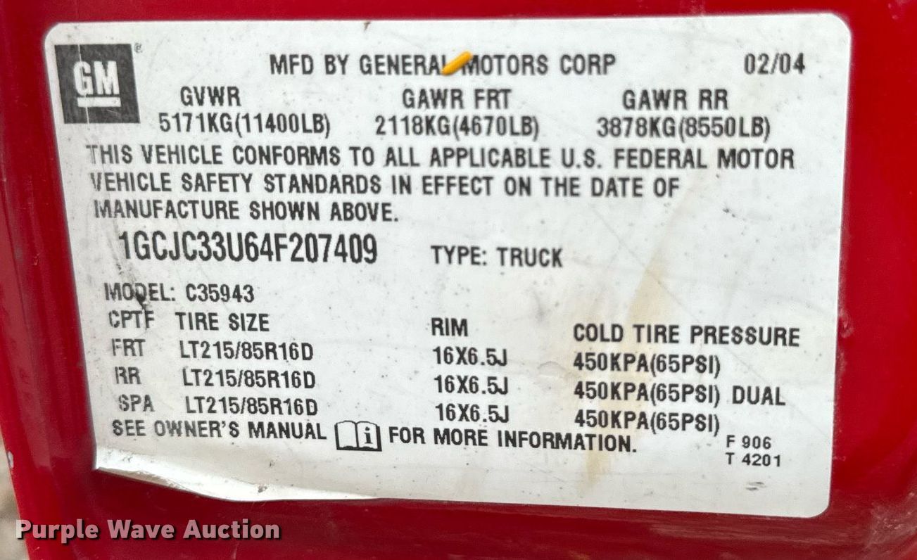 Purple Wave is selling a used 3/4 or 1 Ton Pickup or Van in North Dakota. This item is a 2004 Chevrolet Silverado 3500 Crew Cab pickup truck with the following: Miles: 336,830 on odometer, Hours: 15,356 on meter, VIN: 1GCJC33U64F207409, Unit #: 005121