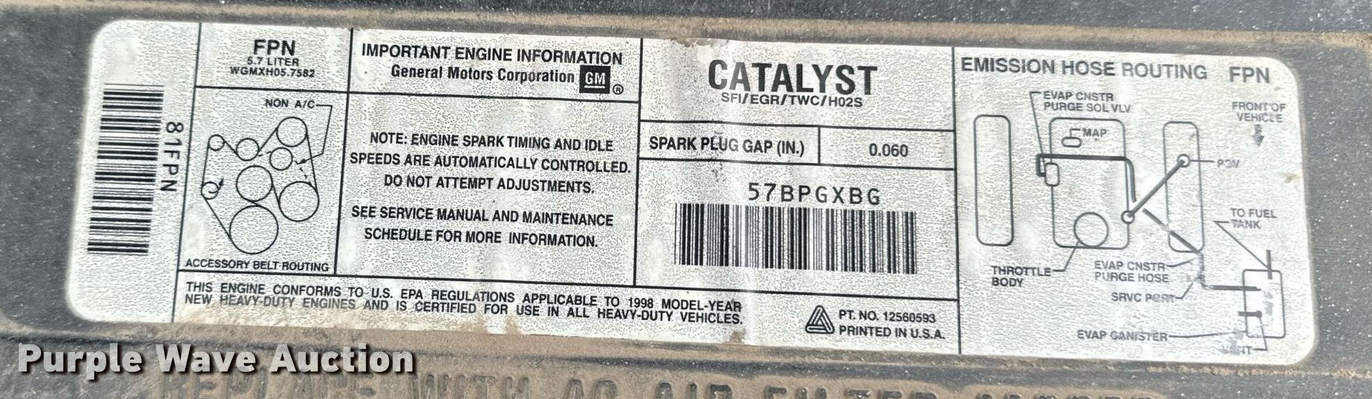 1998 Chevrolet C3500 Crew Cab pickup truck. Miles: 346,584 on odometer, VIN: 1GCGC33R2WF032200. Engine Displacement: 5.7L, Cylinders: 8, Fuel type: Gas. Transmission Automatic. Interior AC, Heat, Cruise control. Tires Size: LT245/75R16. Notes Windshield chipped or cracked. North Dakota title. Knife River Corporation. Bismarck, ND 58504