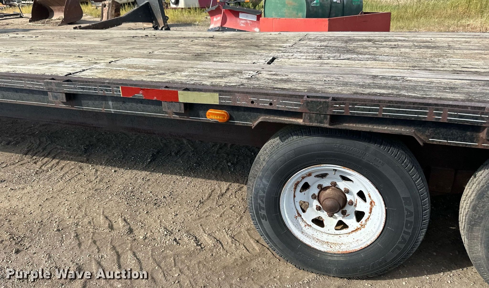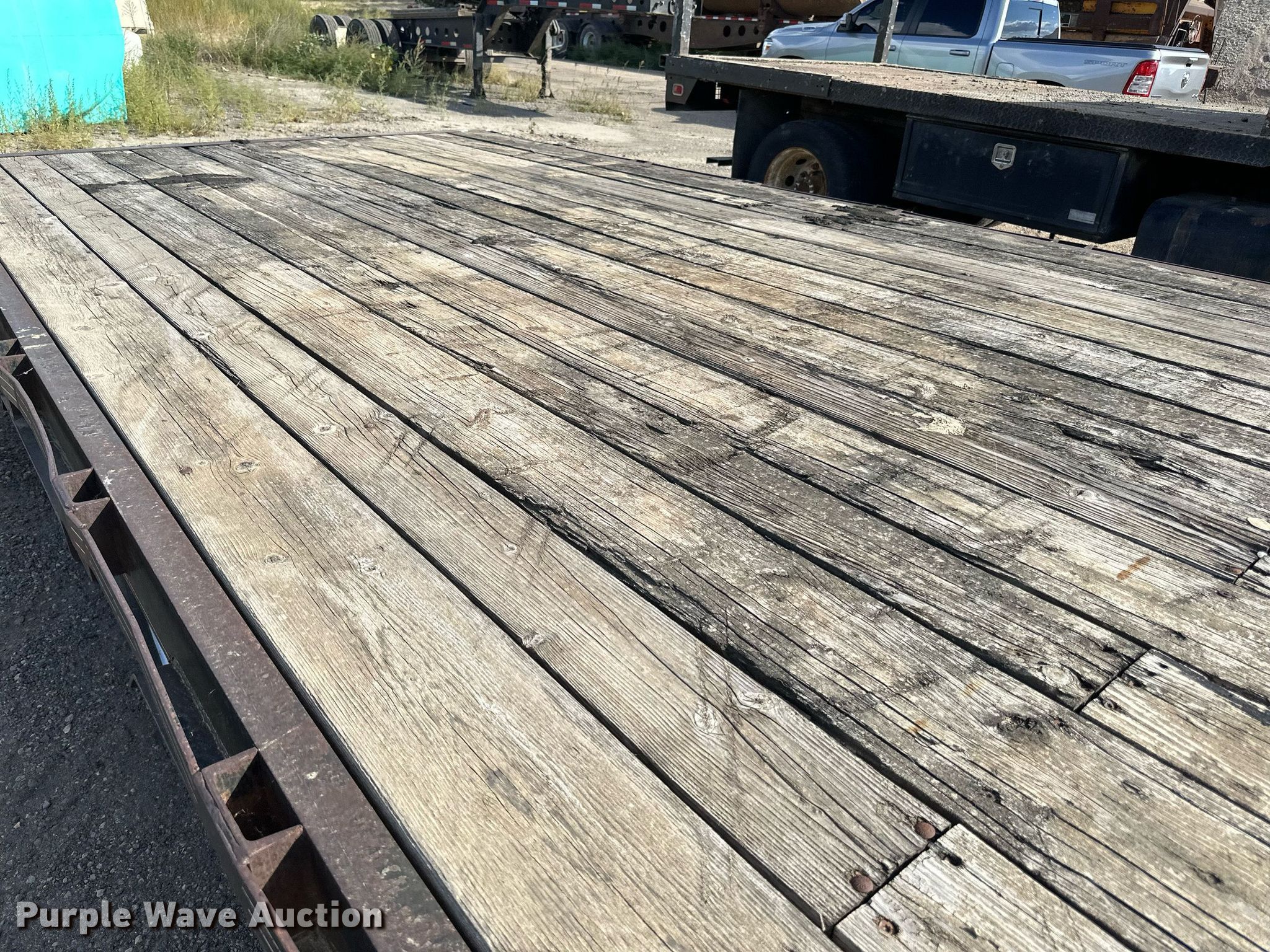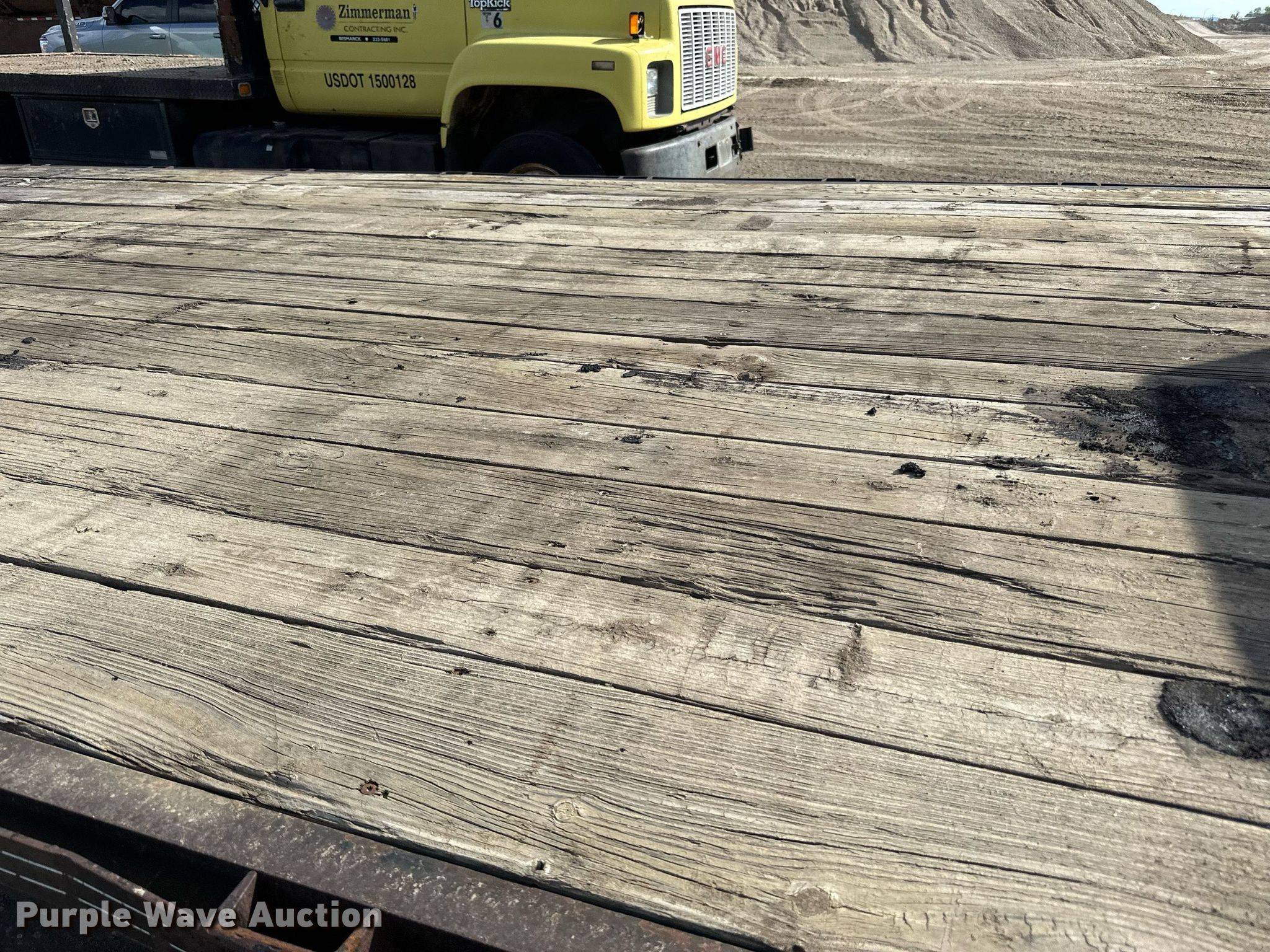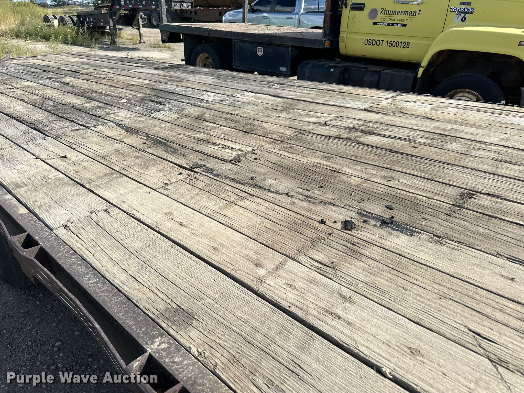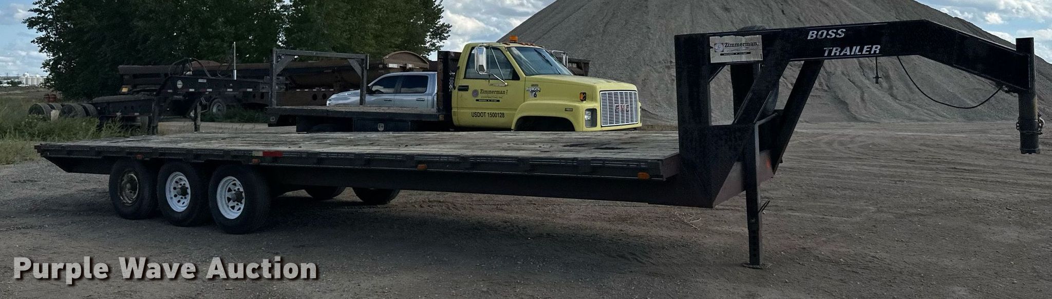 1989 Boss Trailer 828FGN flatbed trailer. VIN: 463582820X1000548. Dimensions Overall: 36' L x 96" W, Deck: 28' L x 96" W, Deck height: 3'. Features Deck type: Wood. Chassis Hitch: Gooseneck, Landing gear: Single, Suspension: Spring, Brakes: Electric, Axles: Triple, GAWR: 7,000 lbs. Tires Steel wheels, Size: LT235/85R16. North Dakota title. Knife River Corporation. Bismarck, ND 58504