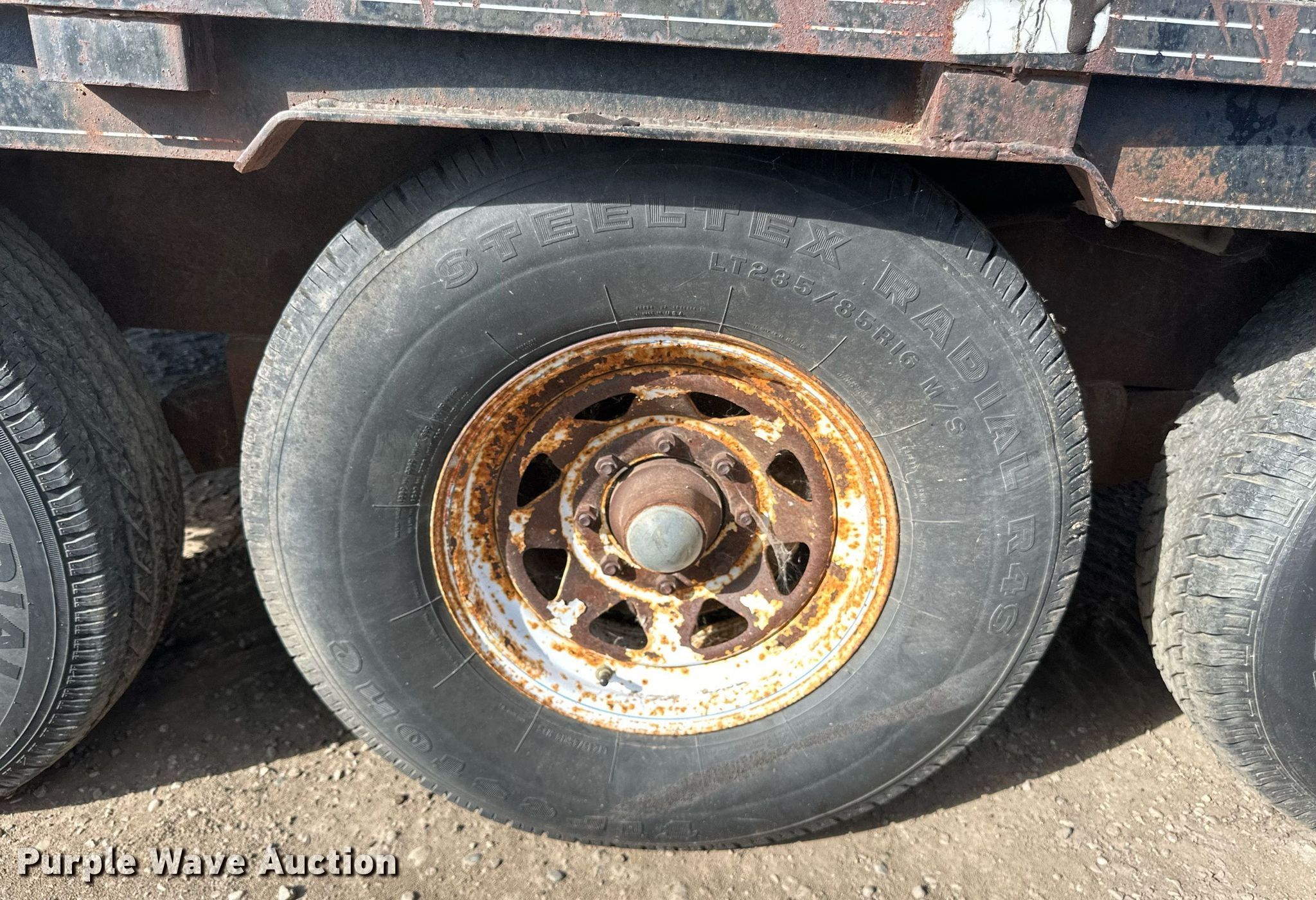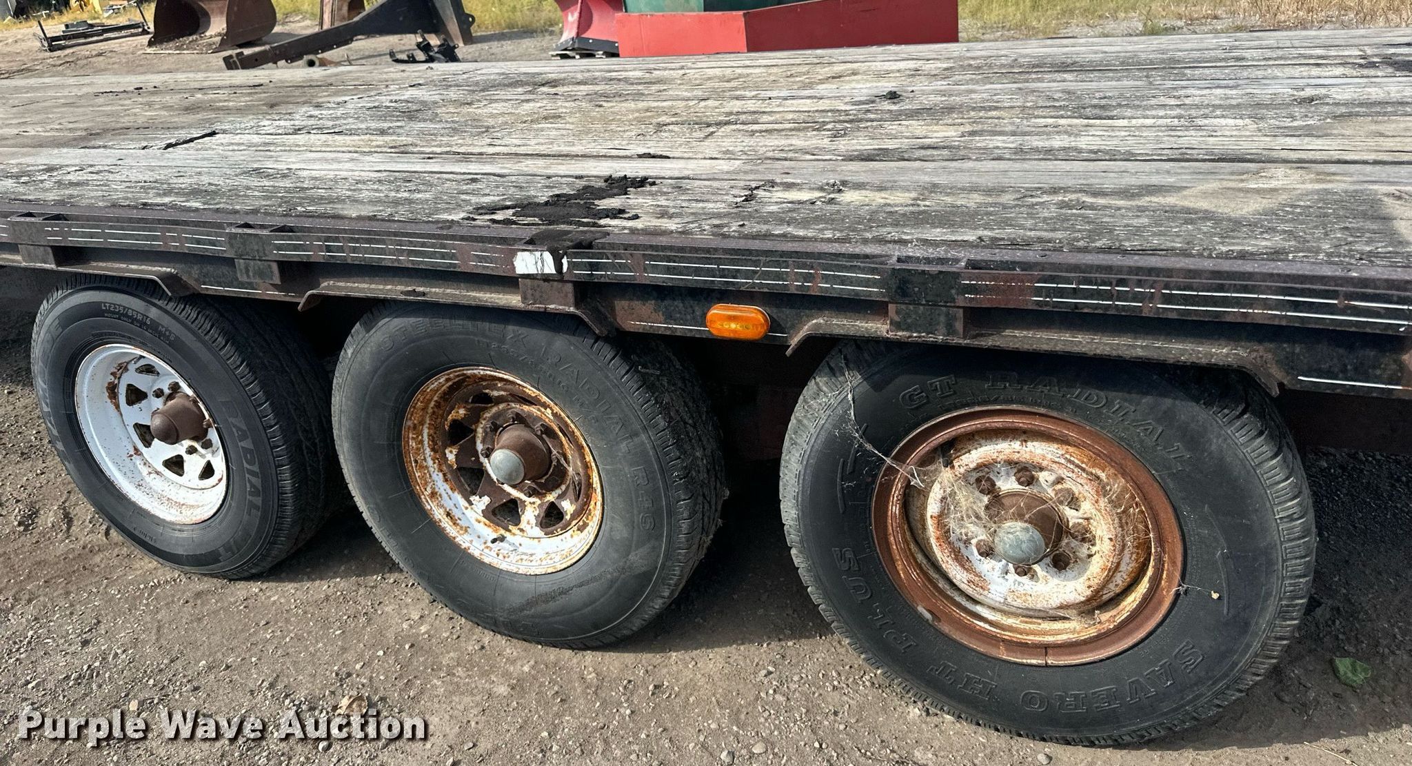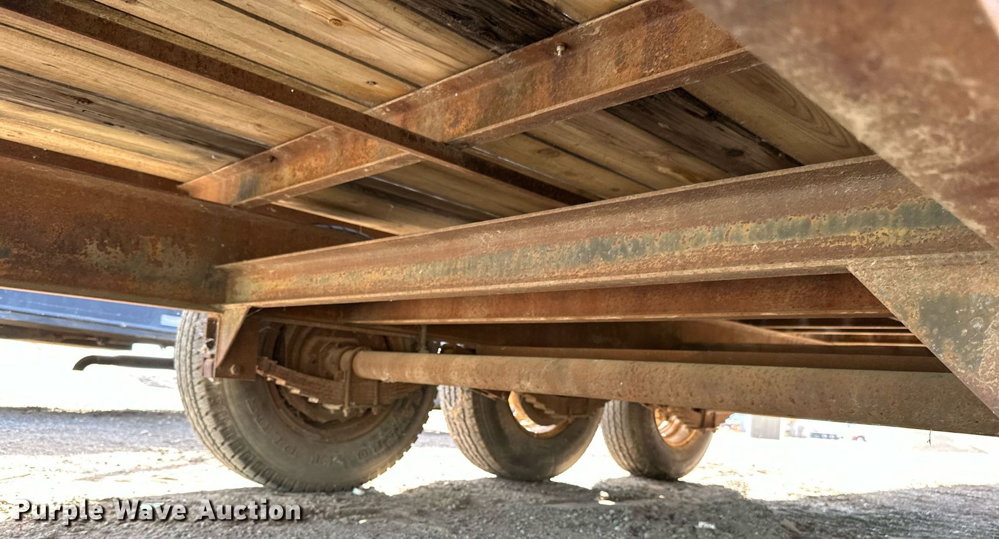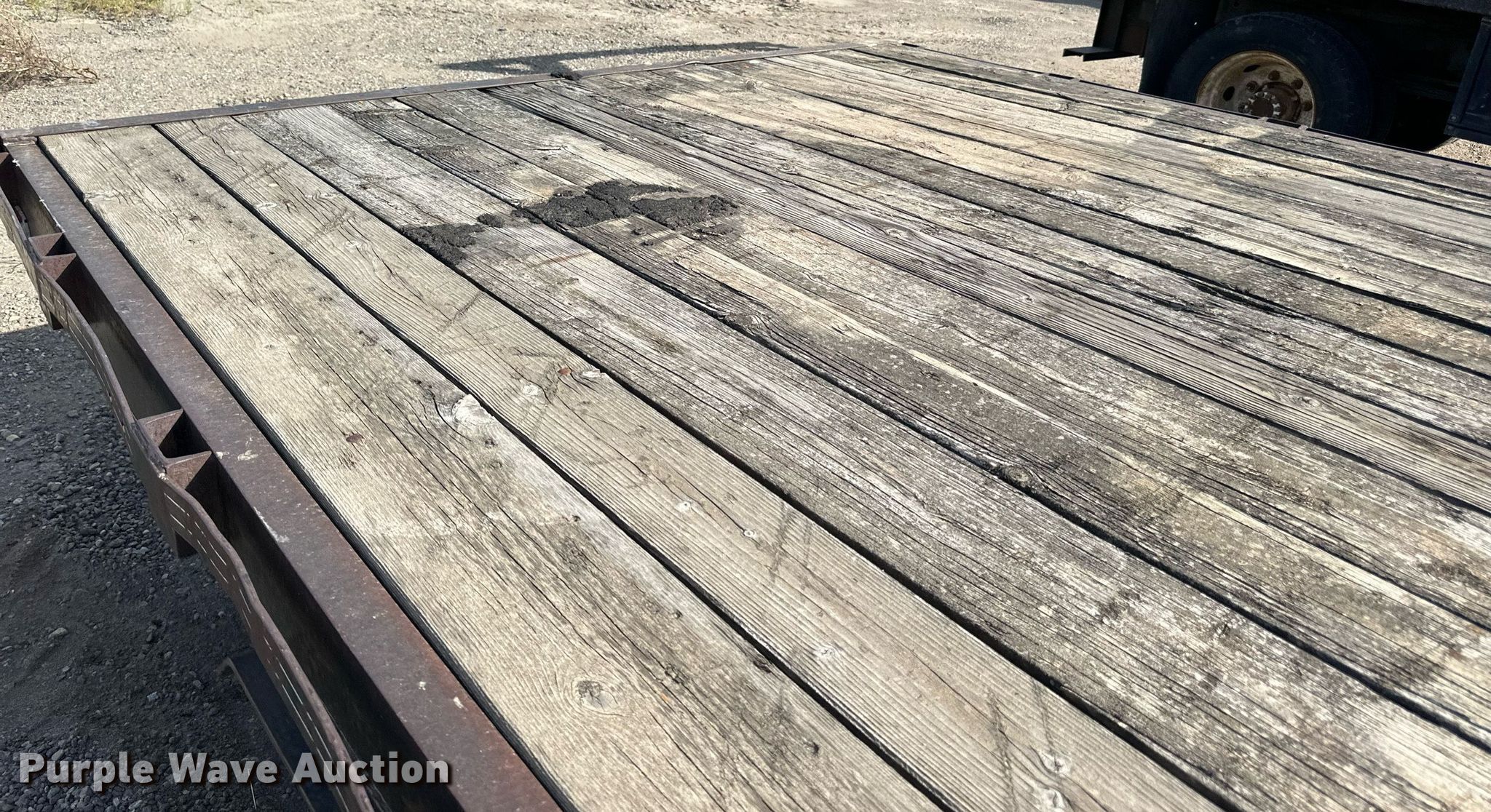 1989 Boss Trailer 828FGN flatbed trailer. VIN: 463582820X1000548. Dimensions Overall: 36' L x 96" W, Deck: 28' L x 96" W, Deck height: 3'. Features Deck type: Wood. Chassis Hitch: Gooseneck, Landing gear: Single, Suspension: Spring, Brakes: Electric, Axles: Triple, GAWR: 7,000 lbs. Tires Steel wheels, Size: LT235/85R16. North Dakota title. Knife River Corporation. Bismarck, ND 58504