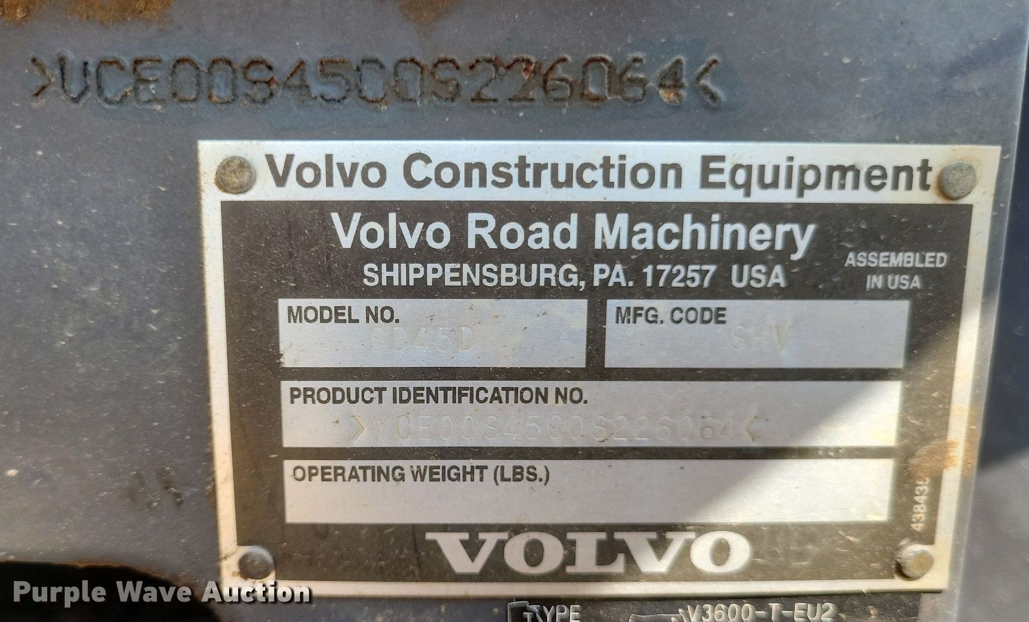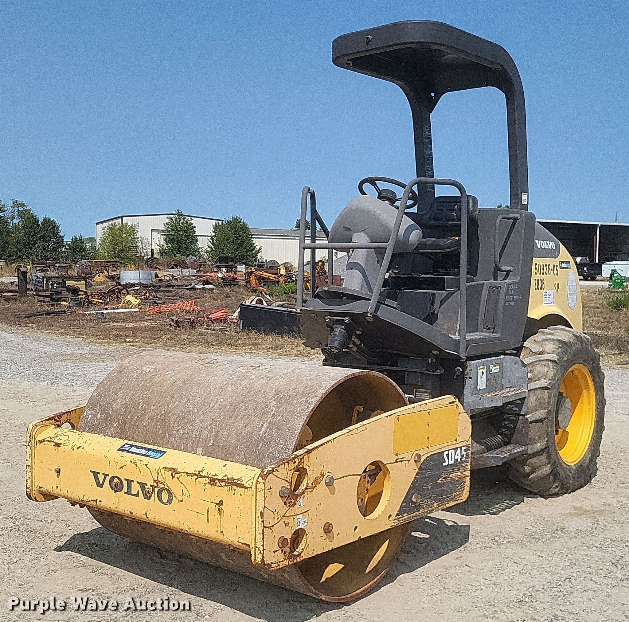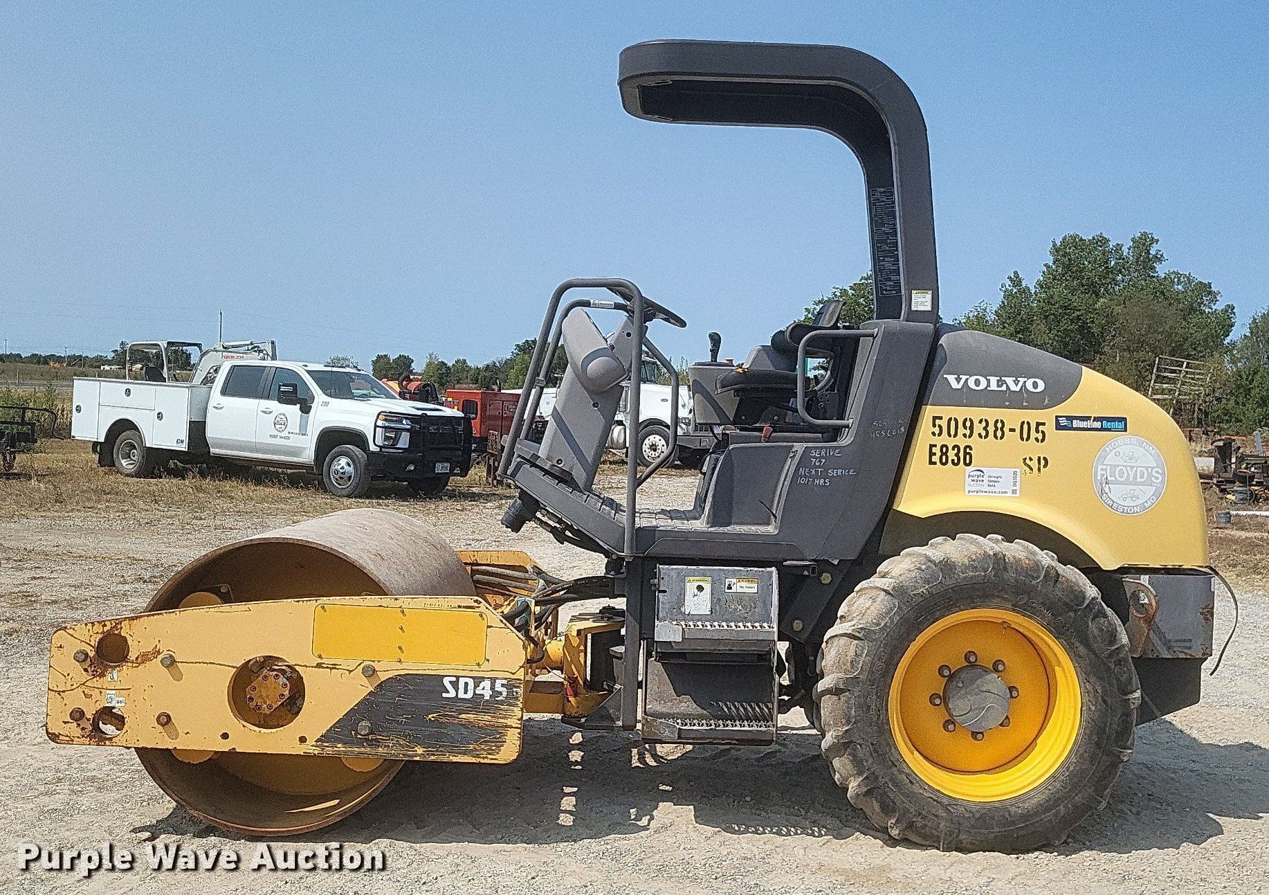 Purple Wave is selling a used Single Drum Roller Compactor in Missouri. This item is a 2011 Volvo SD45D single drum vibratory roller with the following: Hours: 860 on meter, Serial: VCE00S45C0S226064, Unit #: E836