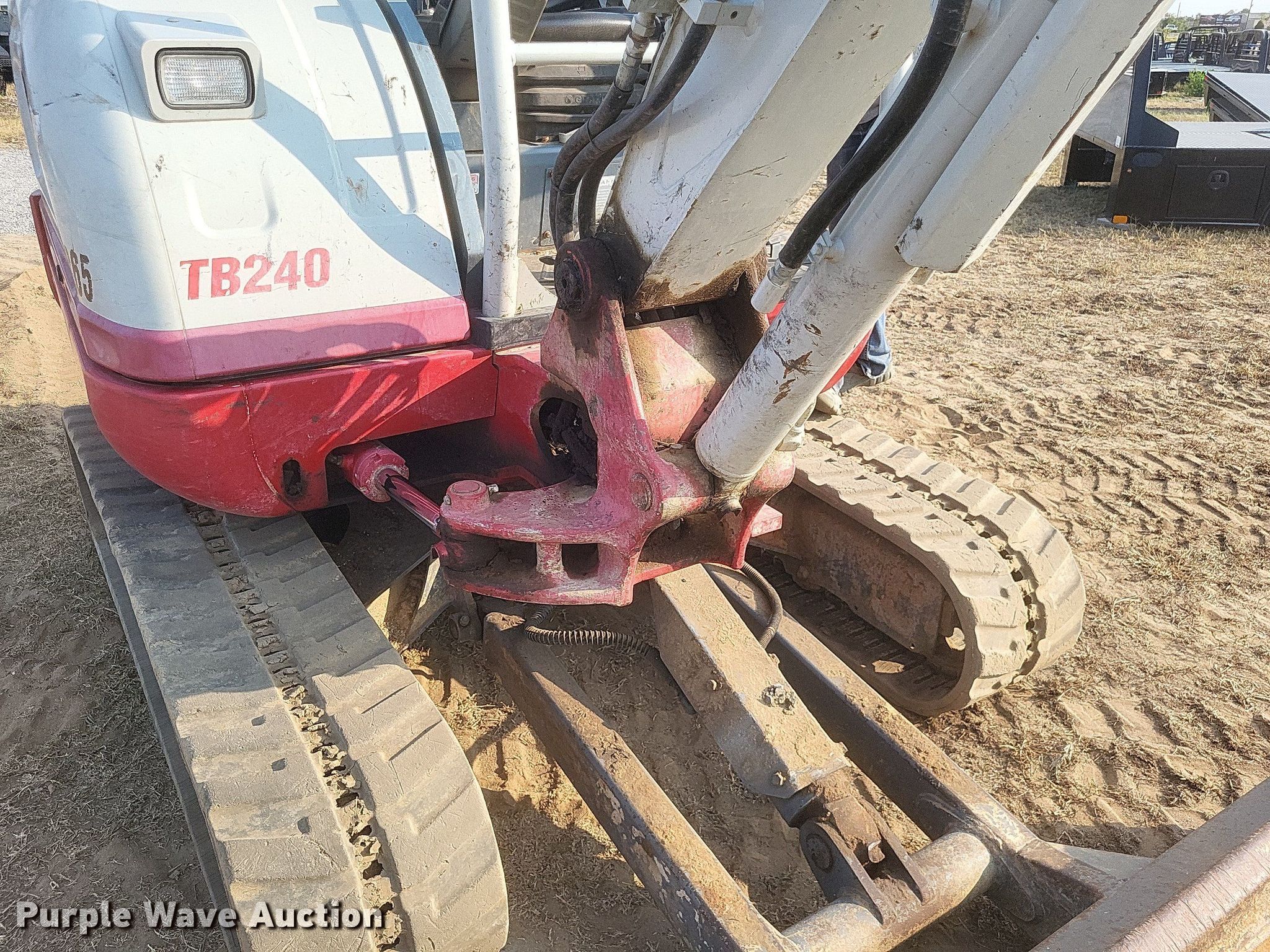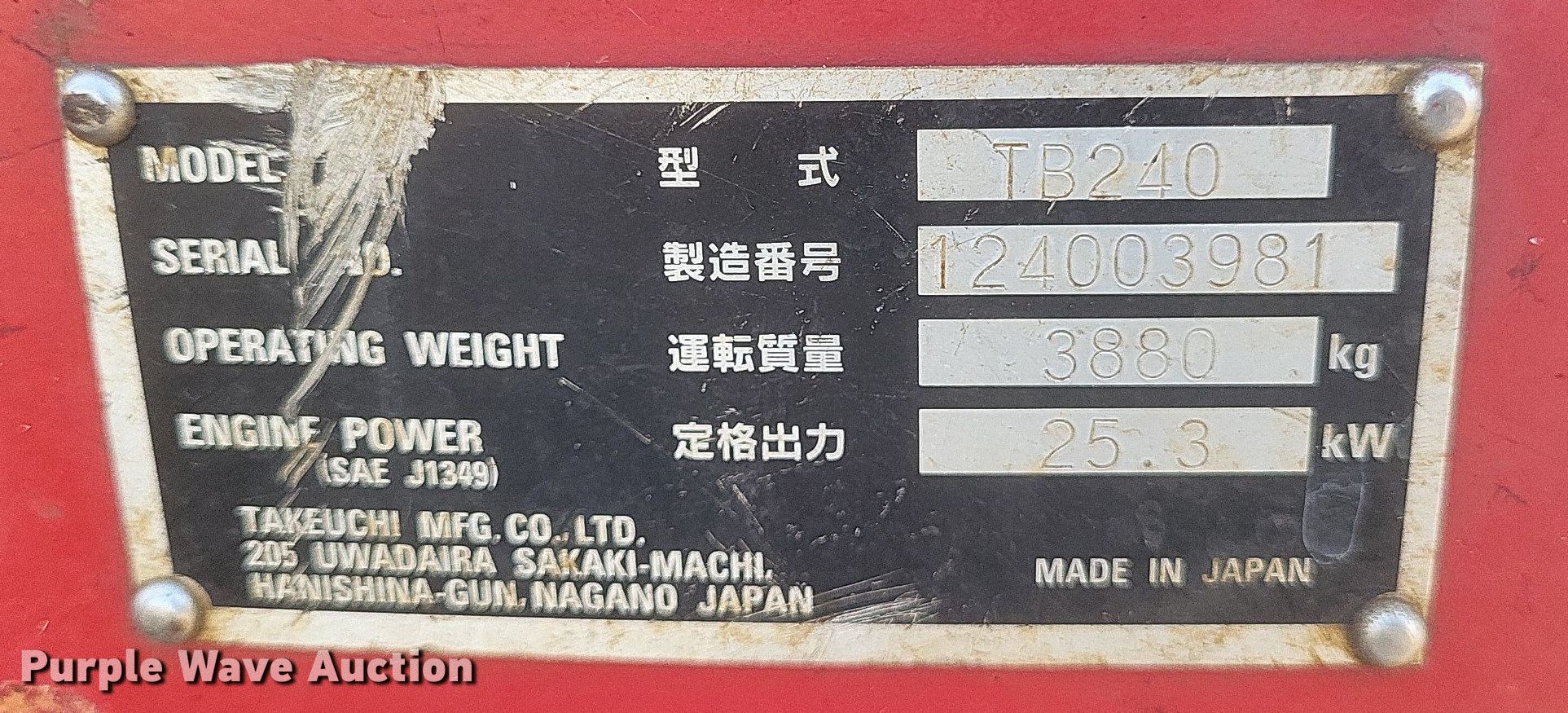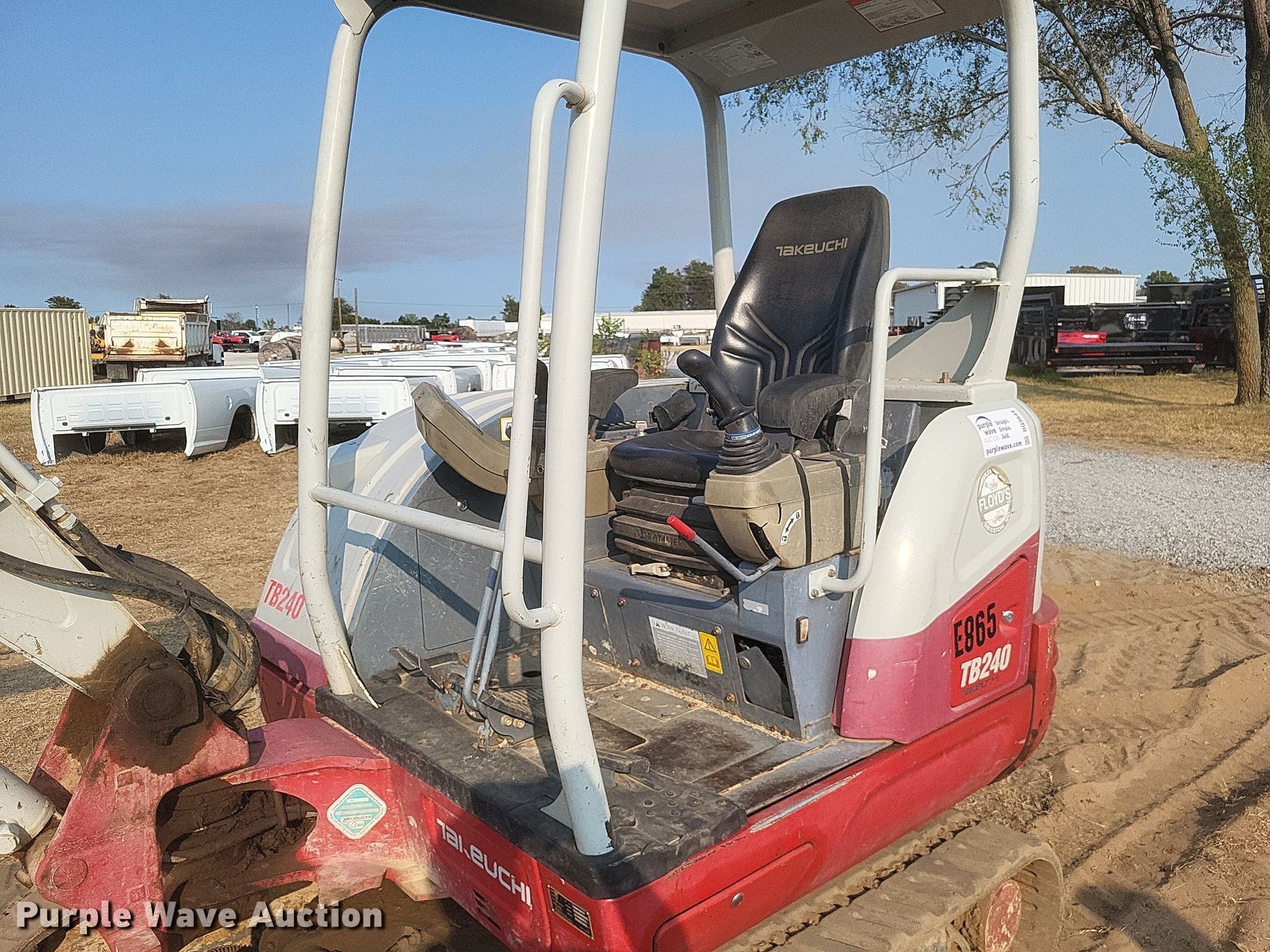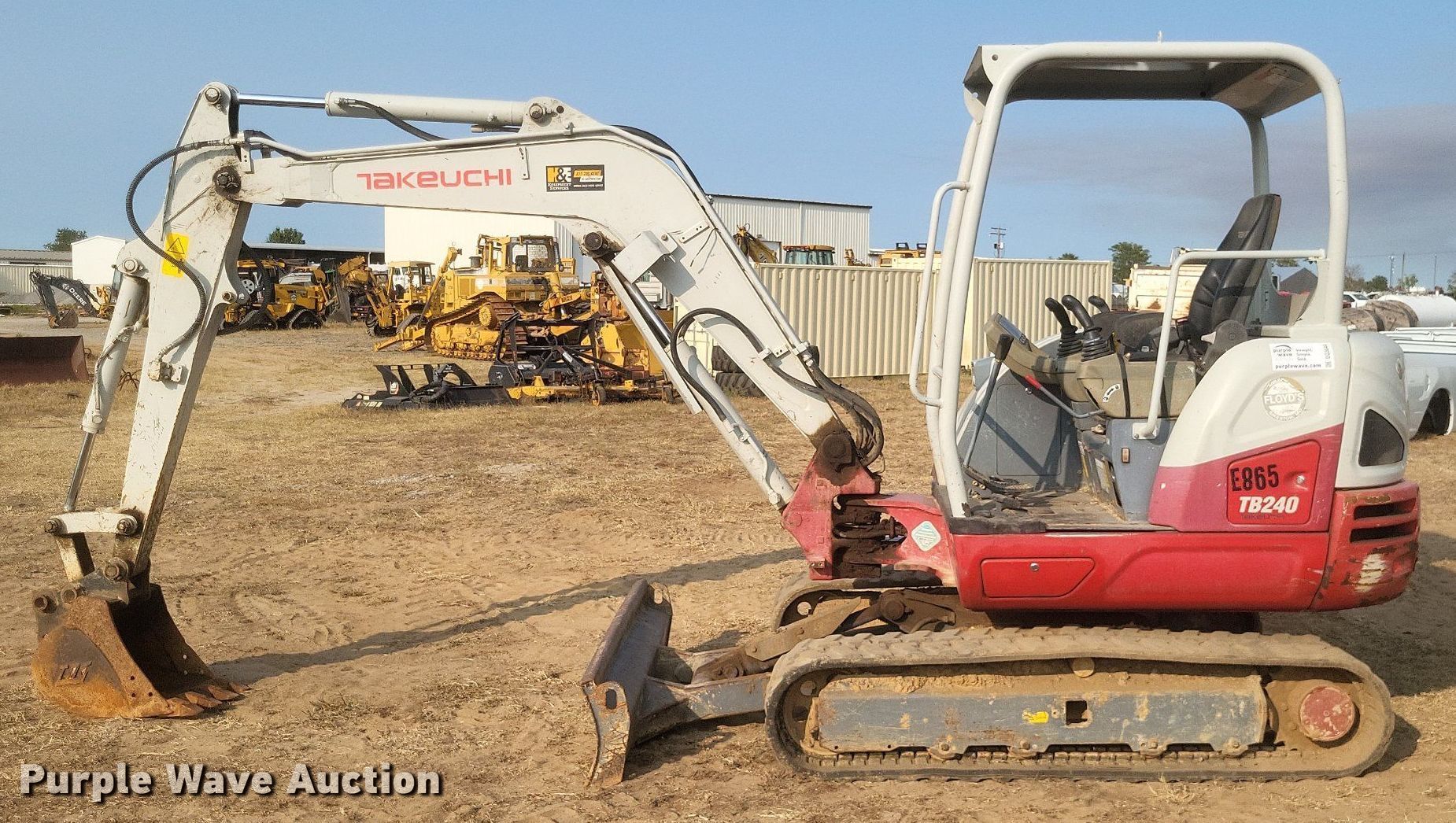 Purple Wave is selling a used Mini Excavator in Missouri. This item is a 2018 Takeuchi TB240 mini excavator with the following: Hours: 3,869 on meter, Serial: 124003981, Unit #: E865