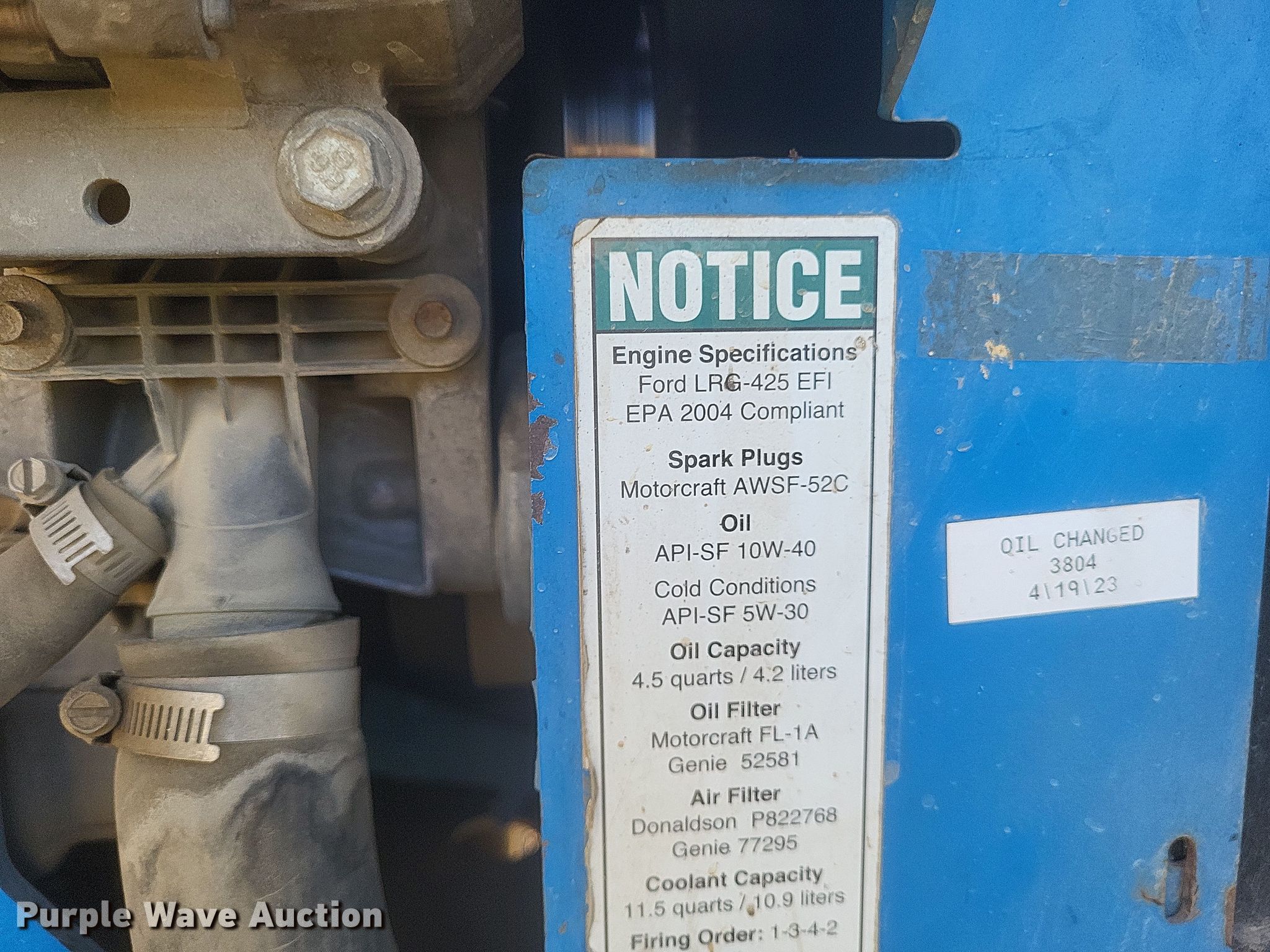 2006 Genie S40 boom lift. Hours: 4,109 on meter, Serial: S4006-9523, Unit #: BL62. Engine Ford LRG-425 EFI, Displacement: 2.5L, Cylinders: 4, Fuel type: LPG. Features Rough terrain, Boom type: Telescopic, Maximum lift capacity: 500 lbs, Maximum reach length: 31' 8", Maximum lift height: 40', Hydraulic leveling, Platform: 93" L x 34" W, AC power outlet, Controls: Platform, Ground, Platform rotation: Hydraulic. Tires Tire size: 33/16 LL500. Notes Transmission issues, will not go into high gear. Empower Rental Group. Memphis, TN 38107