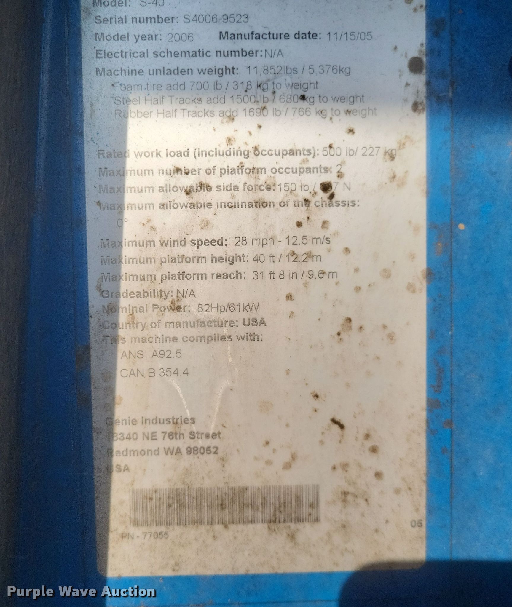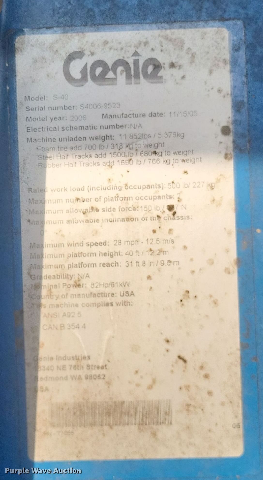 Purple Wave is selling a used Boom Lift in Tennessee. This item is a 2006 Genie S40 boom lift with the following: Hours: 4,109 on meter, Serial: S4006-9523, Unit #: BL62