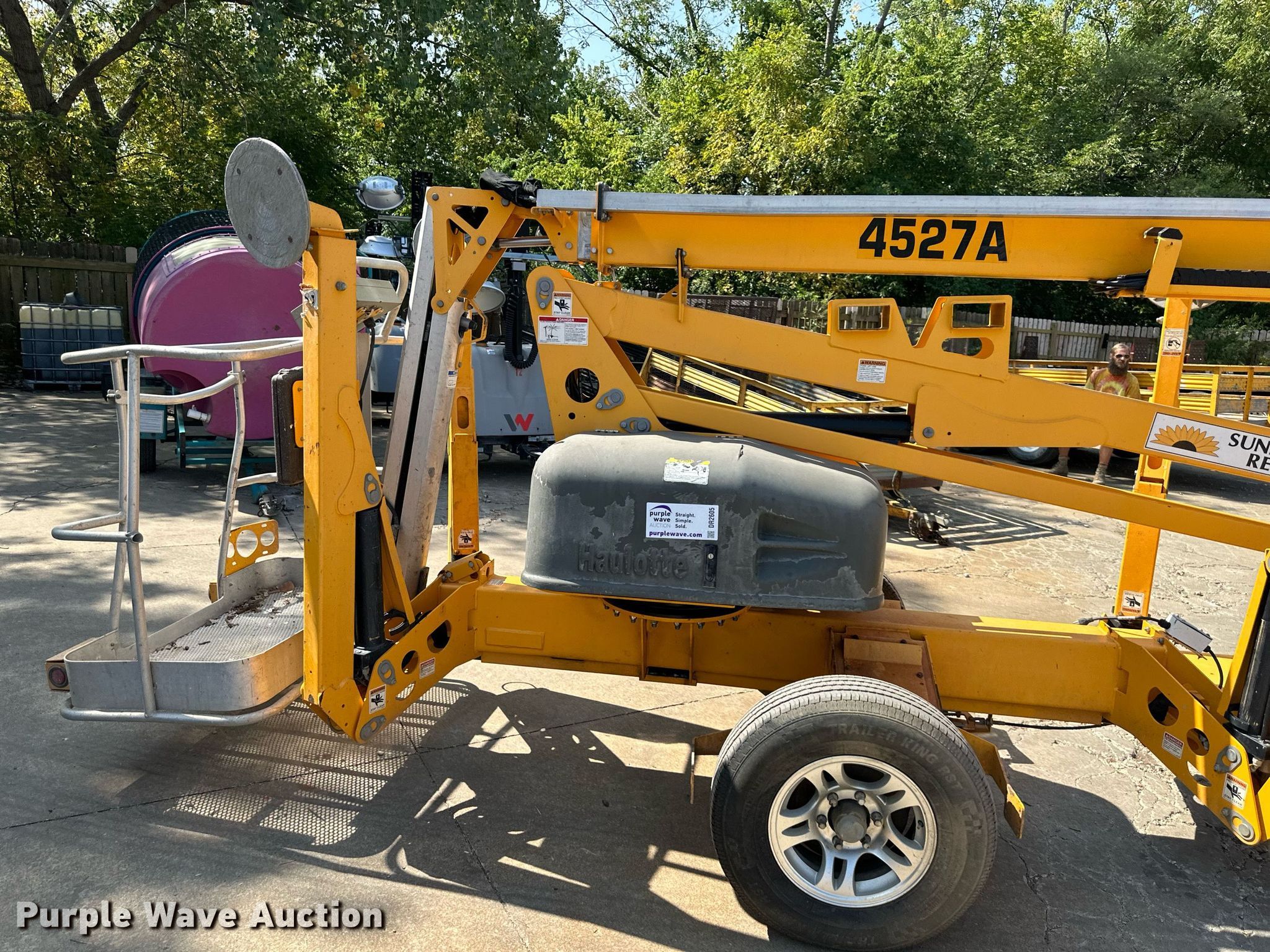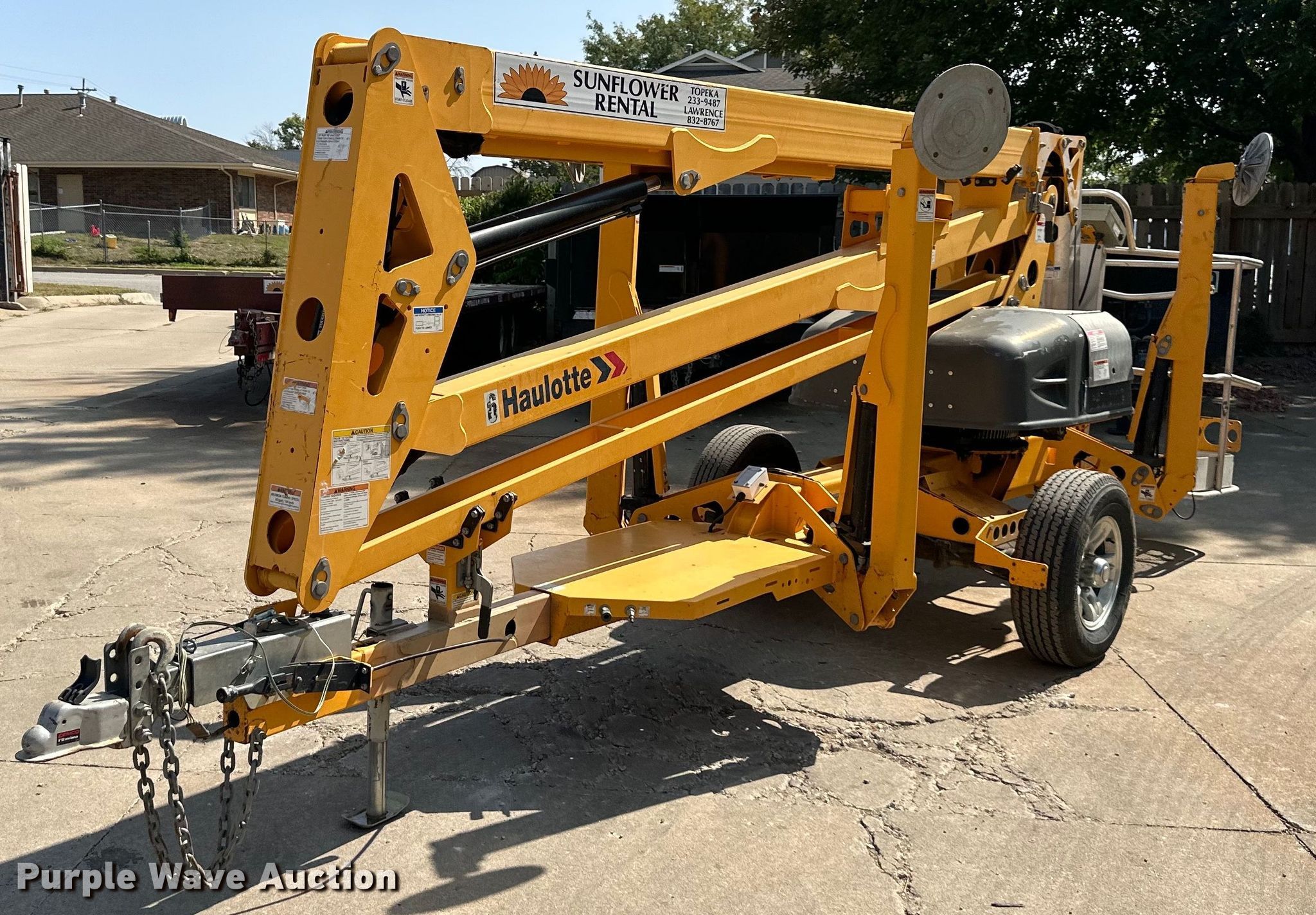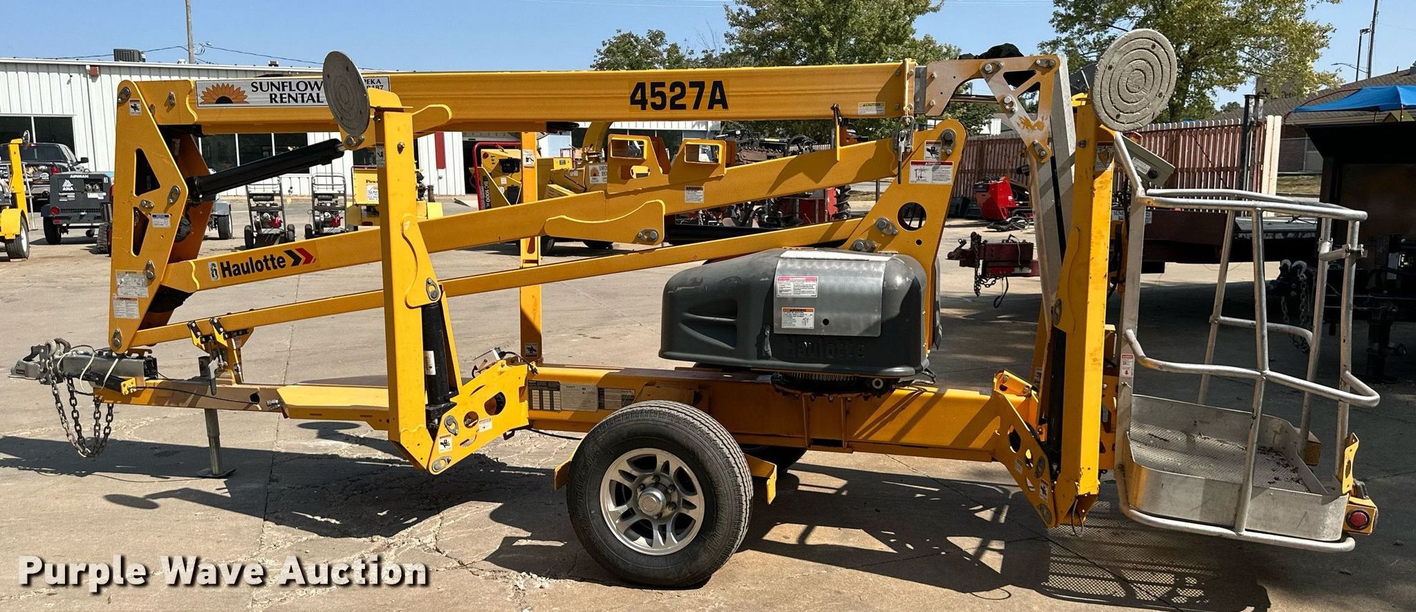 2017 Haulotte 4527A boom lift. Serial: 45A17-00113. Features Tow behind, Boom type: Articulating, Telescopic, Maximum reach length: 27', Maximum lift height: 45', Hydraulic outriggers, Hydraulic extendable jib, Hydraulic leveling, Platform: 46" L x 26" W, AC power outlet, Air outlet, Controls: Platform, Ground. Tires Tire size: 225/75R14. Sunflower Rental. Lawrence, KS 66049