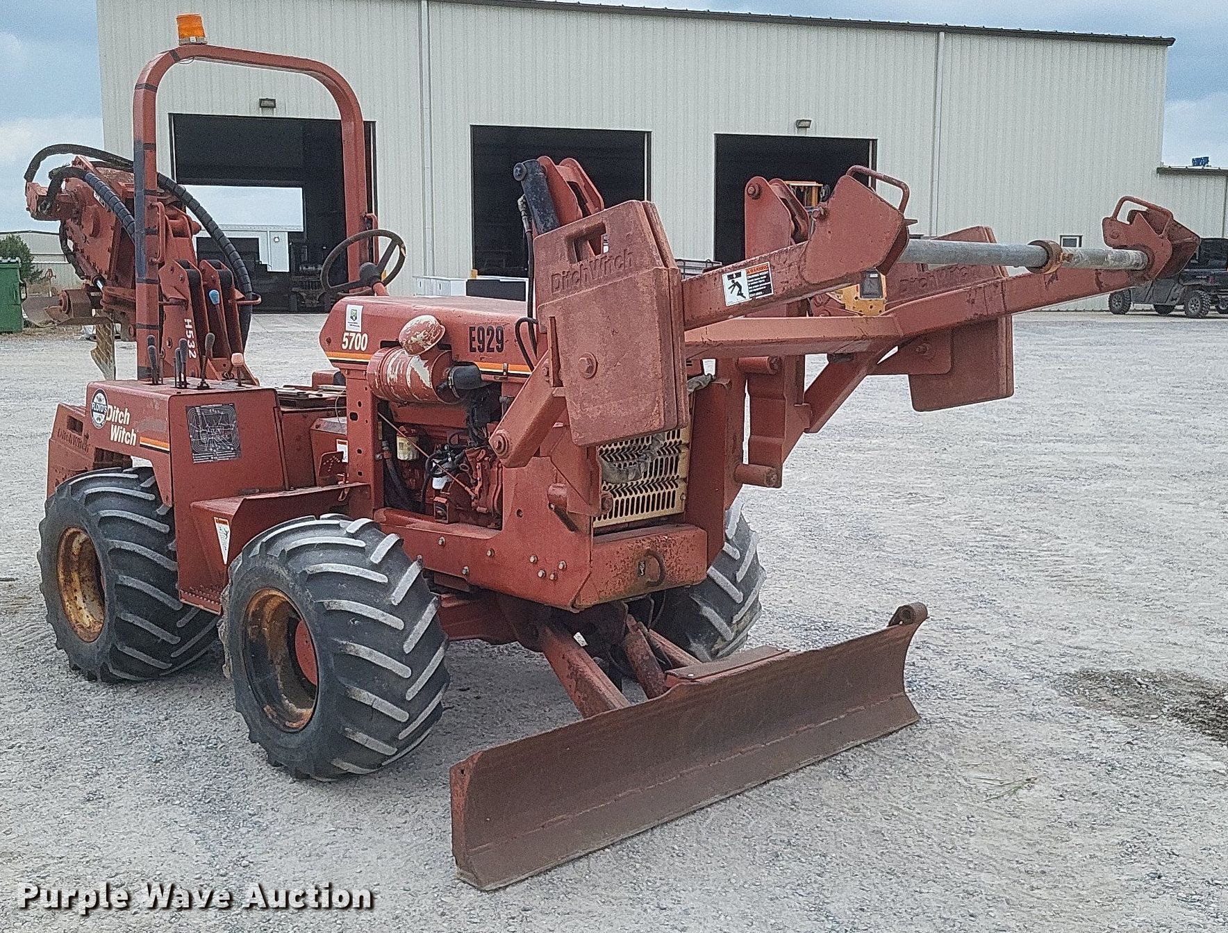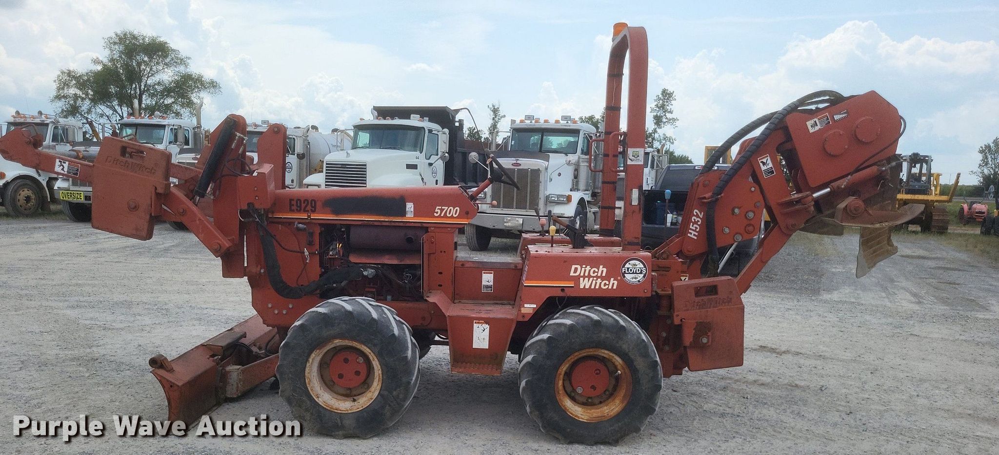 1999 Ditch Witch 5700 vibratory cable plow. Hours: 2,022 on meter, Serial: 3S0593, Unit #: E929. Engine Deutz, Cylinders: 4, Fuel type: Diesel. Transmission Hydrostatic, Four wheel drive, Four wheel steer. Operators station OROPS. Features Vibratory plow Model: 532, Serial: 850407, Depth: 15", Reel carrier Model: RL CR57, Serial: 6V0006, Maximum reel width: 44", Backfill blade Width: 72". Tires Size: 31x15.50-15. Notes Seat will be attached prior to auction. Floyd's Inc. - Open Inspection Tuesday, October 15 from 8:00 A.M. to 4:30 P.M.. 225 N Interstate Dr. Sikeston, MO 63801