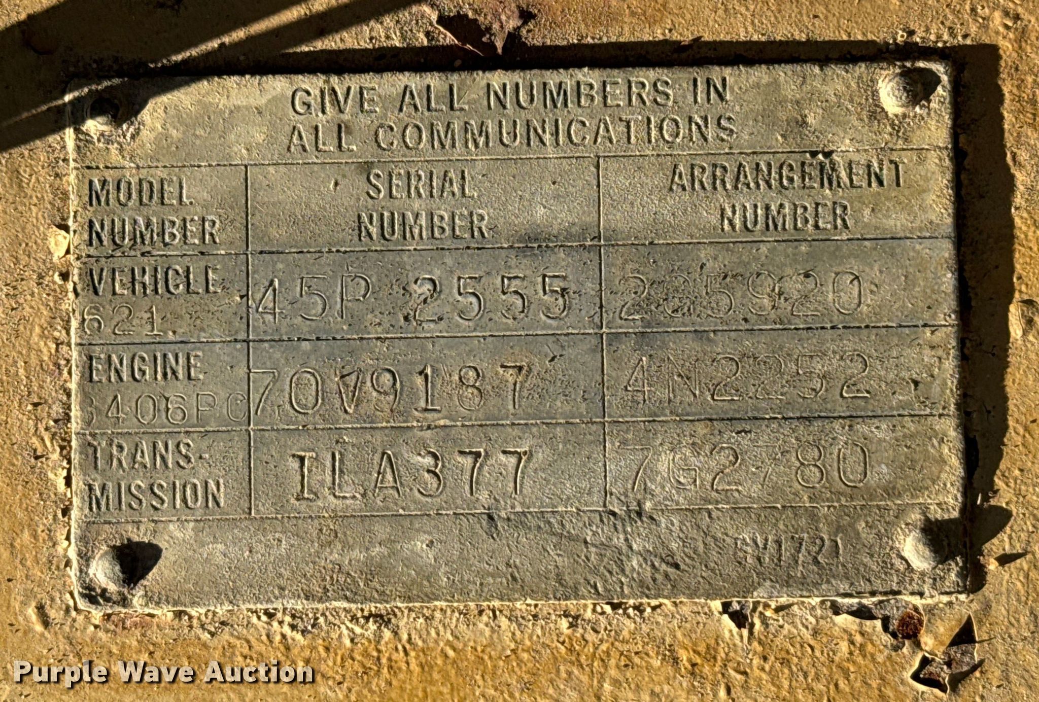 1980 Caterpillar 621B water wagon. Hours: 7,234 on meter, Serial: 45P2555. Engine Caterpillar 3406PC, Serial: 70V9187, Displacement: 14.6L, Cylinders: 6, Fuel type: Diesel, HP: 330. Transmission Powershift, 8F - 1R. Chassis Differential lock. Interior AC, Heat. Features Water tank Magnum MSO8, Capacity: 8,000 gallons, Spray bar: Front, Rear, Hose reel, In-cab spray controls. Tires Size: 29.5-35. Notes Windshield chipped or cracked, Door missing. Wagnercorp. Craig, CO 81625