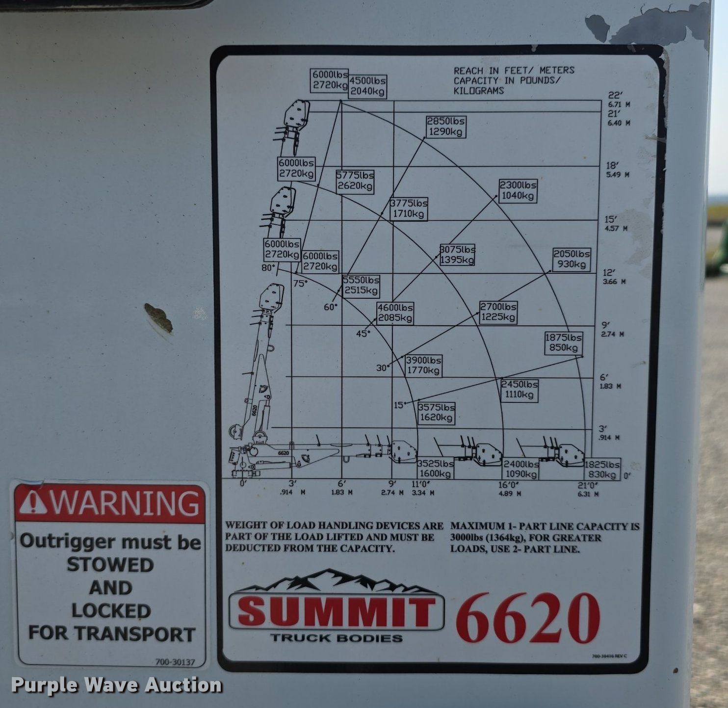 2018 Dodge Ram 5500HD utility / service truck. Miles: 108,633 on odometer, VIN: 3C7WRNBL6JG359969. Engine Cummins, Displacement: 6.7L, Cylinders: 6, Fuel type: Diesel. Transmission Automatic. Chassis Four wheel drive, Axles: Single, Suspension: Spring, Brakes: Hydraulic, PTO, GVWR: 19,500 lbs, Wheelbase: 170". Interior AC, Heat, Heated mirrors, Power windows, Power locks, Cruise control, Auxiliary controls, Brake controller, Backup camera. Features Bed Summit Truck Bodies, 13' 6" L x 94" W, Torch bottle rack, Air compressor Vanair Reliant RC40, Hours: 56 on meter, Crane Summit Truck Bodies 6620, Maximum boom length: 20', Maximum lift capacity: 6,000 lbs. Tires Size: 225/70R19.5. Kansas title. Title distribution may be delayed up to 14 days from verification of funds. AVE-PLP Inc. Council Bluffs, IA 51503