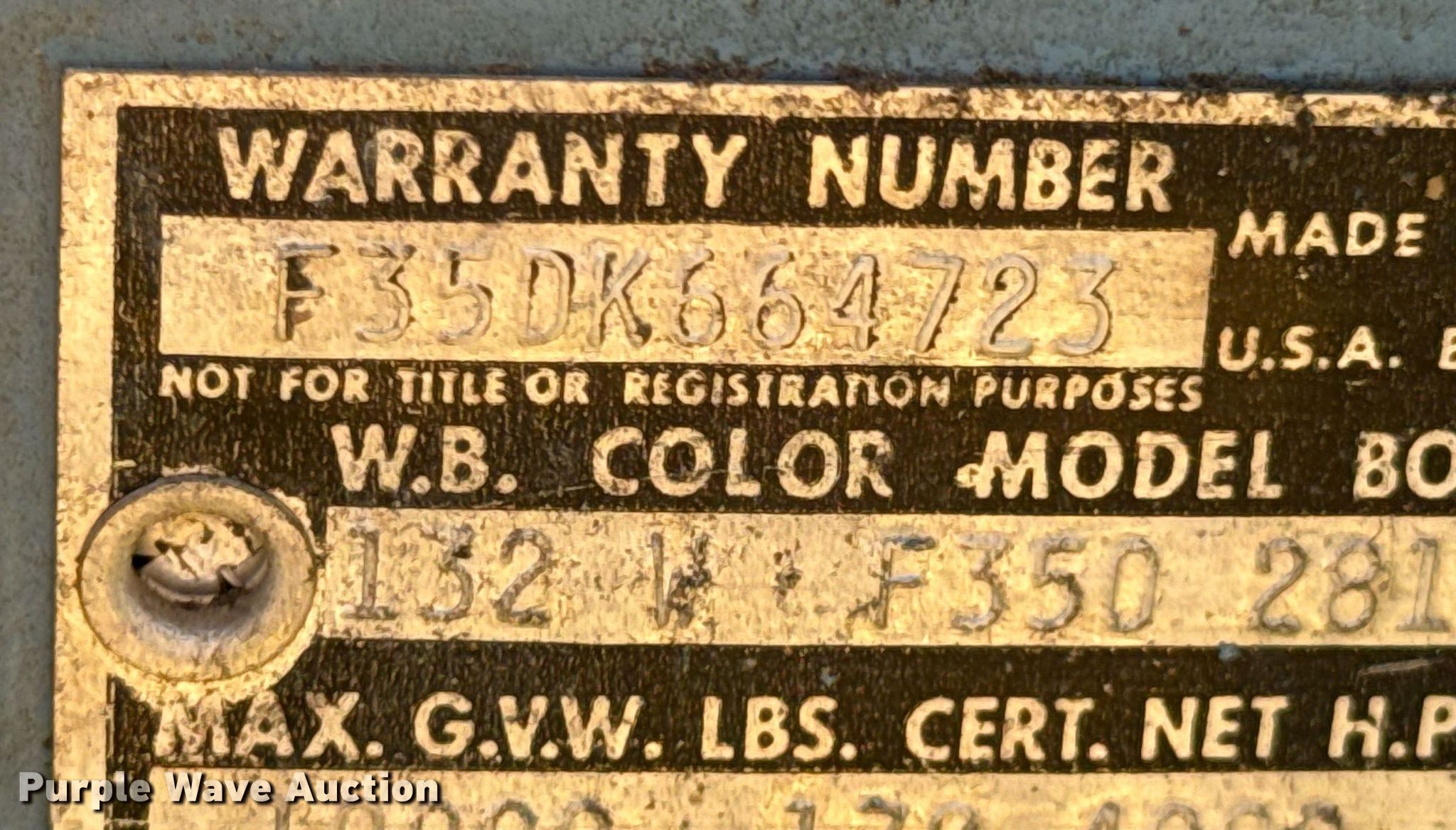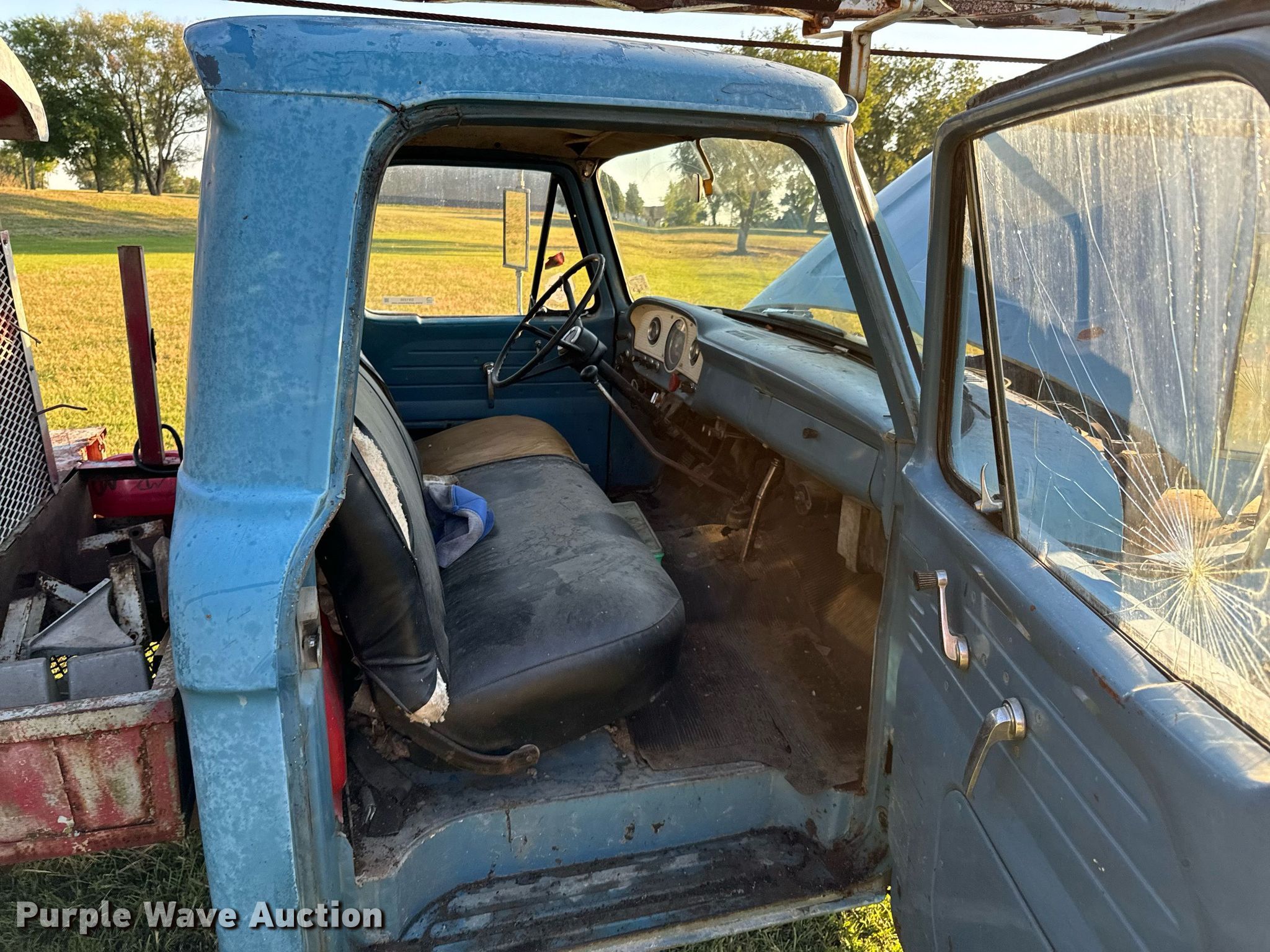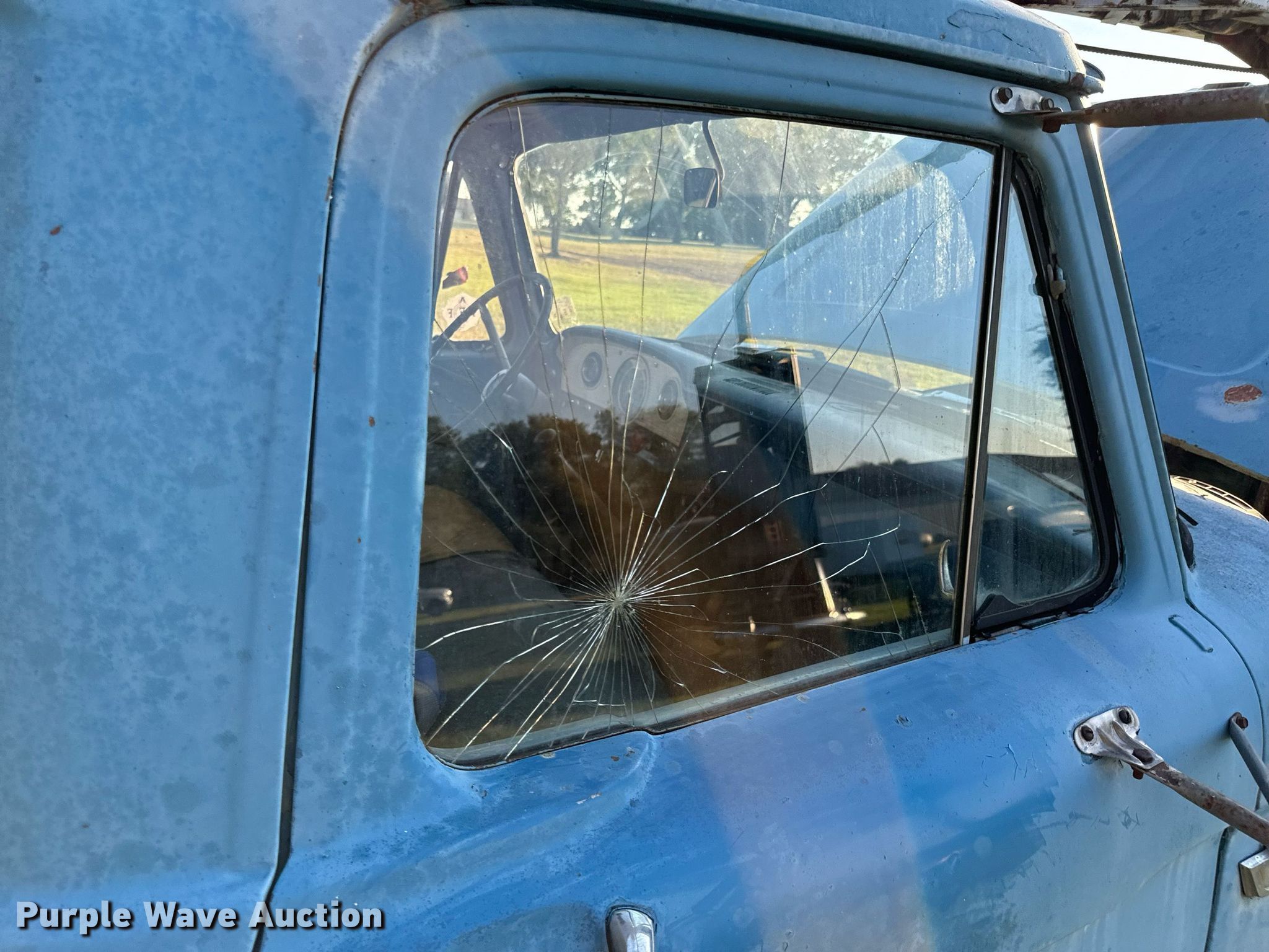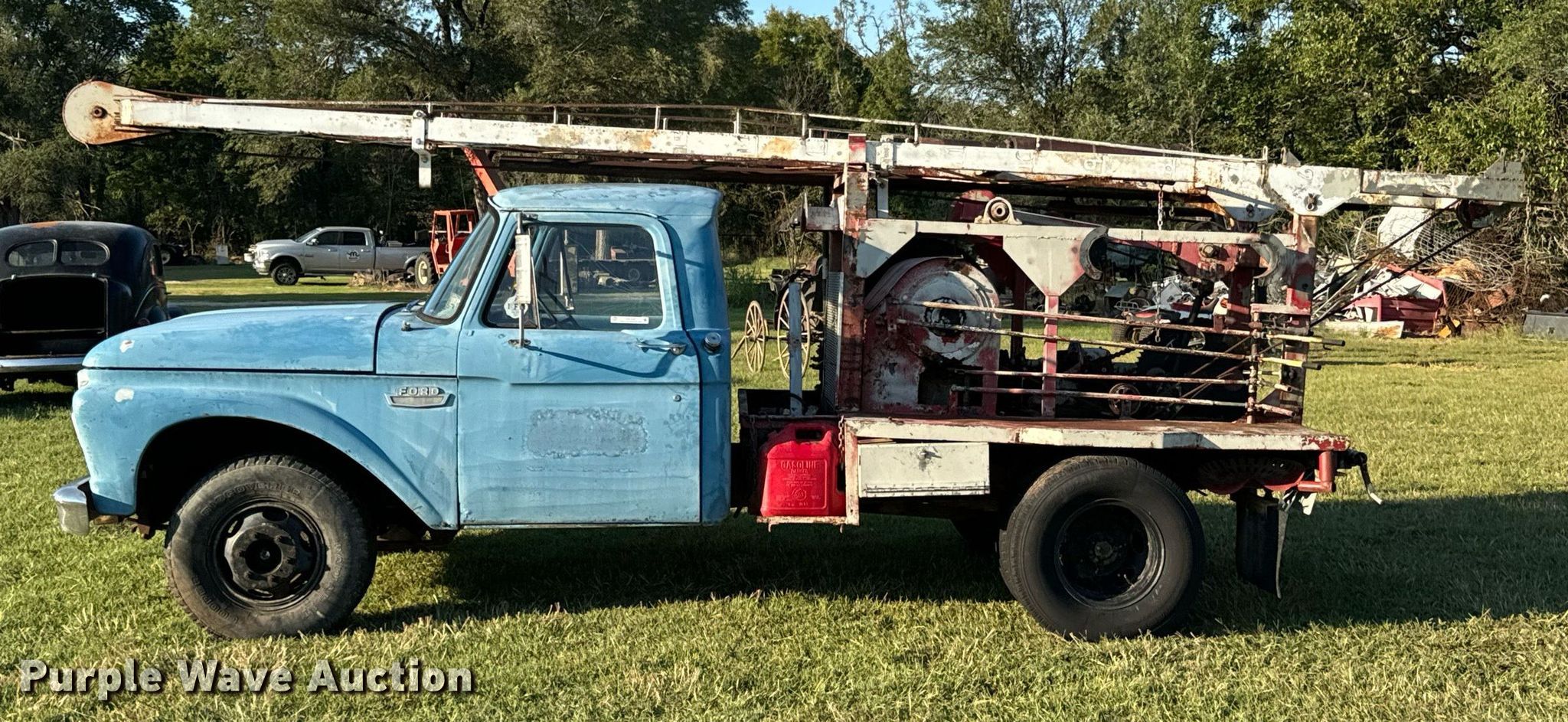 1965 Ford F350 post driver pickup truck. Miles: 18,470 on odometer Actual mileage unknown, VIN: F35DK664723. Engine Cylinders: 8, Fuel type: Gas. Transmission Manual, Speed: 4. Interior Heat. Features Post driver bed 6' 8" L x 78" W, Driver frame height: 23', Pipe capacity: 13', Bed controls. Tires Size: LT235/85R16. Notes Driver window cracked, Possible fuel contamination, tank needs cleaned. Transfer of ownership documentation will be an Kansas antique bill of sale TR-312. This form is the only ownership documentation that will be provided and is sufficient for an Kansas buyer to apply for an Kansas title. Bidders are responsible for verifying if this is sufficient to obtain title in their jurisdiction prior to bidding. Bill of Sale distribution may be delayed up to 14 days from verification of funds. Fredonia, KS 66736