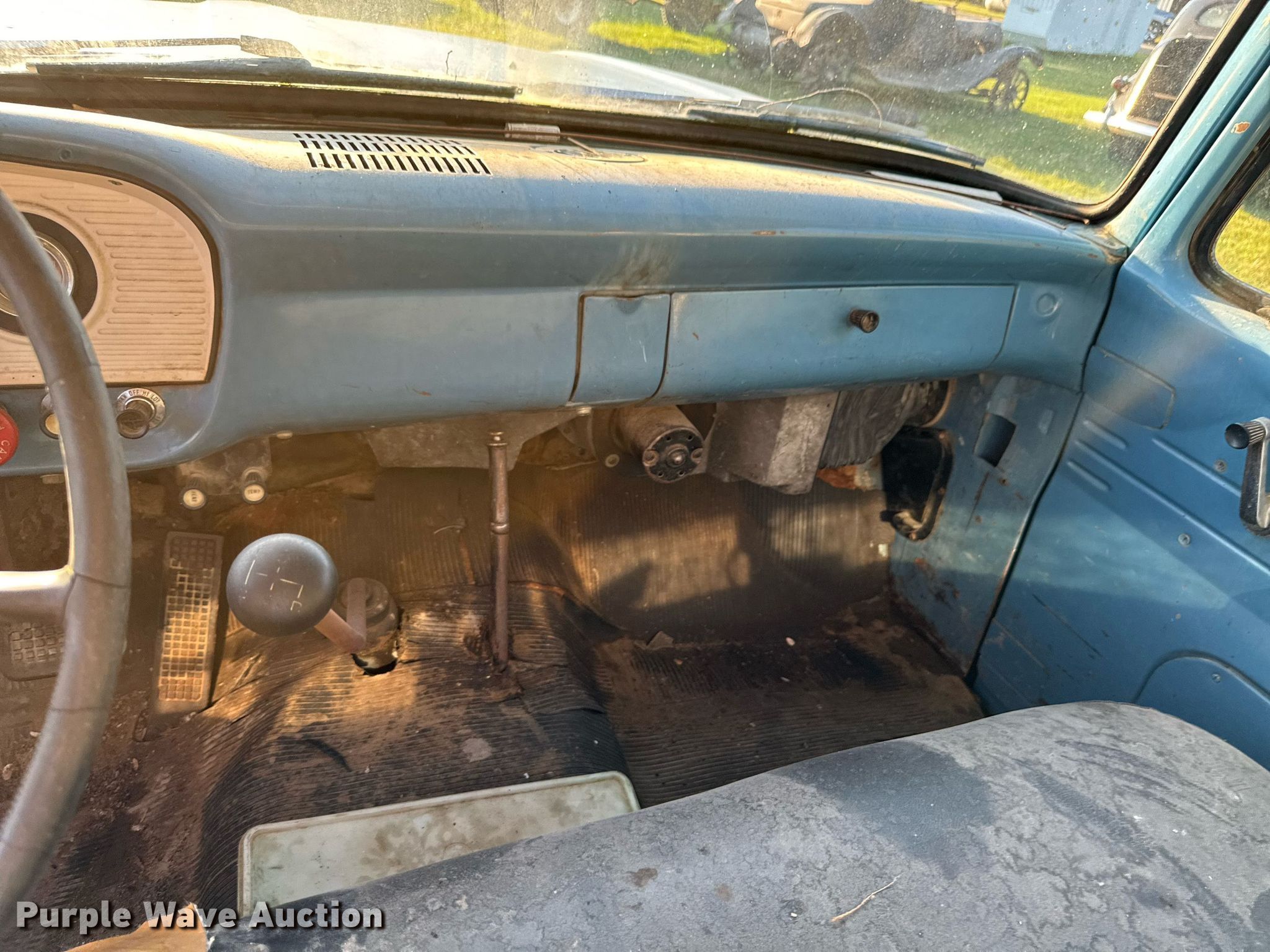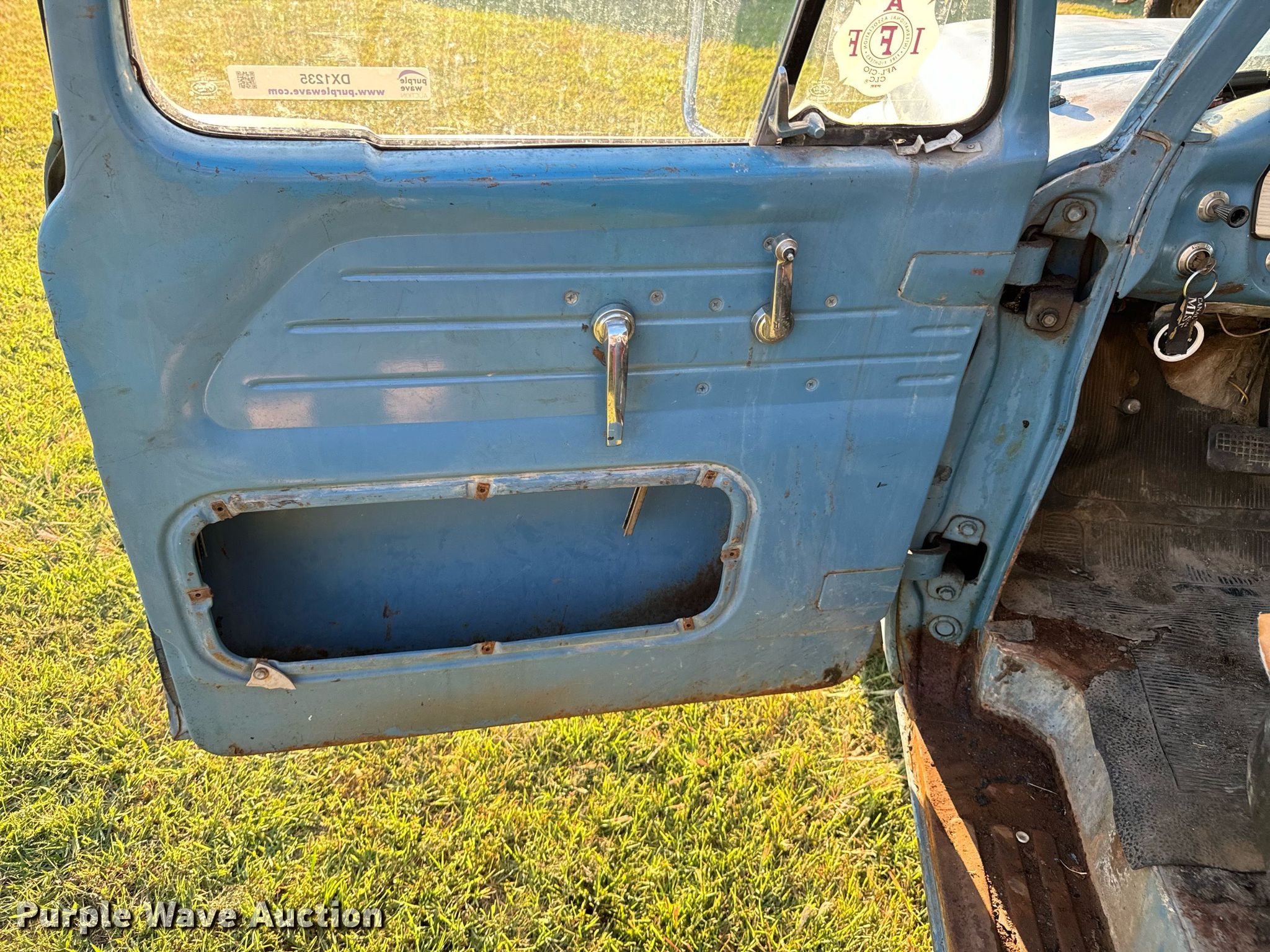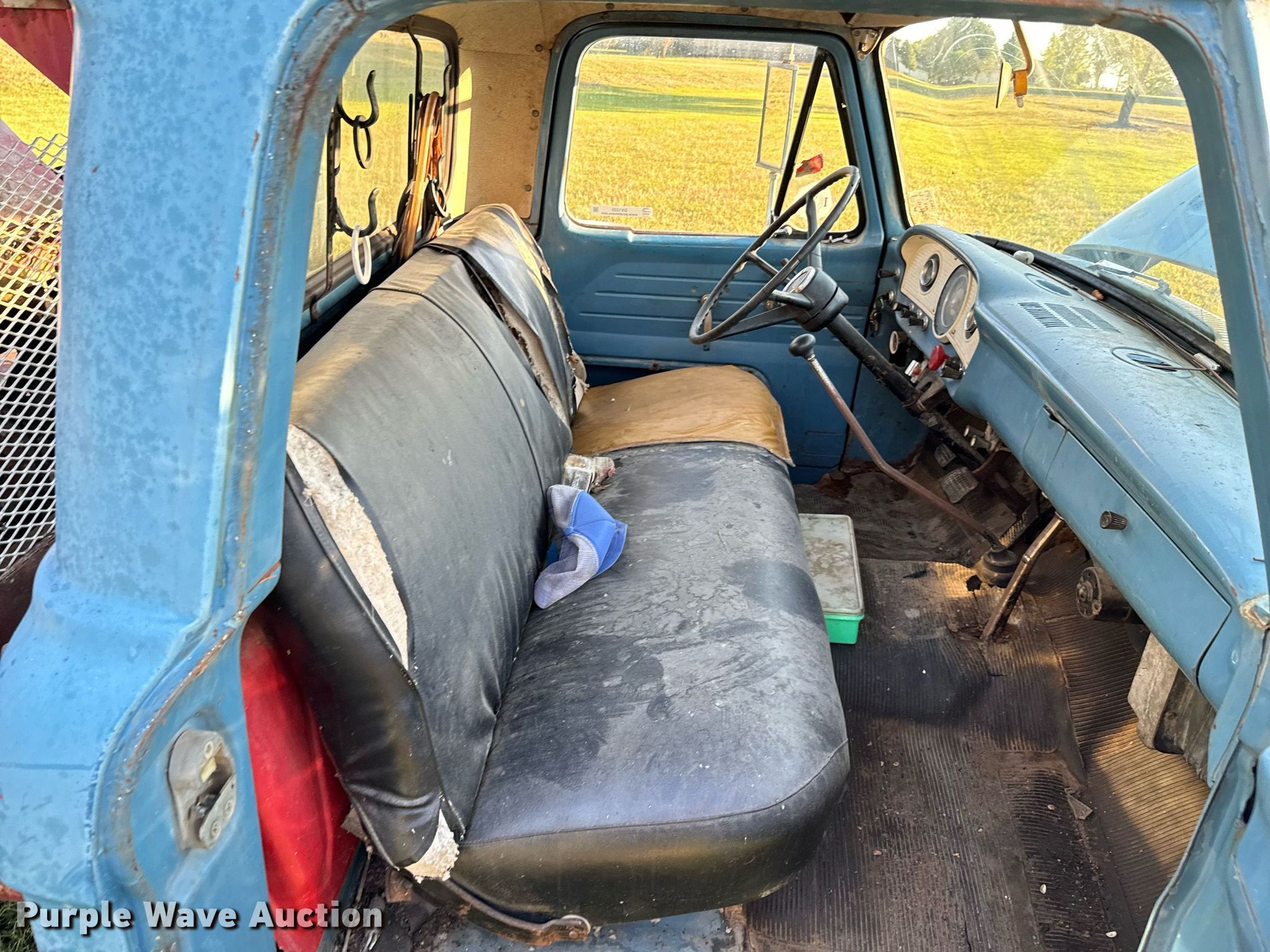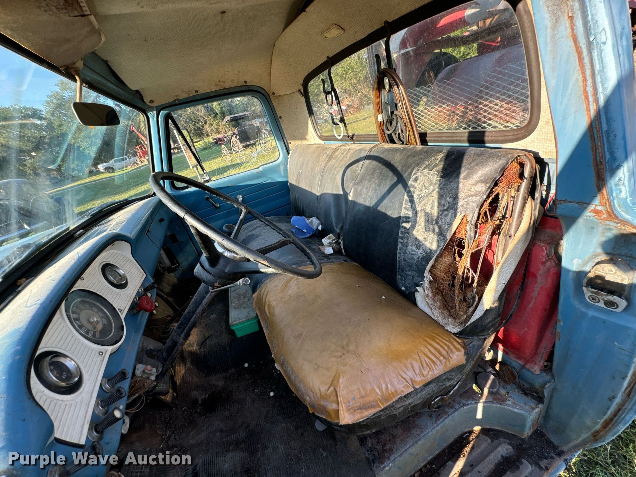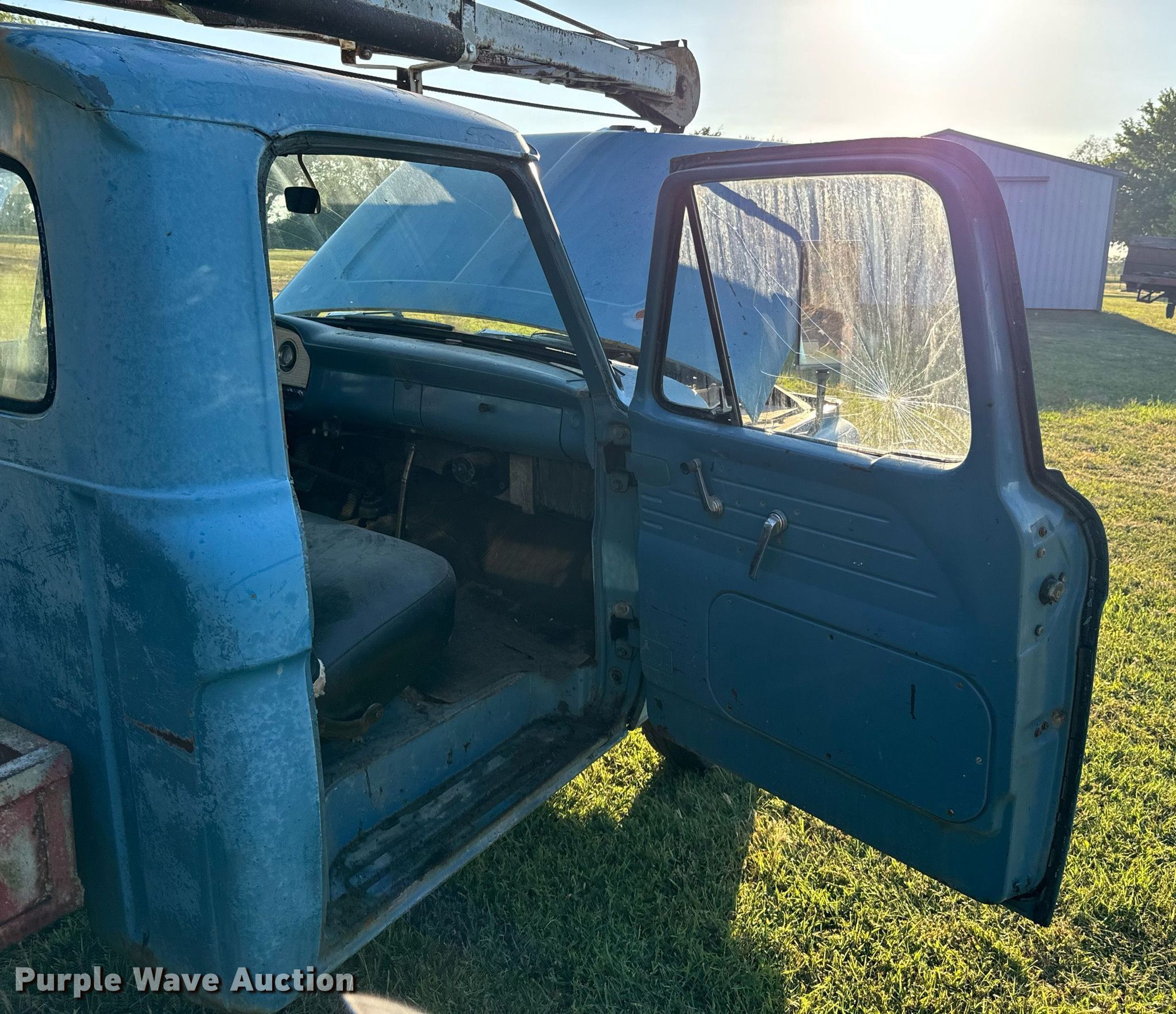 1965 Ford F350 post driver pickup truck. Miles: 18,470 on odometer Actual mileage unknown, VIN: F35DK664723. Engine Cylinders: 8, Fuel type: Gas. Transmission Manual, Speed: 4. Interior Heat. Features Post driver bed 6' 8" L x 78" W, Driver frame height: 23', Pipe capacity: 13', Bed controls. Tires Size: LT235/85R16. Notes Driver window cracked, Possible fuel contamination, tank needs cleaned. Transfer of ownership documentation will be an Kansas antique bill of sale TR-312. This form is the only ownership documentation that will be provided and is sufficient for an Kansas buyer to apply for an Kansas title. Bidders are responsible for verifying if this is sufficient to obtain title in their jurisdiction prior to bidding. Bill of Sale distribution may be delayed up to 14 days from verification of funds. Fredonia, KS 66736