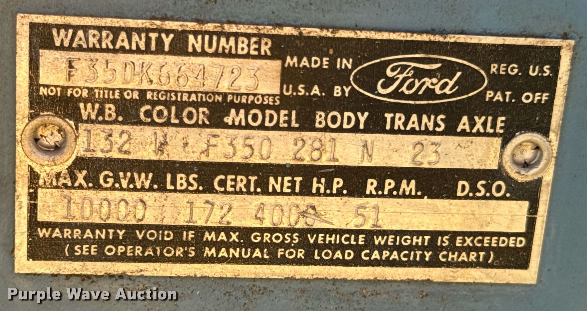 Purple Wave is selling a used 3/4 or 1 Ton Pickup or Van in Kansas. This item is a 1965 Ford F350 post driver pickup truck with the following: Miles: 18,470 on odometer, Actual mileage unknown, VIN: F35DK664723
