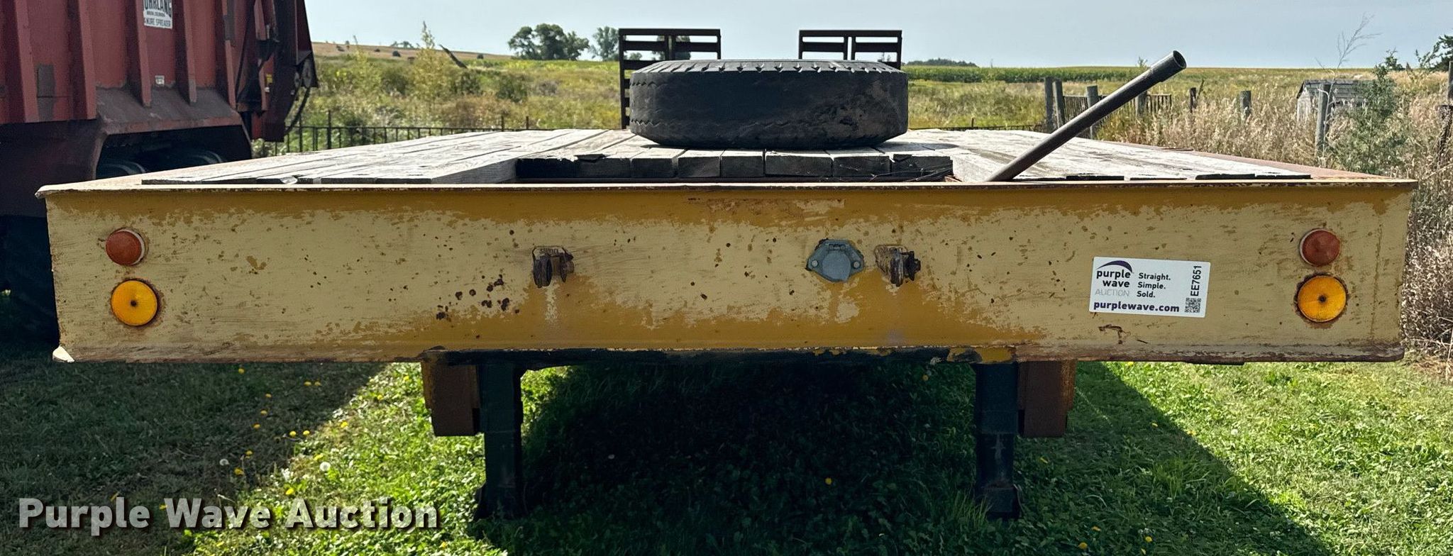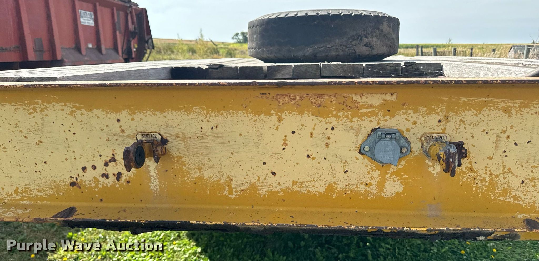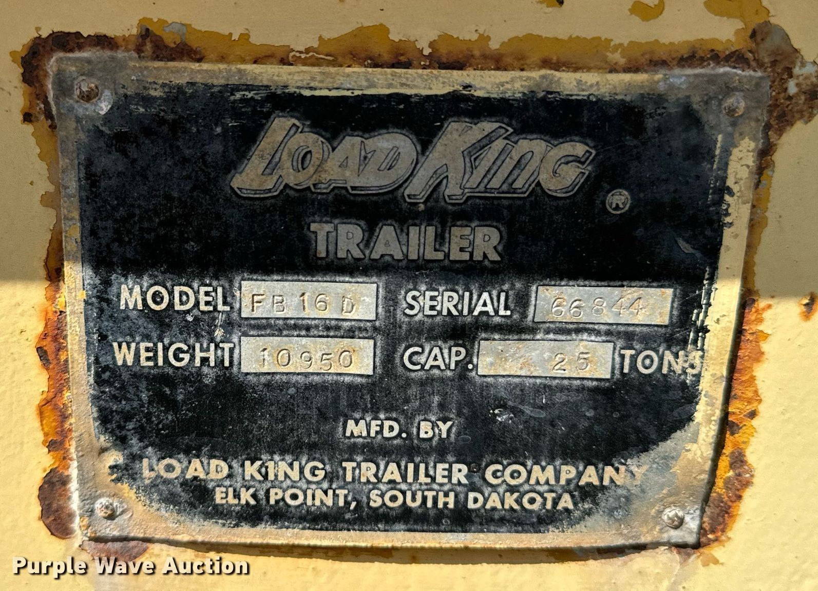 1966 Load King FB16D drop deck equipment trailer. VIN: 66844. Dimensions Overall: 35' L x 120" W, Deck: 26', Top deck length: 9', Ramps: Manual Length: 5'. Features Deck type: Wood, Outriggers: Swing-out Board size: 12". Chassis Landing gear: Dual, Suspension: Walking beam, Brakes: Air, Axles: Tandem. Tires Steel wheels, Size: 8.25R15. Nebraska electronic title. Title has a lien that will be released following the close of the auction. A paper title will be printed once the lien is released. Title distribution may be delayed up to 45 days from verification of funds. Ainsworth, NE 69210