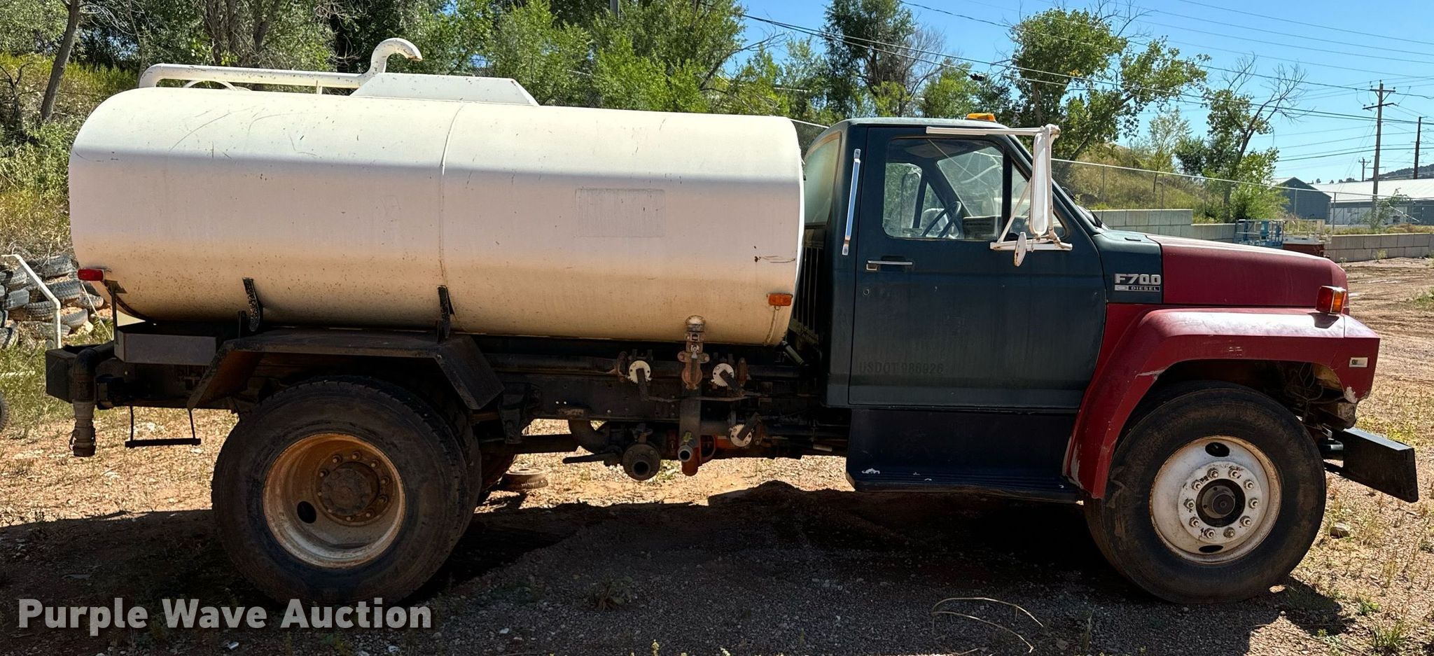 Purple Wave is selling a used Tank Truck or Water Truck in South Dakota. This item is a 1992 Ford F700 water truck with the following: Miles: 52,221 on odometer, Hours: 8,971 on meter, VIN: 1FDPK74P9NVA26224