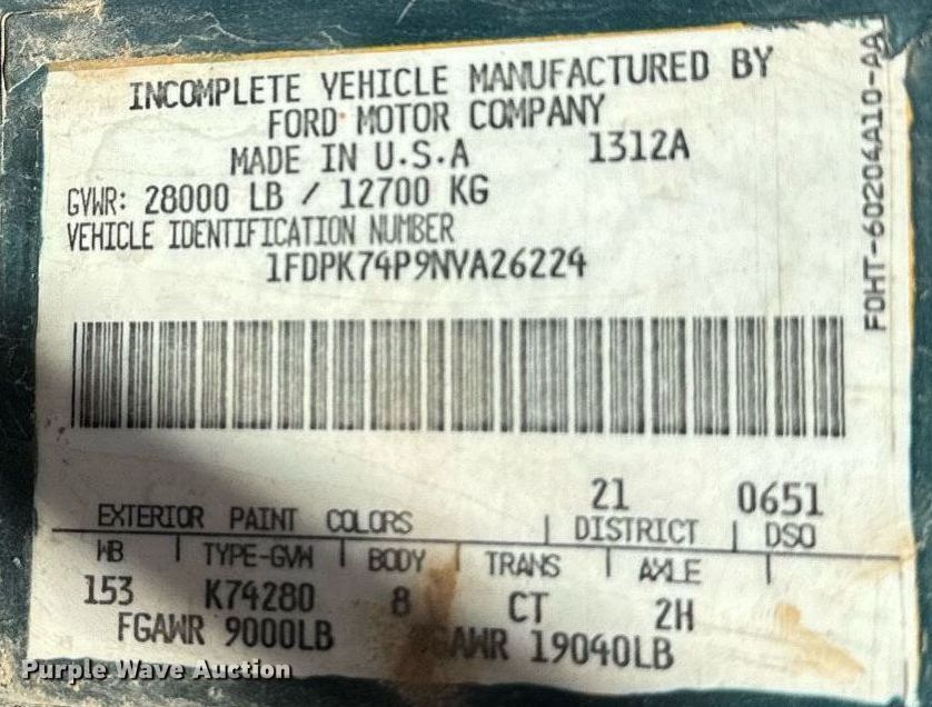 - VIN: 1FDPK74P9NVA26224