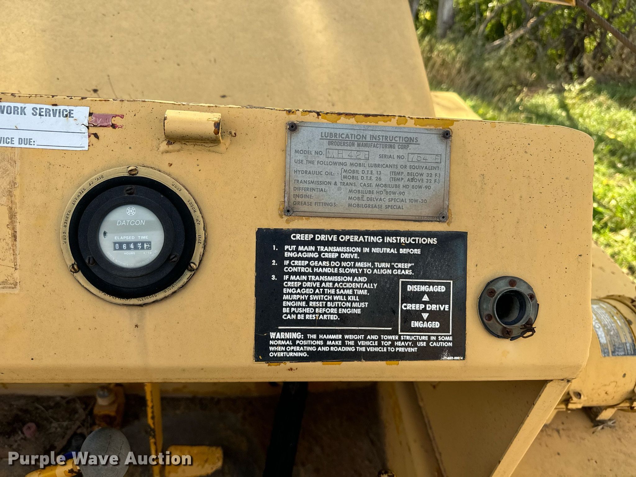 Broderson MH42B drop hammer. Serial: 754B. Engine Cylinders: 4, Fuel type: Diesel. Transmission Manual, Speed: 4. Features Mast height: 12', Side shift. Tires Size: 7.50-16LT. Notes Dead battery, Unknown operating condition. Site Work Specialists. Rapid City, SD 57702