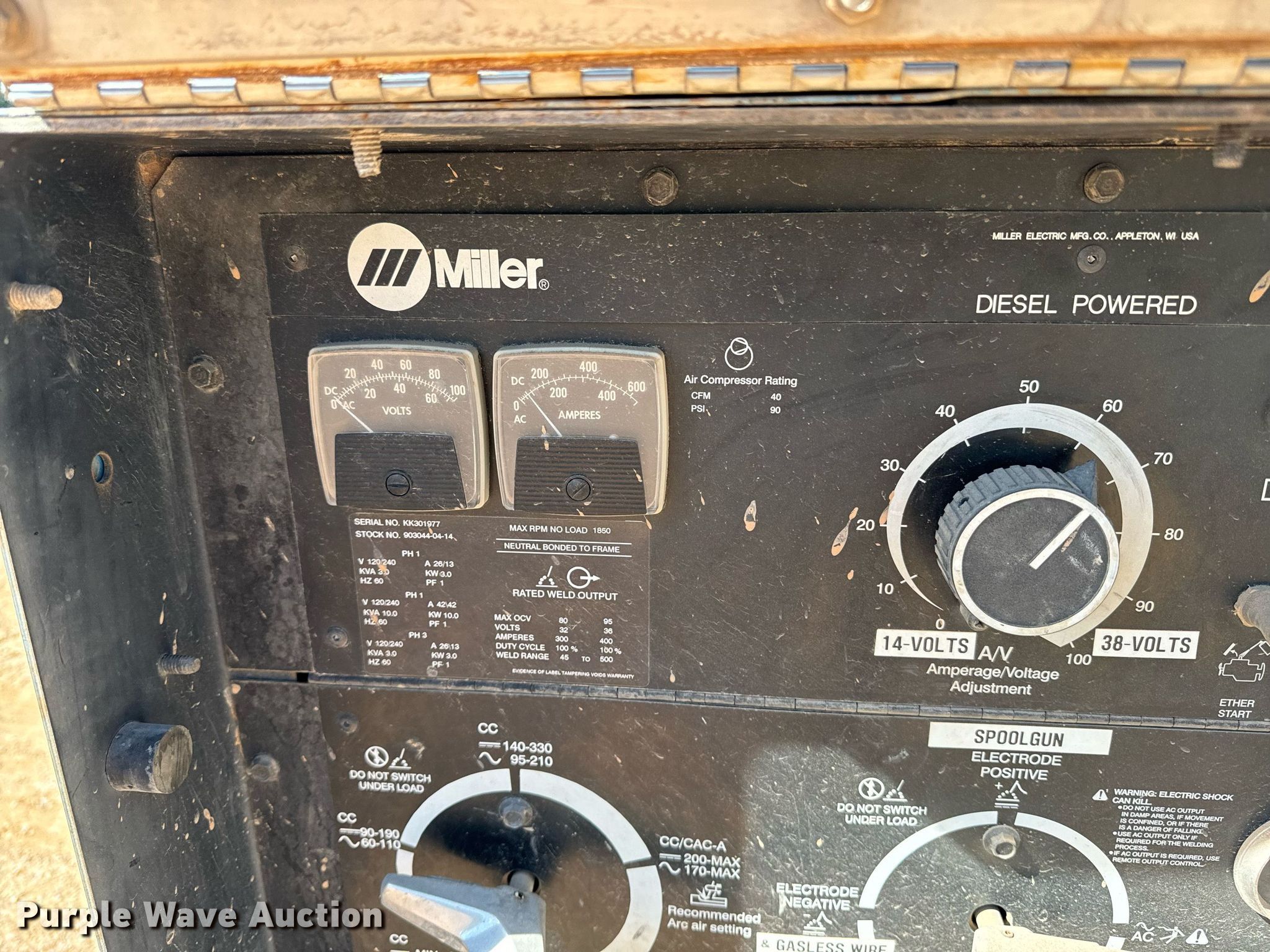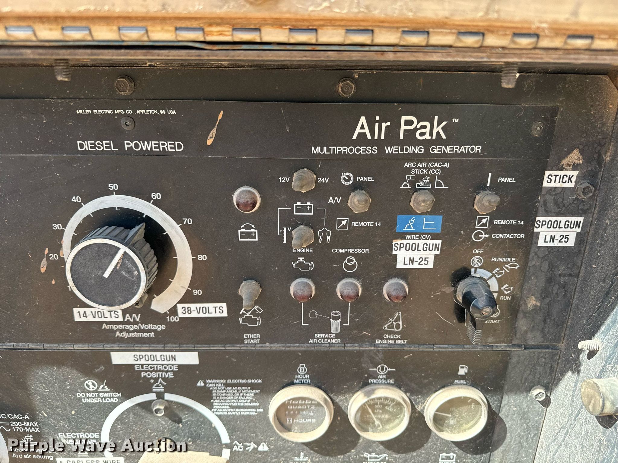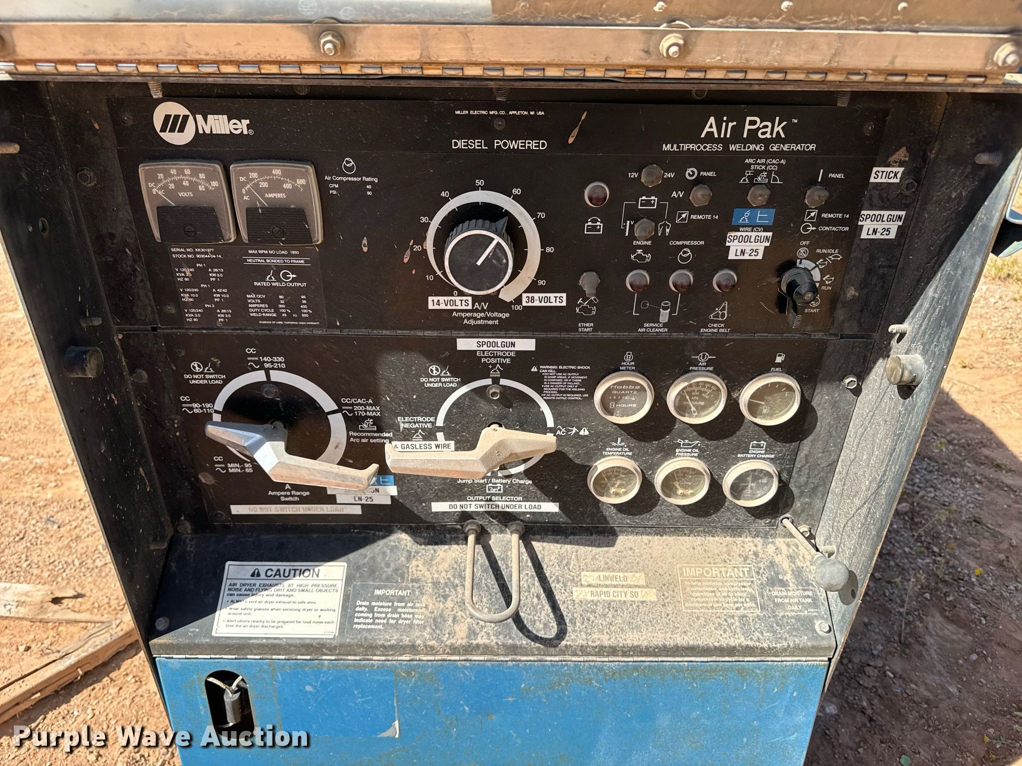 Miller Air Pak welder/generator. Hours: 5,033 on meter, Serial: KK301977. Engine Deutz, Cylinders: 3, Fuel type: Diesel. Features Welder Capabilities: CC, CV, AC, Wire, Stick, Fuel tank, Skid mounted, Generator Phase: Single, 240V outlets: 2, 120V outlets: 2, Air compressor, Remote. Notes Dead battery, Starter issues, clicks, Unknown operating condition. Site Work Specialists. Rapid City, SD 57702