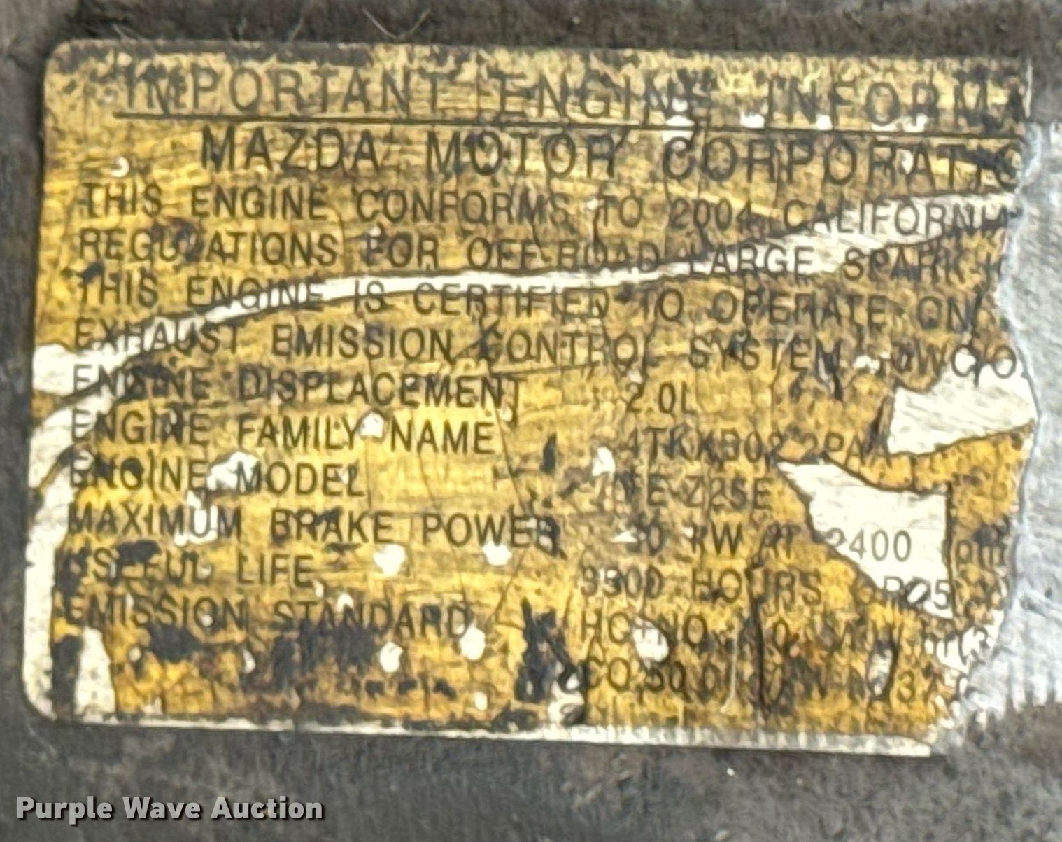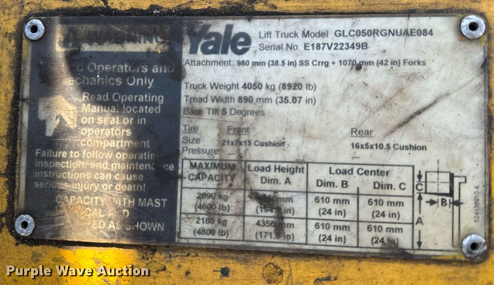 Yale GLC050RGNUAE084 forklift. Hours: 8,682 on meter, Serial: E187V22349B. Engine Mazda FE-Z25E, Cylinders: 4, Fuel type: LPG LP bottle: Not included. Transmission Powershift, 1F - 1R. Operators station OROPS. Features Maximum lift capacity: 4,800 lbs, Maximum lift height: 194", Mast stages: 2, Side shift, Mast tilt, Fork length: 42". Tires Front: 21x7x15, Rear: 16x5x10 1/2, Solid. Steel Mart. Dubuque, IA 52001