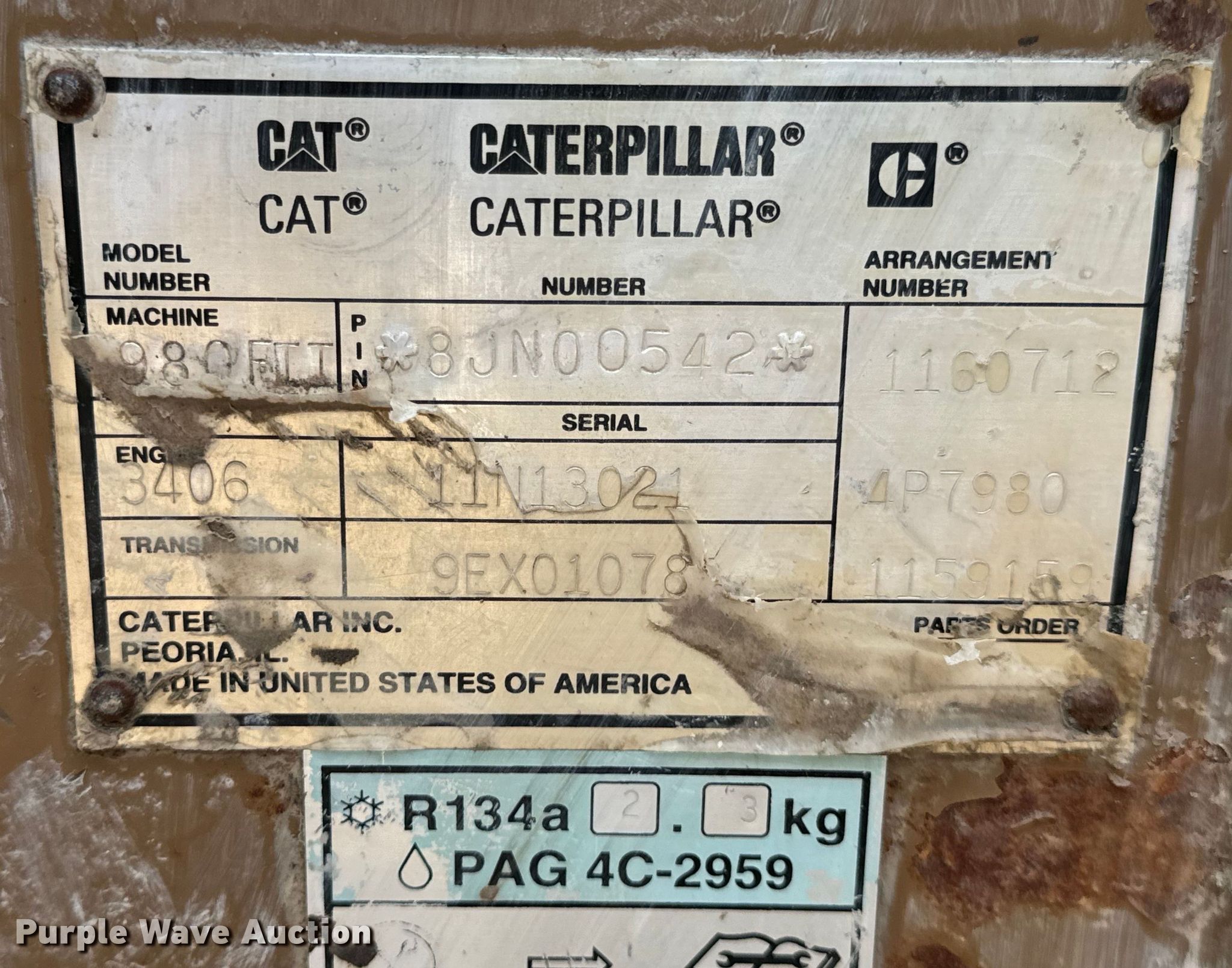 1995 Caterpillar 980F Series II wheel loader. Hours: 36,090 on meter, Serial: 8JN00542, Unit #: 2-89. Engine Caterpillar 3406, Serial: 11N13021, Cylinders: 6, Fuel type: Diesel. Transmission Powershift, 4F - 4R. Operators station Enclosed cab, Heat, Bucket controls: Two-lever. Features Bucket Caterpillar, Width: 132", Cutting edge: Bolt-on. Tires Size: 29.5R25. Notes Possible engine issues, coolant in oil. Capital Equipment. Hollister, MO 65672