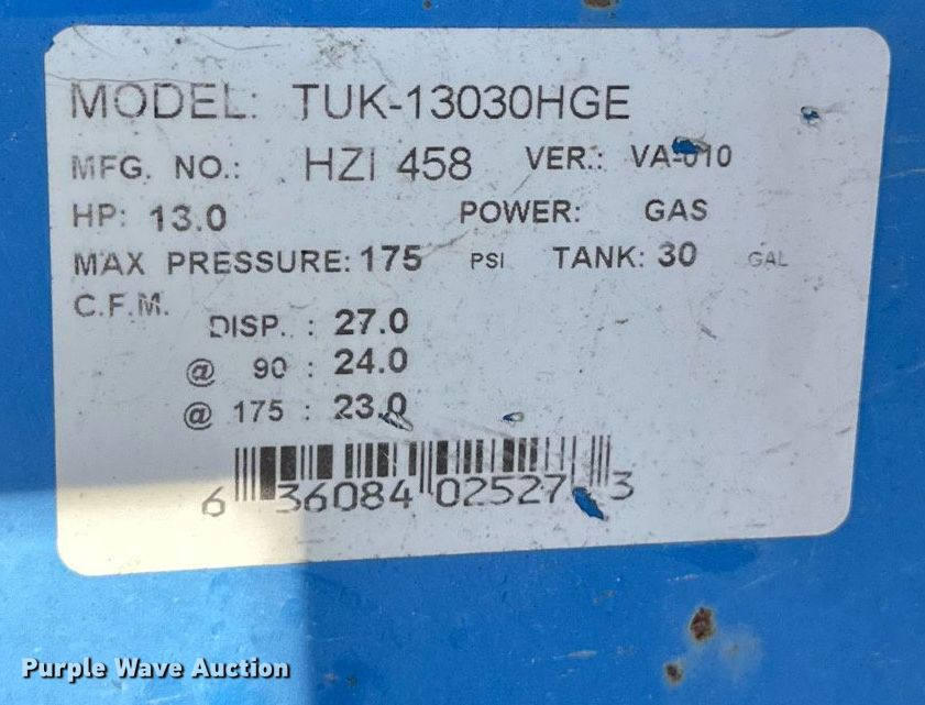 Purple Wave is selling a used Air Compressor in Kansas. This item is a Puma air compressor with the following: Honda, Fuel type: Gas, HP: 13