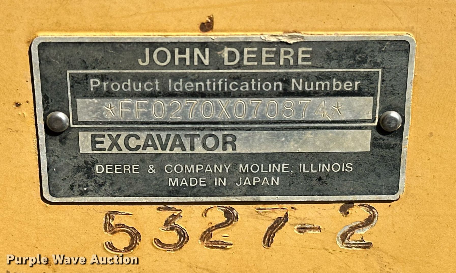 Purple Wave is selling a used Hydraulic Excavator in Oklahoma. This item is a 2001 John Deere 270LC excavator with the following: Hours: 9,321 on meter, Serial: FF0270X070874