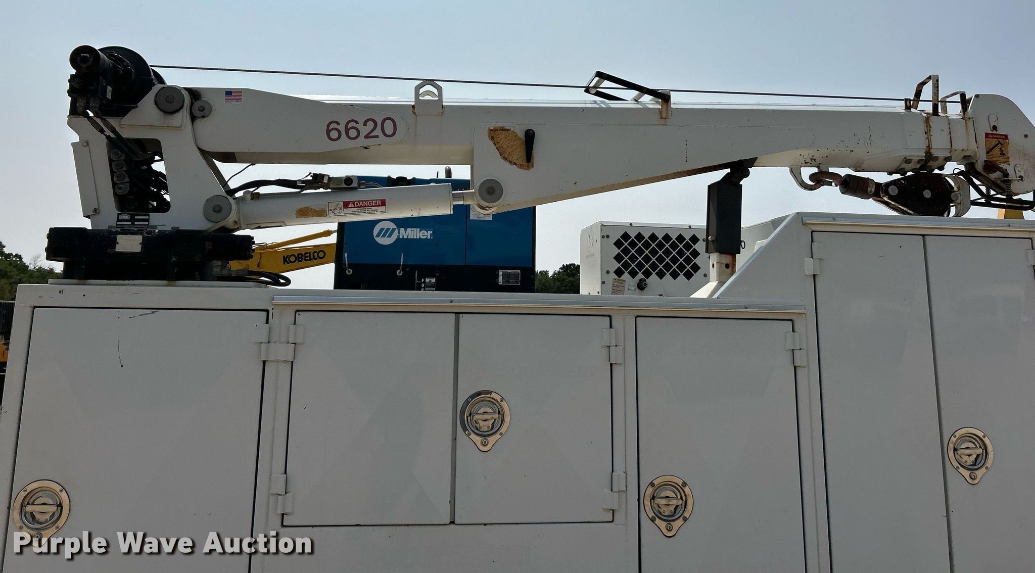 2019 Chevrolet GM515 utility / service truck. Miles: 113,632 on odometer, VIN: 1HTKJPVM0KH885334. Engine International 350, Displacement: 6.6L, Cylinders: 8, Fuel type: Diesel. Transmission Automatic. Chassis Four wheel drive, Axles: Single, Suspension: Spring, Brakes: Hydraulic, PTO, GVWR: 22,500 lbs. Interior AC, Heat, Heated mirrors, Power windows, Power locks, Cruise control, Brake controller. Features Bed Auto Crane, 11' 2" L x 94" W, Welder/generator Miller Bobcat 250, Fuel type: Gas, 240V outlets: 1, 120V outlets: 4, Watts: 11,000, Welder type: Tig, CC, CV, Wire, Stick (AC/DC), Air compressor Ingersoll Rand VHP40RMH OP, Crane Summit 6620, Maximum boom length: 22' Maximum lift capacity: 6,000 lbs.. Tires Front: 255/70R22.5, Rear: Same. Notes Dash warning indicator: Check engine. Missouri title. Hayden Machinery. Villa Ridge, MO 63089