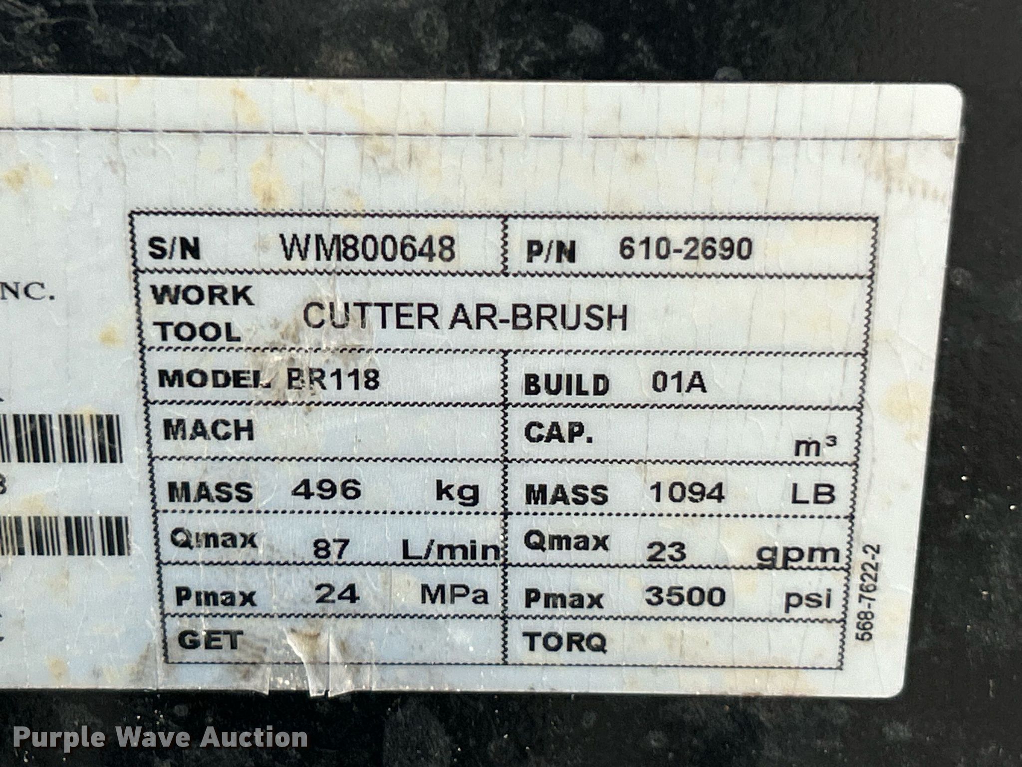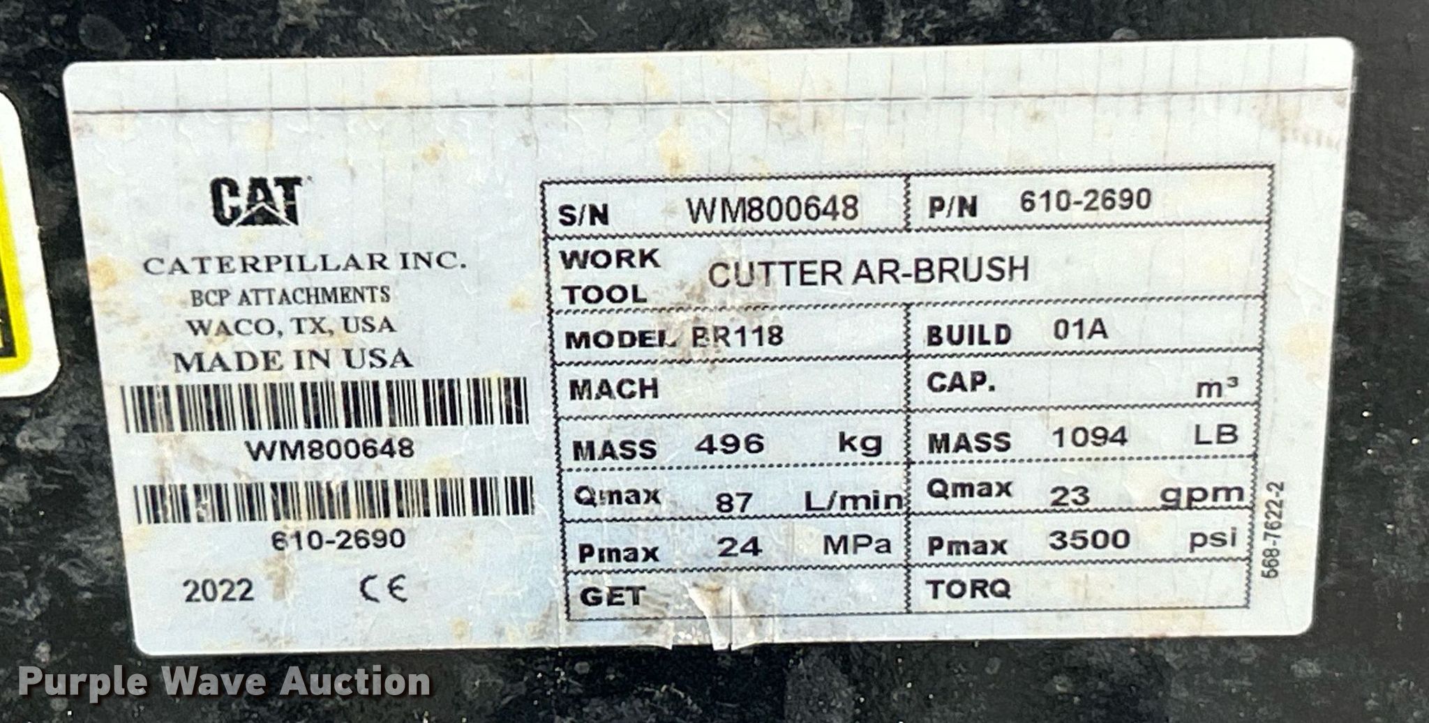 Purple Wave is selling a used Skid Steer Attach. in Missouri. This item is a 2022 Caterpillar BR118 skid steer brush cutter with the following: Serial: WM800648, Cutting width: 72"