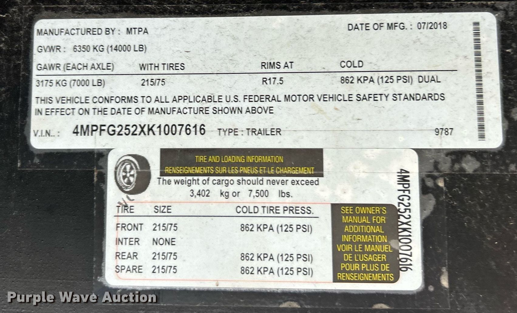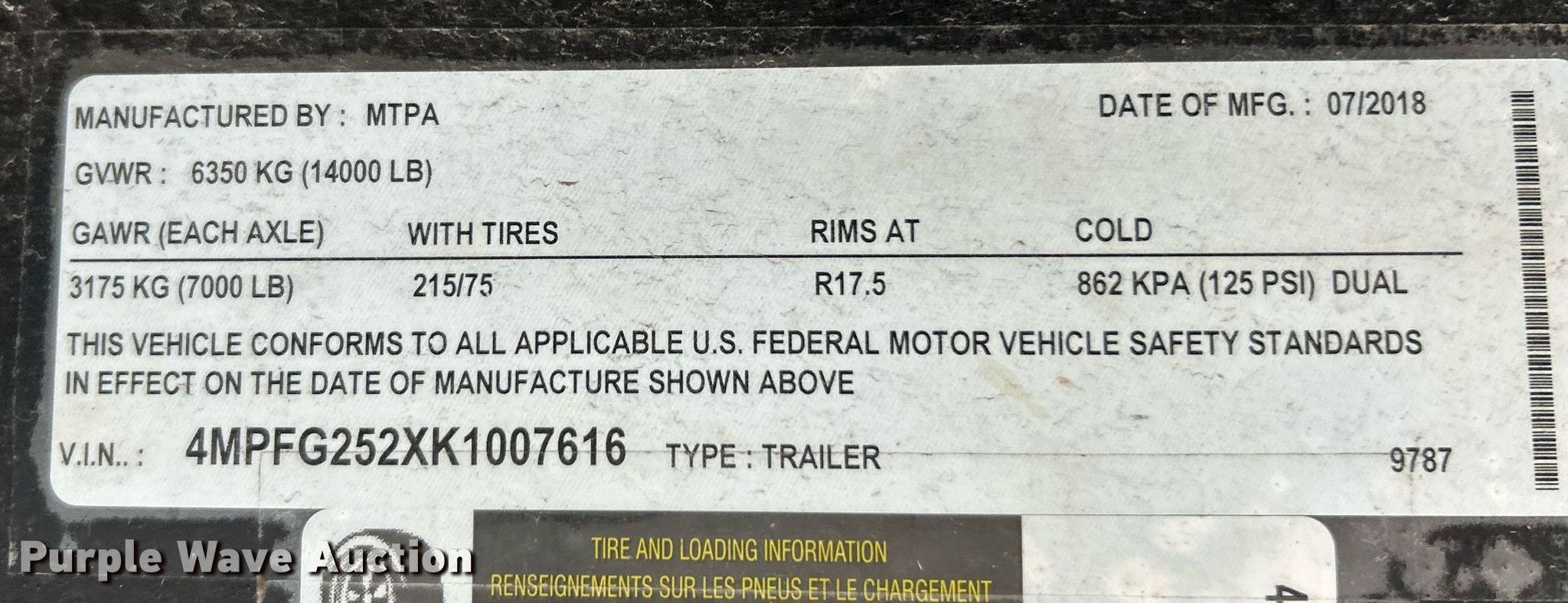 Purple Wave is selling a used Equip. Trailer in Missouri. This item is a 2019 Maxwell equipment trailer with the following: VIN: 4MPFG252XK1007616