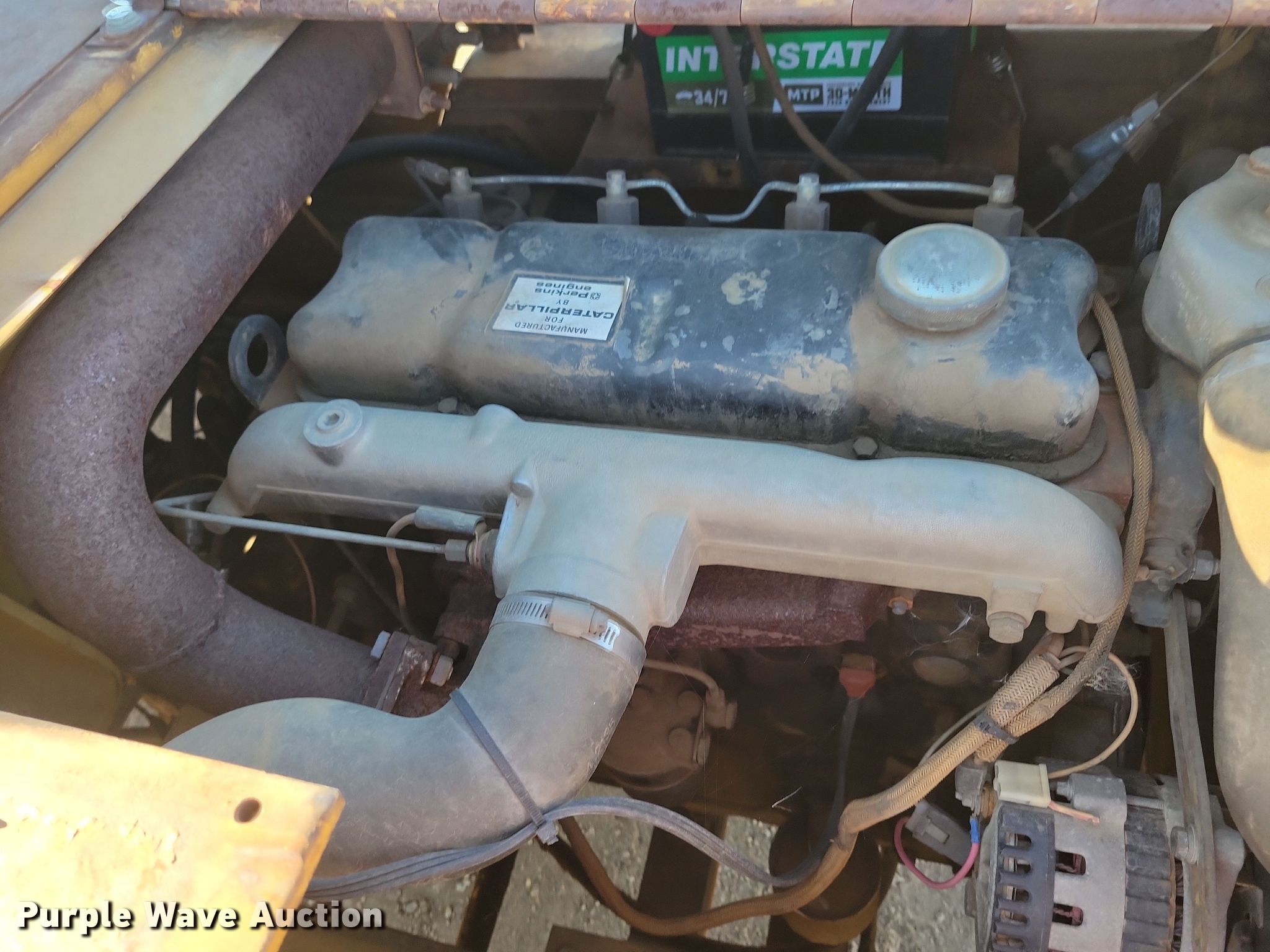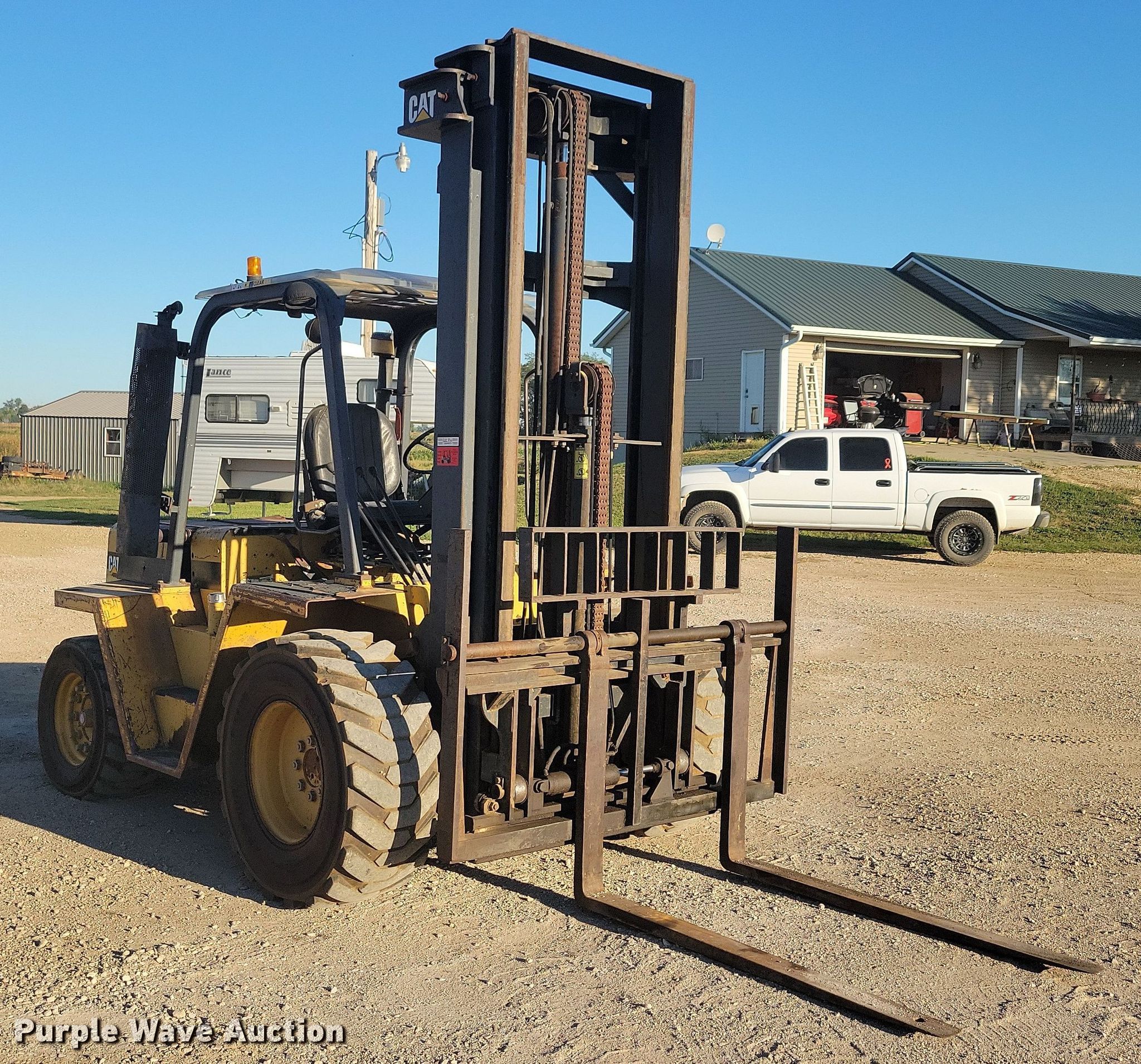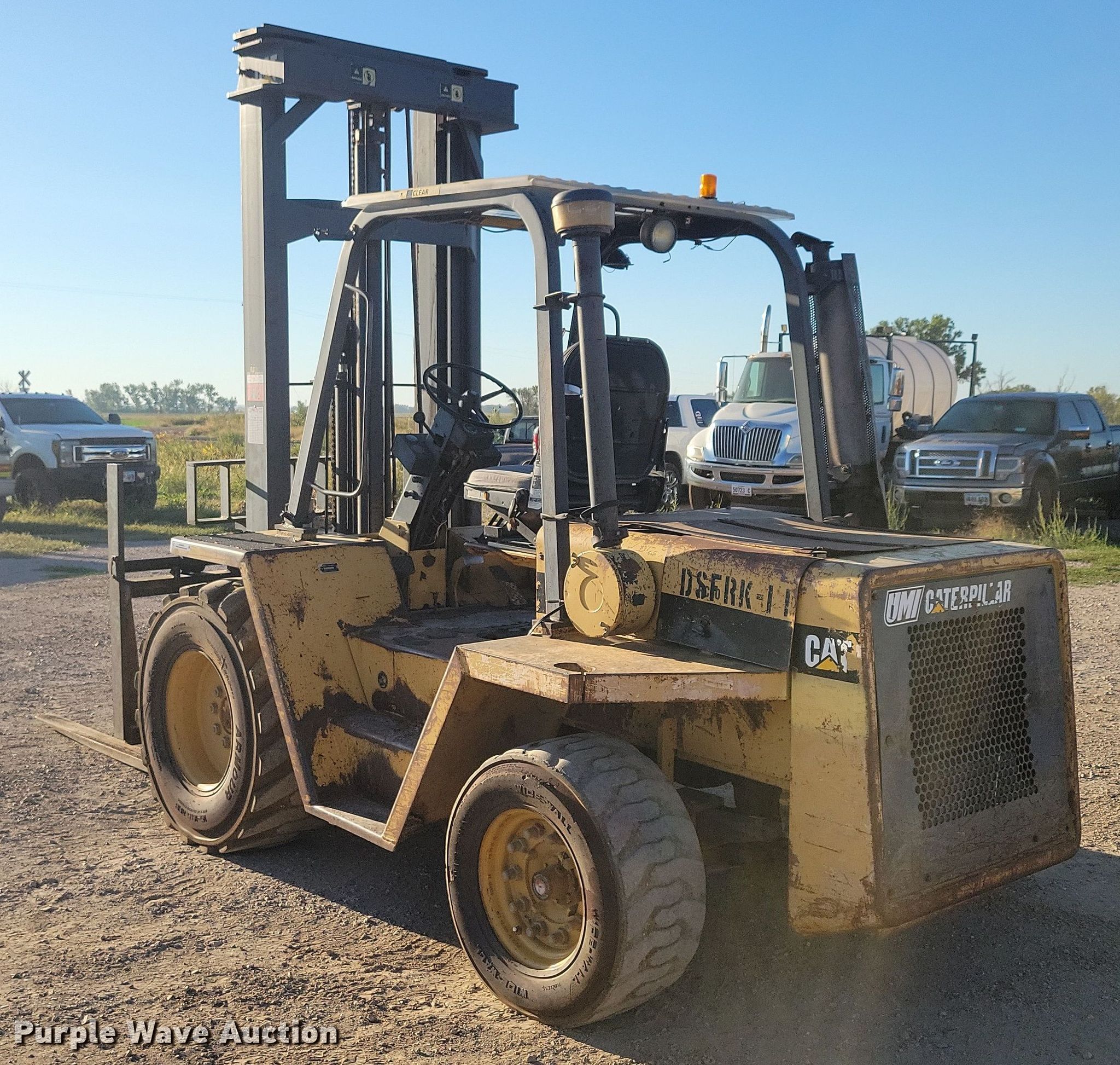 Caterpillar forklift. Hours: 4,339 on meter. Engine Perkins, Cylinders: 4, Fuel type: Diesel. Transmission Manual, 4F - 4R. Operators station OROPS, Canopy. Features Mast stages: 3, Side shift, Mast tilt, Fork length: 58". Tires Front: 15-19.5NHS, Rear: 12-16.5. Worthing, SD 57077