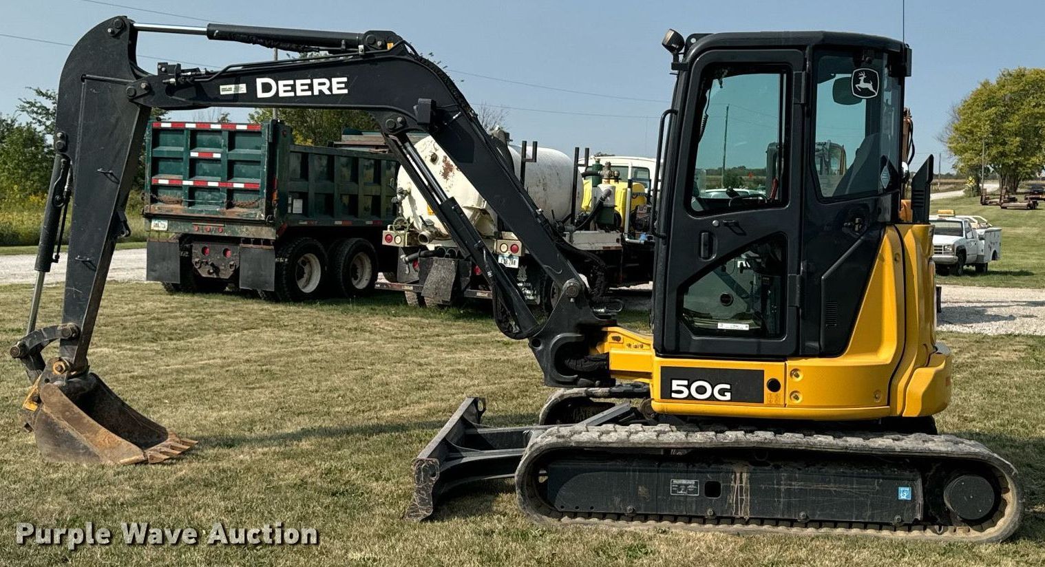 2016 John Deere 50G mini excavator. Hours: 1,574 on meter, Serial: 1FF050GXKGH283786. Engine Yanmar, Displacement: 134 C.I.D., Cylinders: 3, Fuel type: Diesel, HP: 35.9. Transmission Hydrostatic, Two speed travel. Operators station Enclosed cab, AC, Heat, Pattern changer. Features Auxiliary hydraulics Standard, Width: 79", Boom Swing, Stick Stick length: 4' 6", Quick coupler: Mechanical, Bucket John Deere, Width: 18", Teeth: 4. Tracks Width: 16", Rubber. Pursuant to Iowa law, Purple Wave will not be collecting sales taxes on any of the purchases made in this business liquidation auction. Jackson Creek Enterprises Retirement - Open Inspection October 10. Allerton, IA 50008