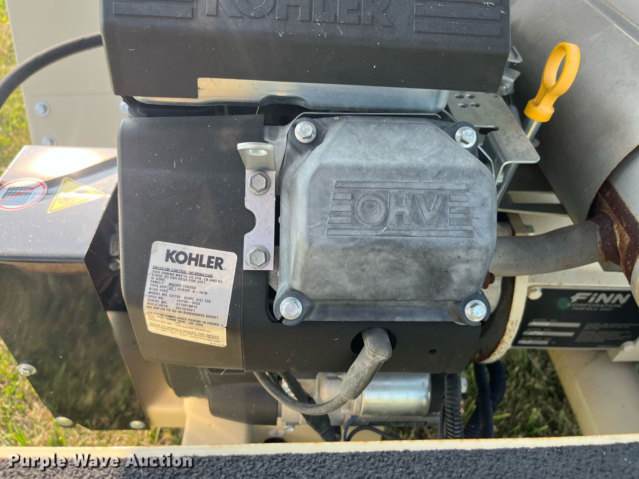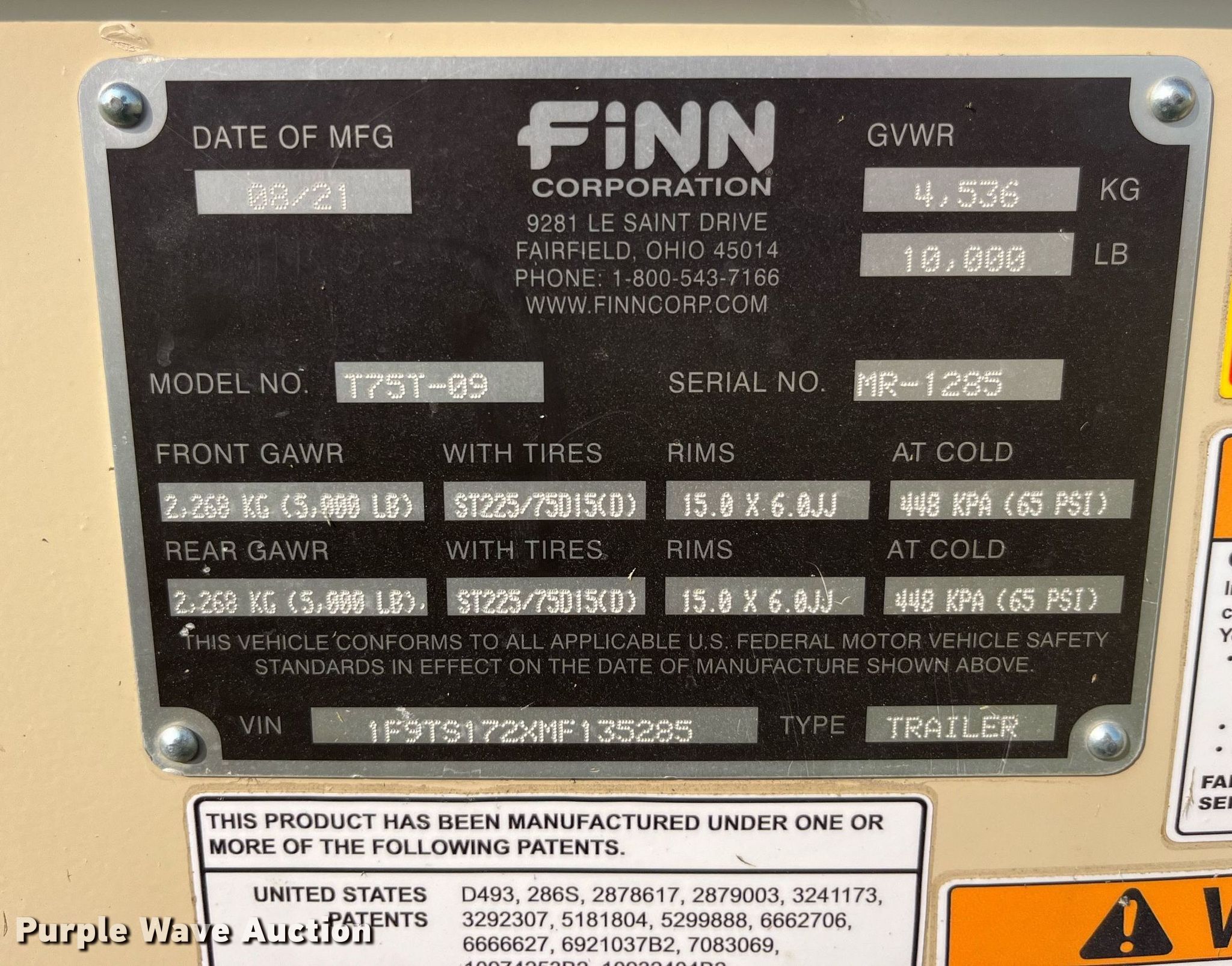 2021 Finn T75T-09 hydroseeder. Hours: 83 on meter, VIN: 1F9TS172XMF135285, Serial: MR-1285. Engine Kohler CH730, Serial: 5113018813, Displacement: 725 cc, Cylinders: 2, Fuel type: Gas. Features Gallon capacity: 750, Work platform, Agitator: Forward, Reverse, Turret discharge, Hose reel Diameter: 25", Hose Diameter: 1.5", Nozzle. Trailer 16' 10" L x 70" W, Hitch: Pintle, Brakes: Electric, Axles: Tandem, GVWR: 10,000 lbs, GAWR: 5,000 lbs. Tires Tire size: 225/75D15. Pursuant to Iowa law, Purple Wave will not be collecting sales taxes on any of the purchases made in this business liquidation auction. Iowa title. Title distribution may be delayed up to 14 days from verification of funds. Jackson Creek Enterprises Retirement - Open Inspection October 10. Allerton, IA 50008