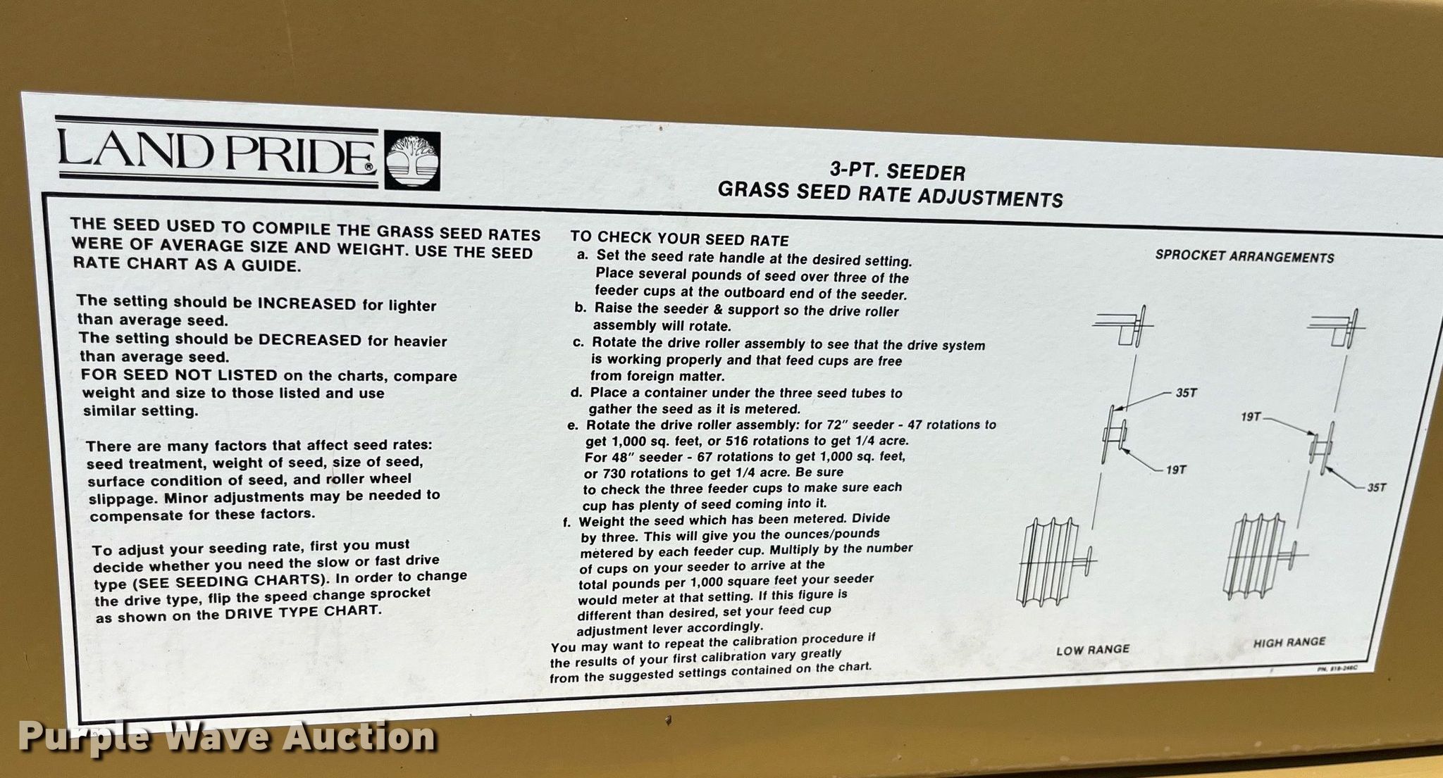 Land Pride PS1572 seeder. Width: 6'. Features Frame Hitch: Three point, Seed delivery Bulk fill system. Pursuant to Iowa law, Purple Wave will not be collecting sales taxes on any of the purchases made in this business liquidation auction. Jackson Creek Enterprises Retirement - Open Inspection October 10. Allerton, IA 50008