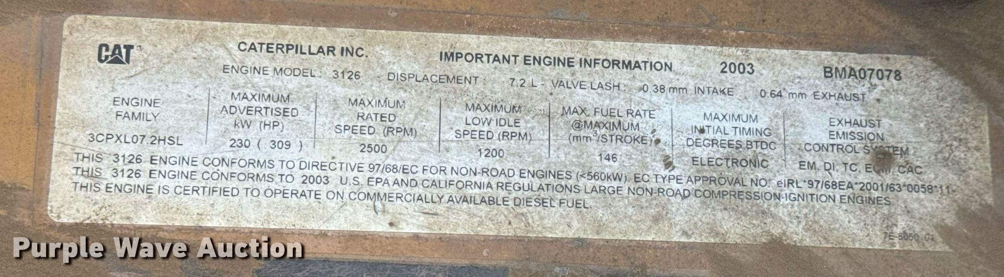 2004 Caterpillar 950G Series 2 wheel loader. Hours: 13,078 on meter, Serial: CAT0950GCBAA00415. Engine Caterpillar 3126, Displacement: 7.2L, Cylinders: 6, Fuel type: Diesel, HP: 309. Transmission Powershift, 4F - 4R. Chassis Differential lock. Operators station Enclosed cab, AC, Heat, Bucket controls: Two-lever, Ride control. Features Quick coupler: Hydraulic, Counter weights, Bucket Caterpillar, Width: 115", Forks Caterpillar, Length: 72", Boom Caterpillar. Tires Size: 23.5R25. Dondlinger & Sons Construction. Wichita, KS 67217