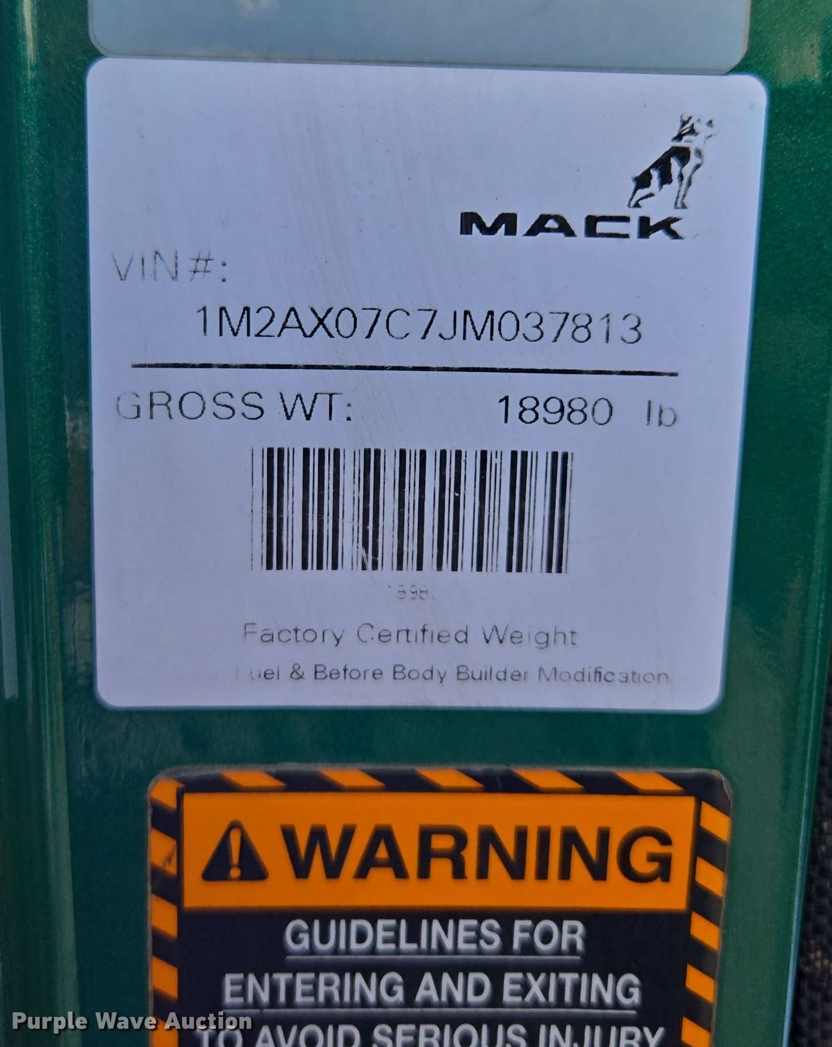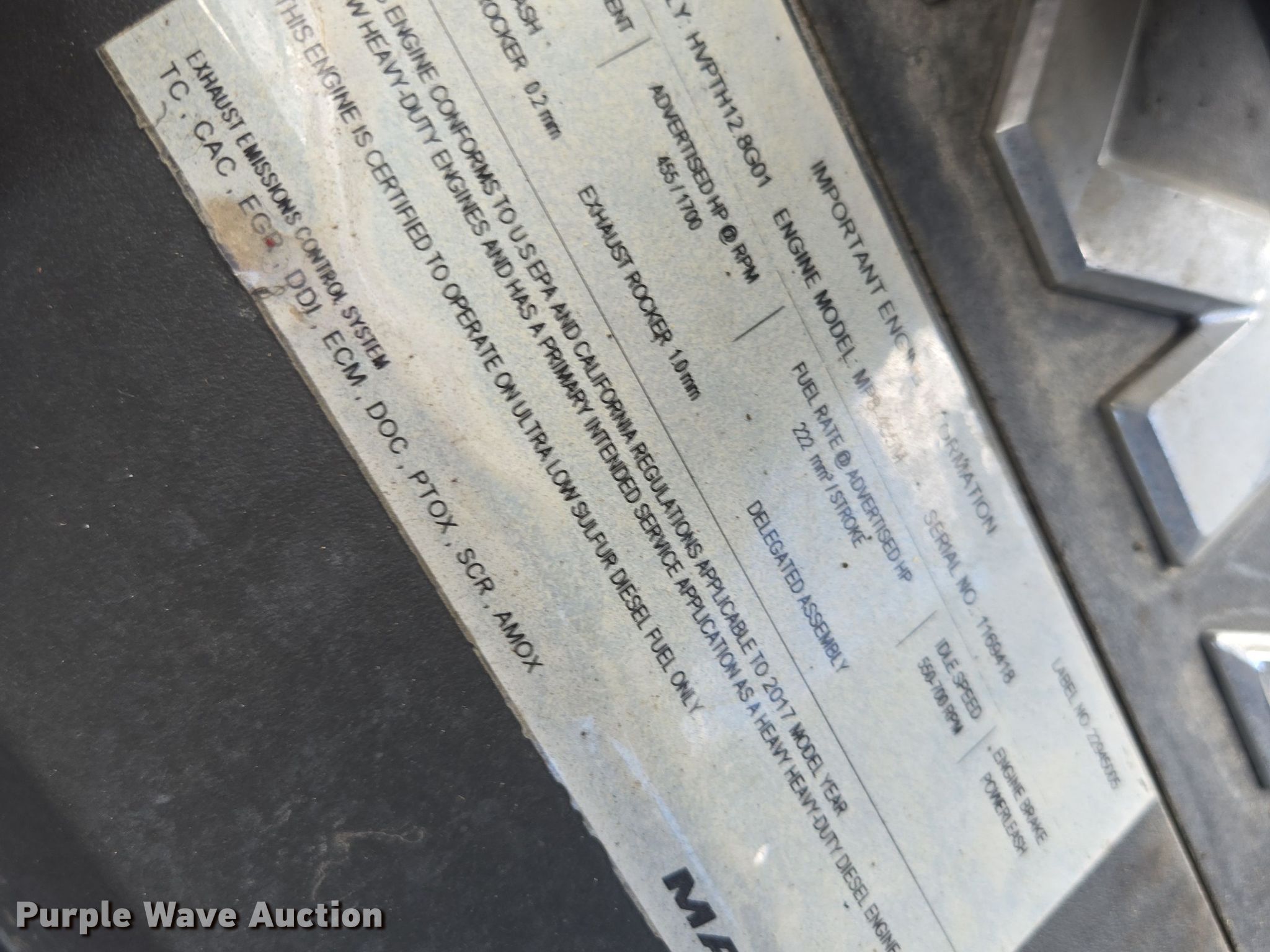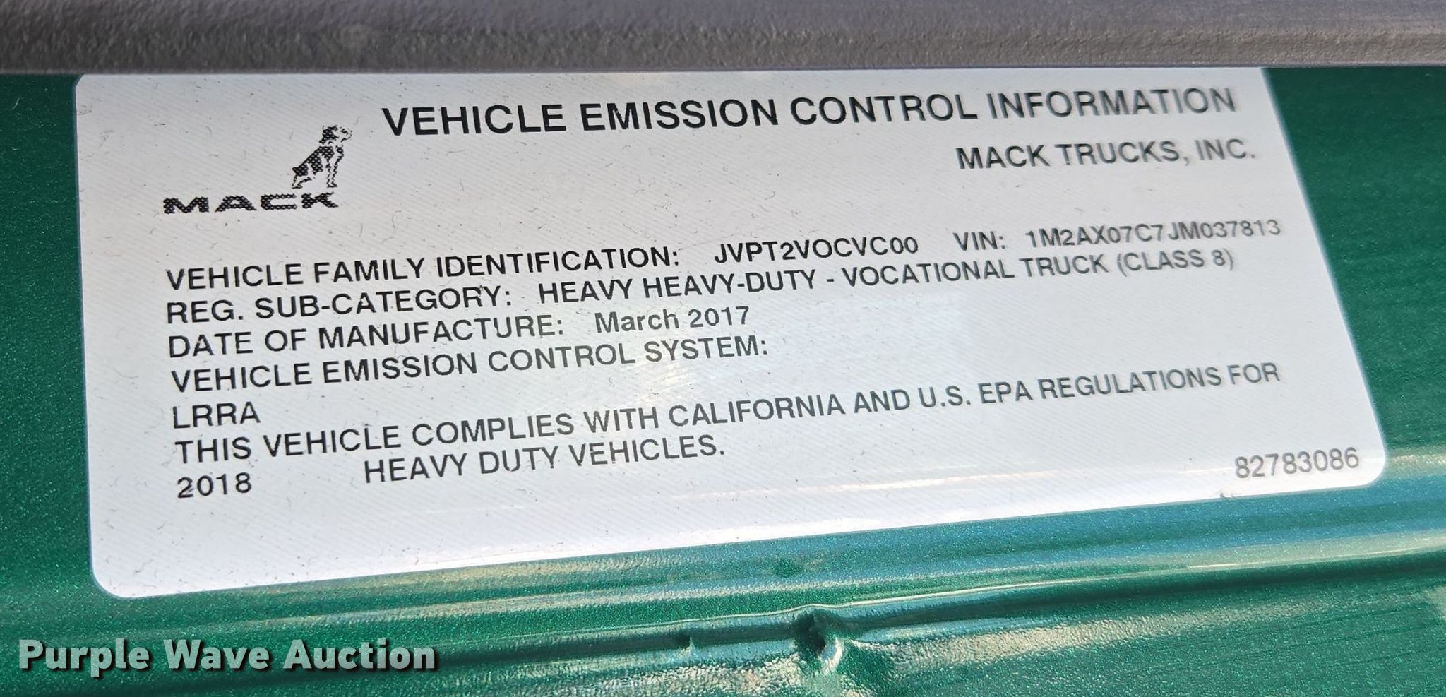 2018 Mack GU713 dump truck. Miles: 131,360 on odometer, Hours: 8,571 on meter, VIN: 1M2AX07C7JM037813. Engine Mack MP8-455M, Serial: 1169418, Displacement: 12.8L, Cylinders: 6, Fuel type: Diesel, HP: 455, Engine brake. Transmission Allison, Automatic. Chassis Double frame, Axles: Tandem, Differential lock: Inter-axle, Suspension: Camelback, Brakes: Air, PTO, GVWR: 66,000 lbs FAWR: 20,000 lbs, IAWR: 23,000 lbs, RAWR: 23,000 lbs. Interior AC, Heat, Heated mirrors, Power windows, Cruise control. Features Dump bed Hilark 16 5/16, 16' L x 96" W, Side height: 48", Bed type: Steel, Barrel, Roll tarp, Ram: Single, End gate: Air operated. Tires Front: 425/65R22.5, Rear: 11R24.5. Missouri title. Clymore Trucking Company. Independence, MO 64050