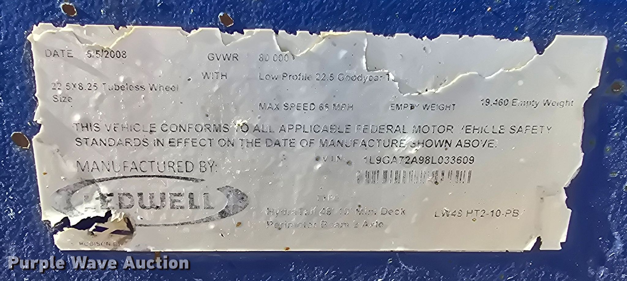 Purple Wave is selling a used Equip. Trailer in South Dakota. This item is a 2008 Ledwell 10x48 drop deck hydraulic tail equipment trailer with the following: VIN: 1L9GA72A98L033609