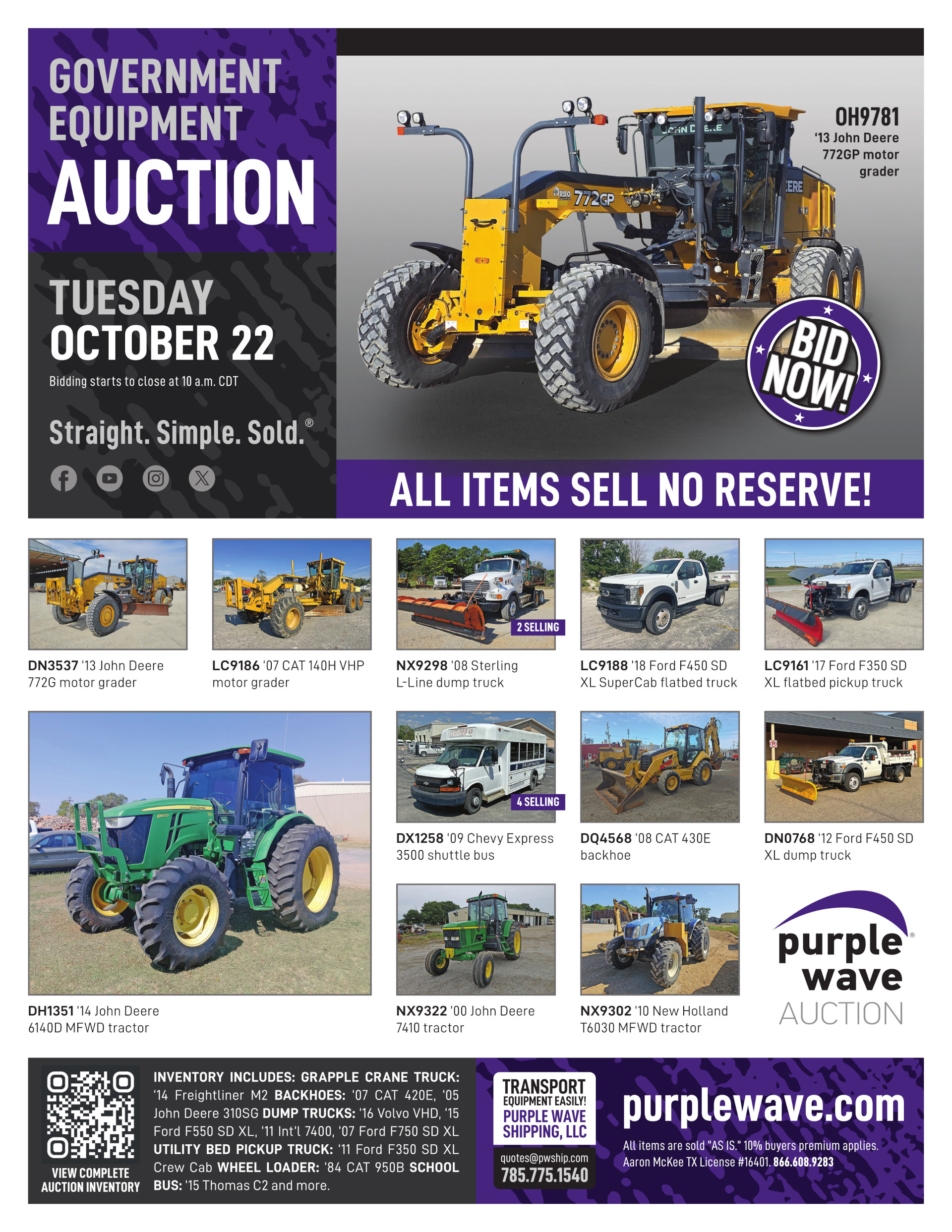 Purple Wave Shipping, LLC provides shipping and transportation services to winning bidders on ag, construction and fleet type assets. Purple Wave Shipping, LLC does not provide shipping on items weighing less than 1,000 pounds.