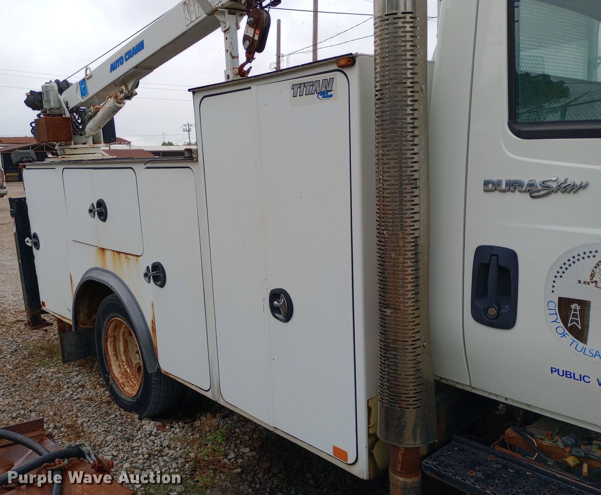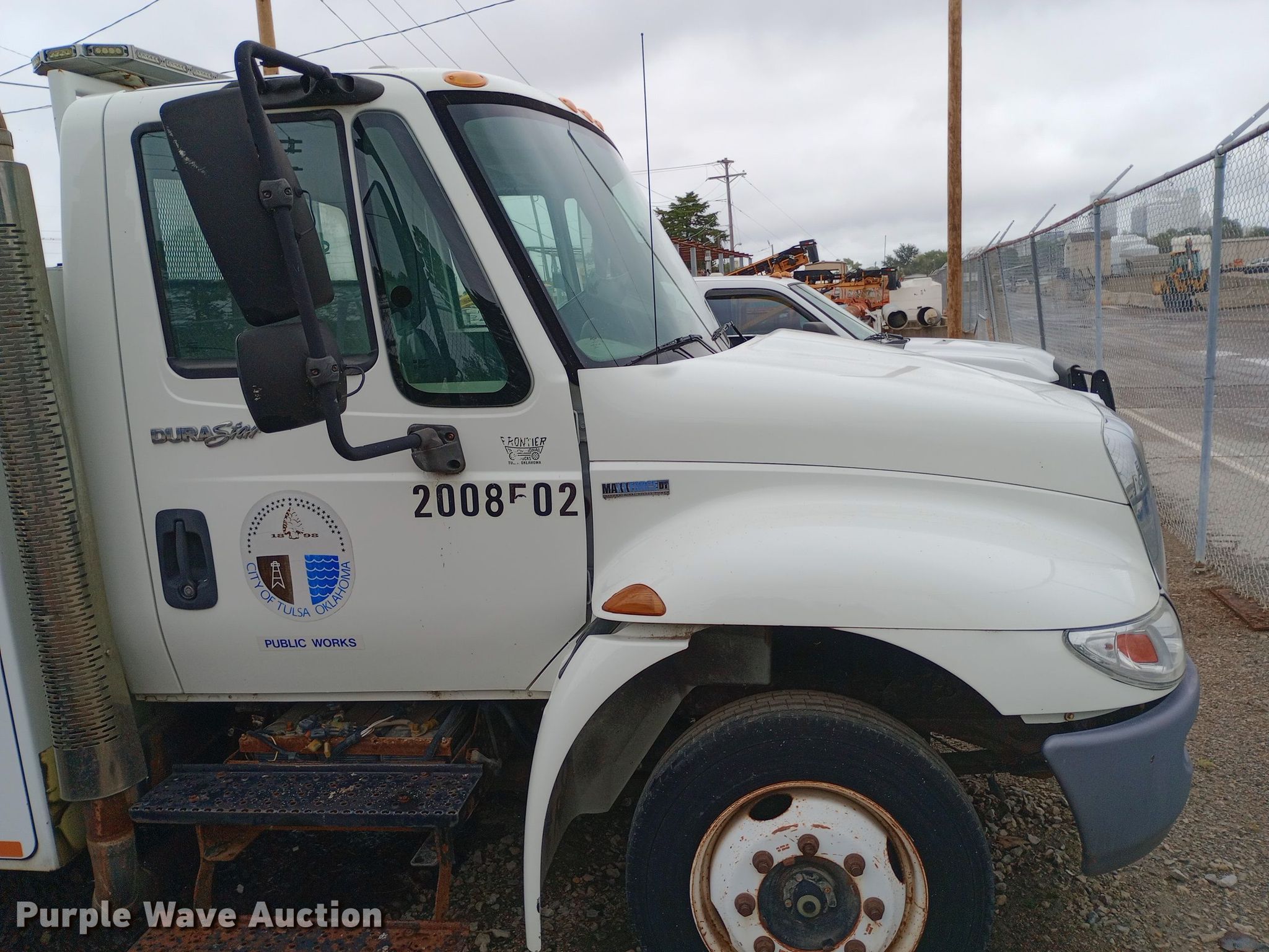 2008 International 4300 utility / service truck. Miles: Unknown, VIN: 1HTMNAAM28H577364, Unit #: 2008502. Engine International GDT245 Maxxforce DT, Displacement: 7.6L, Cylinders: 6, Fuel type: Diesel, HP: 245. Transmission Automatic. Chassis Axles: Single, Suspension: Spring, Brakes: Hydraulic, GVWR: 23,500 lbs. Interior AC, Heat. Features Bed 11' 8" L x 95" W, Crane Auto Crane 3203, Maximum boom length: 15' Maximum lift capacity: 3,000 lbs, Eagle Lift end gate lift Capacity: 1,300 lbs. Tires Size: 245/70R19.5. Notes Contents not included, Unknown operating condition of end gate lift, Dead battery, Non-operational unit. Oklahoma title. Mileage has not been verified. Exempt will be written in the odometer disclosure on the title. Seller is a government entity who will be assigning and distributing the title. Please contact the seller for distribution questions. Title distribution may be delayed up to 30 days from verification of funds. City of Tulsa. 450 West 23rd Street. Tulsa, OK 74107