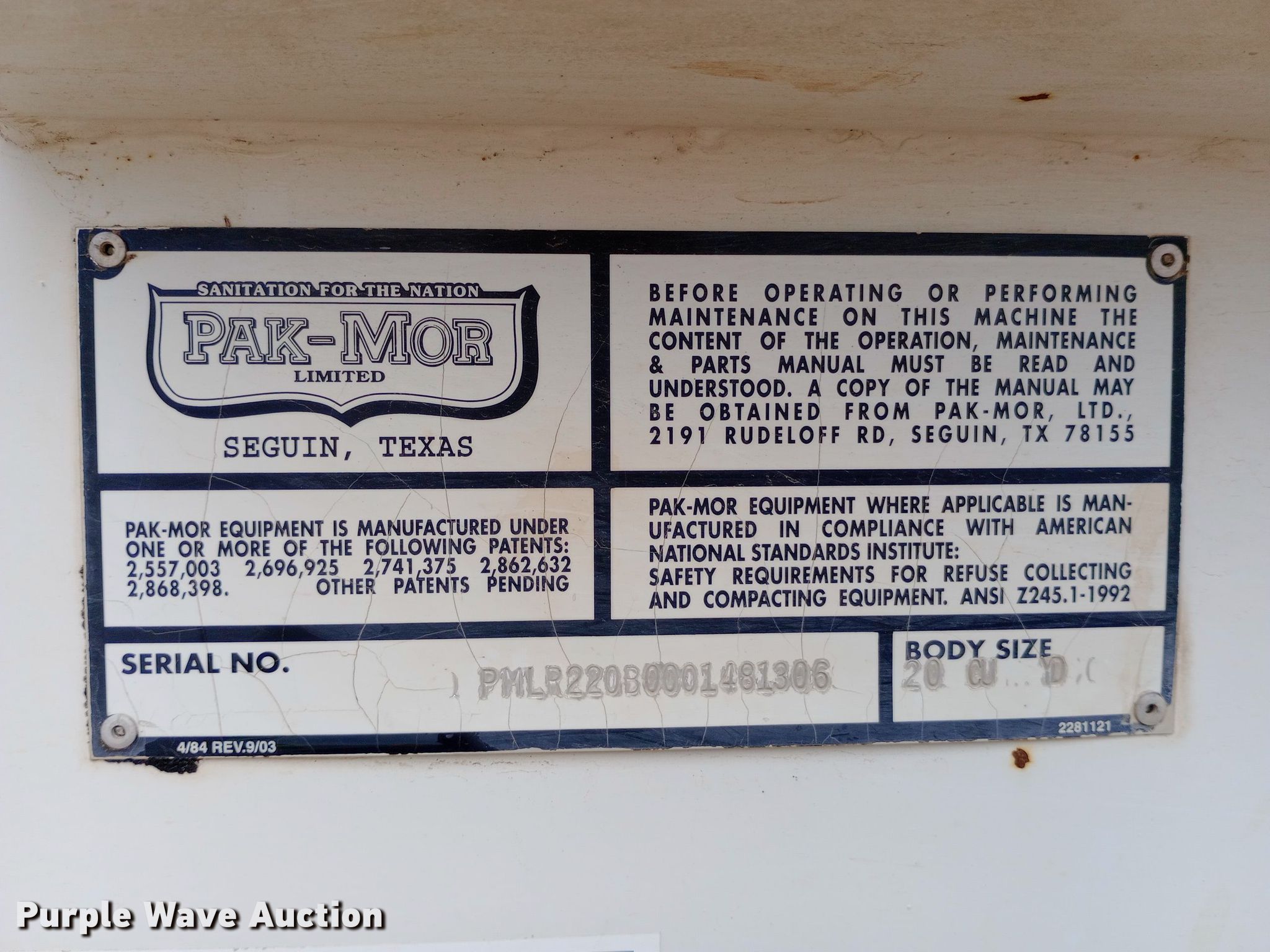 2006 Freightliner Business Class M2 refuse truck. Miles: 123,675 on odometer, Hours: 24,107 on meter, VIN: 1FVHCYDJ76DX24947. Engine Mercedes-Benz, Displacement: 7.2L, Cylinders: 6, Fuel type: Diesel. Transmission Allison, Automatic. Chassis Axles: Tandem, Suspension: Spring, Brakes: Air, GVWR: 53,220 lbs. Interior Heat, Heated mirrors, Cruise control. Features Refuse bed Pak-Mor, Serial: PMLR220B0001481306, Capacity: 20 cu.yd., Load: Rear, Cart tipper, Winch. Tires Size: 11R22.5. Notes Dash warning indicator: Check engine, Engine protect, Engine issues, runs but shuts off. Kansas title. Title distribution may be delayed up to 14 days from verification of funds. Wellington, KS 67152