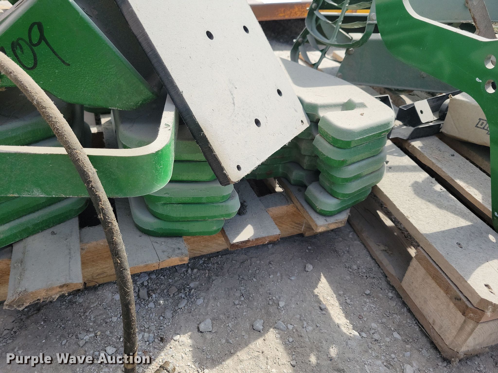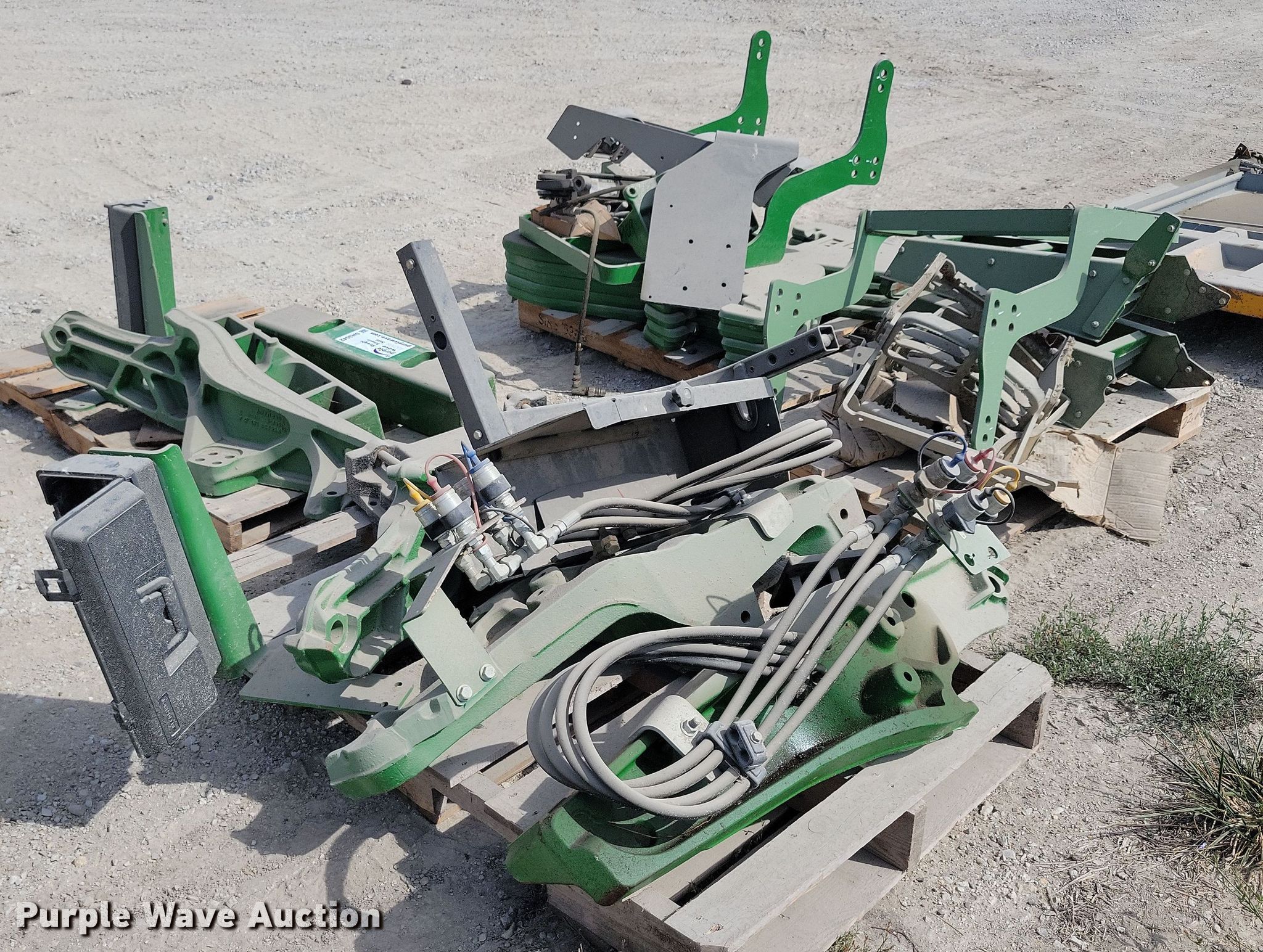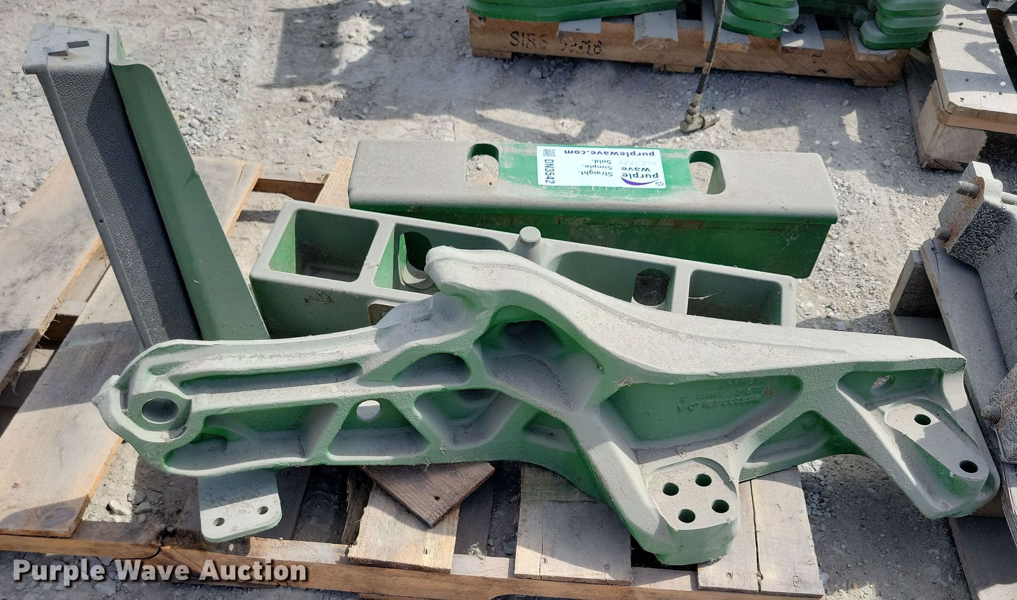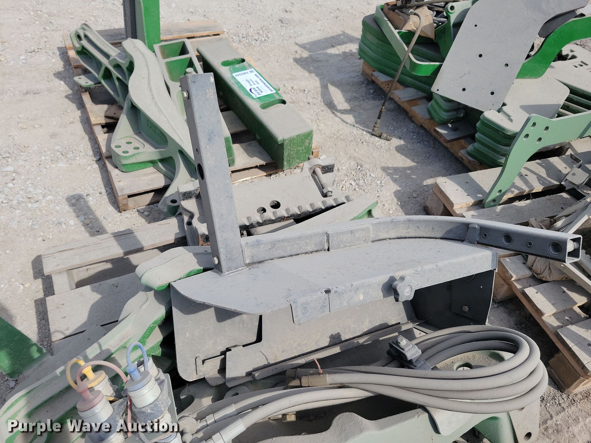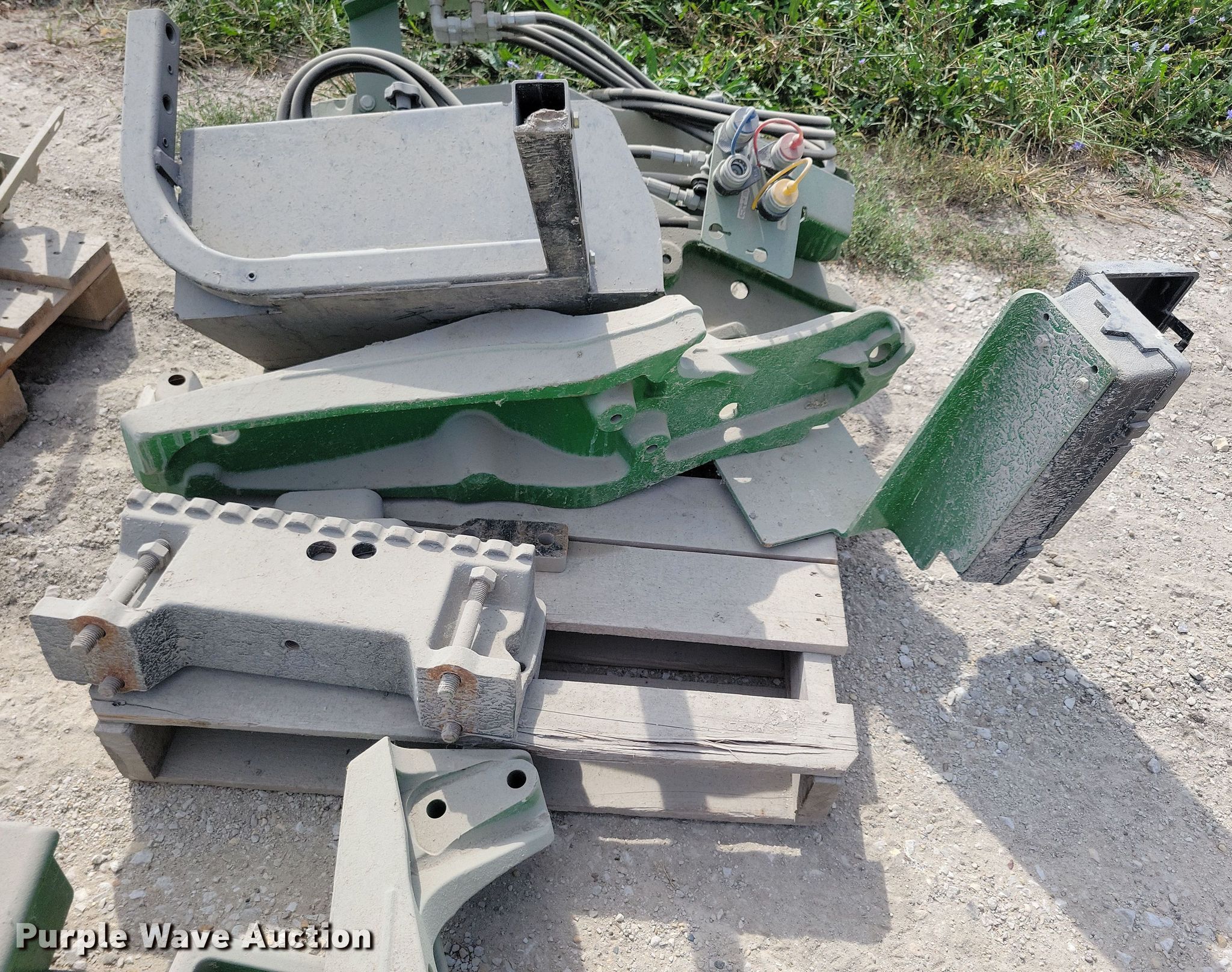 Purple Wave is selling a used Ag Tractor Loader or Attach. in Iowa. This item is a John Deere tractor parts with the following: Weight brackets, Front grill brackets, 14 to 47 kg suitcase weights, Steps, Loader brackets, Hydraulic, (4) front fenders