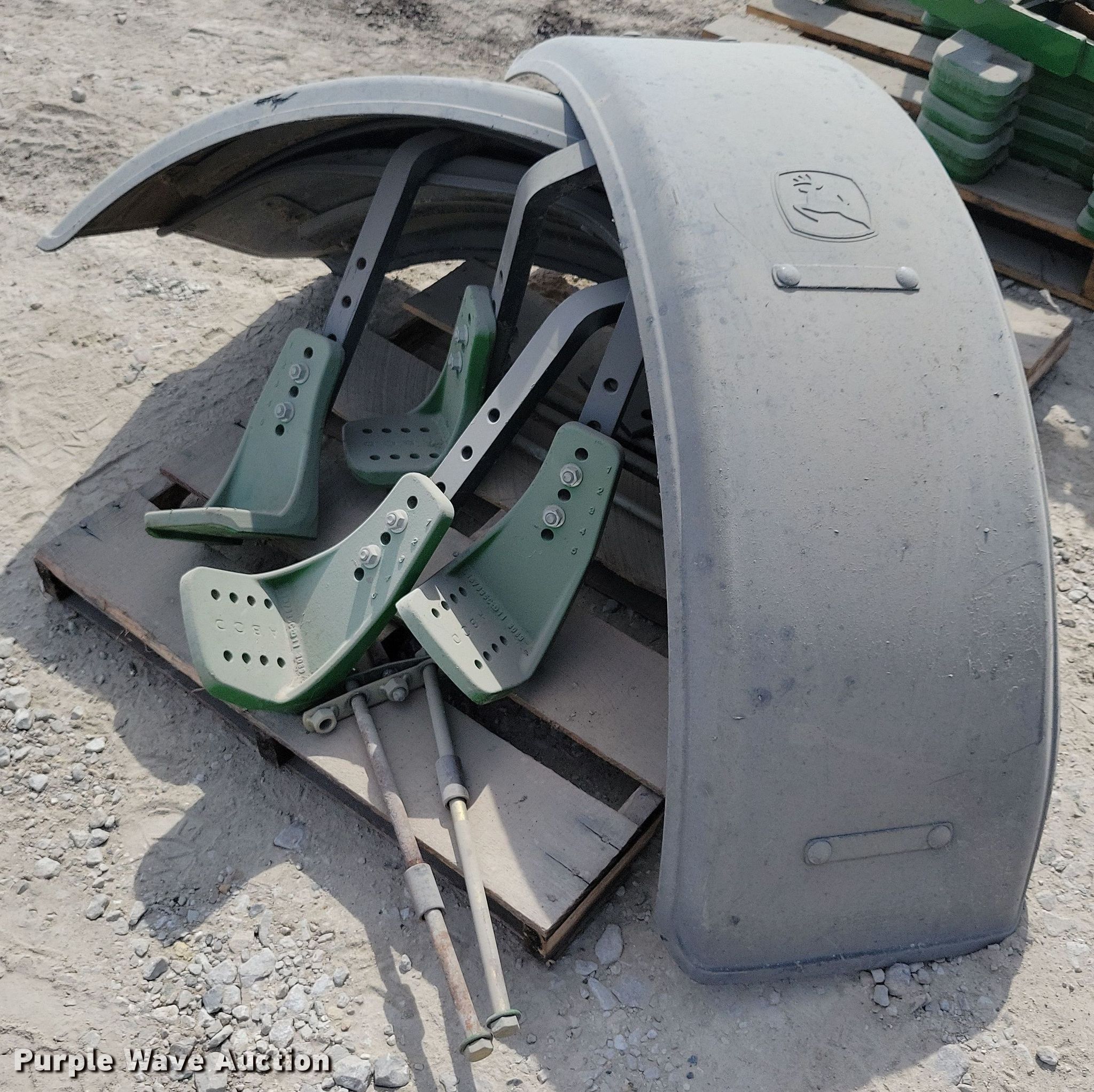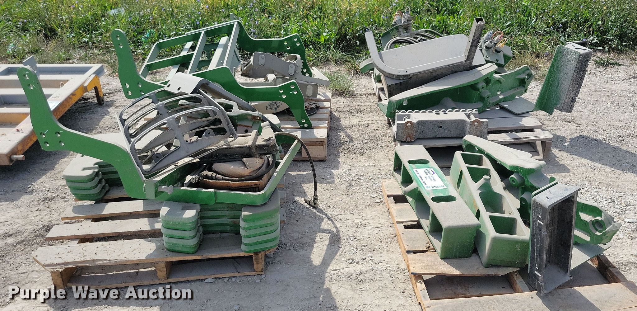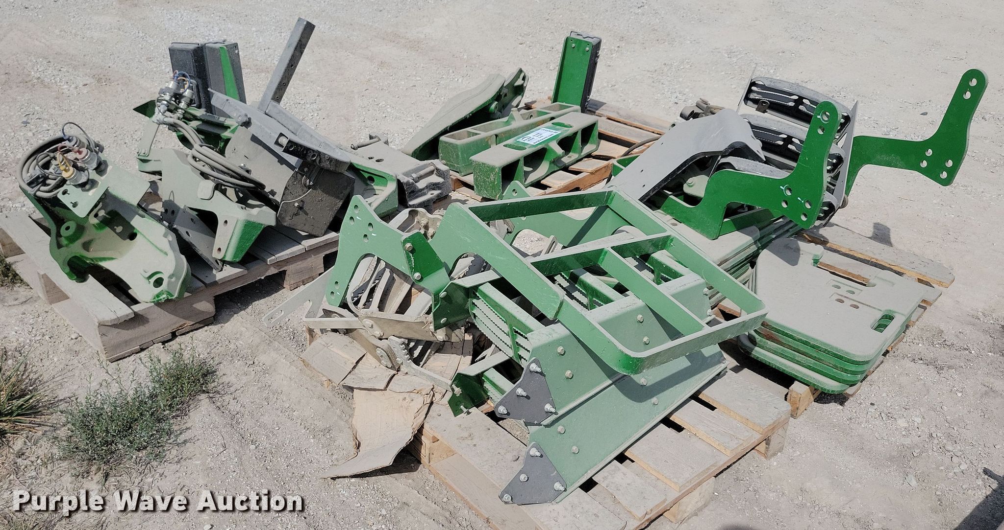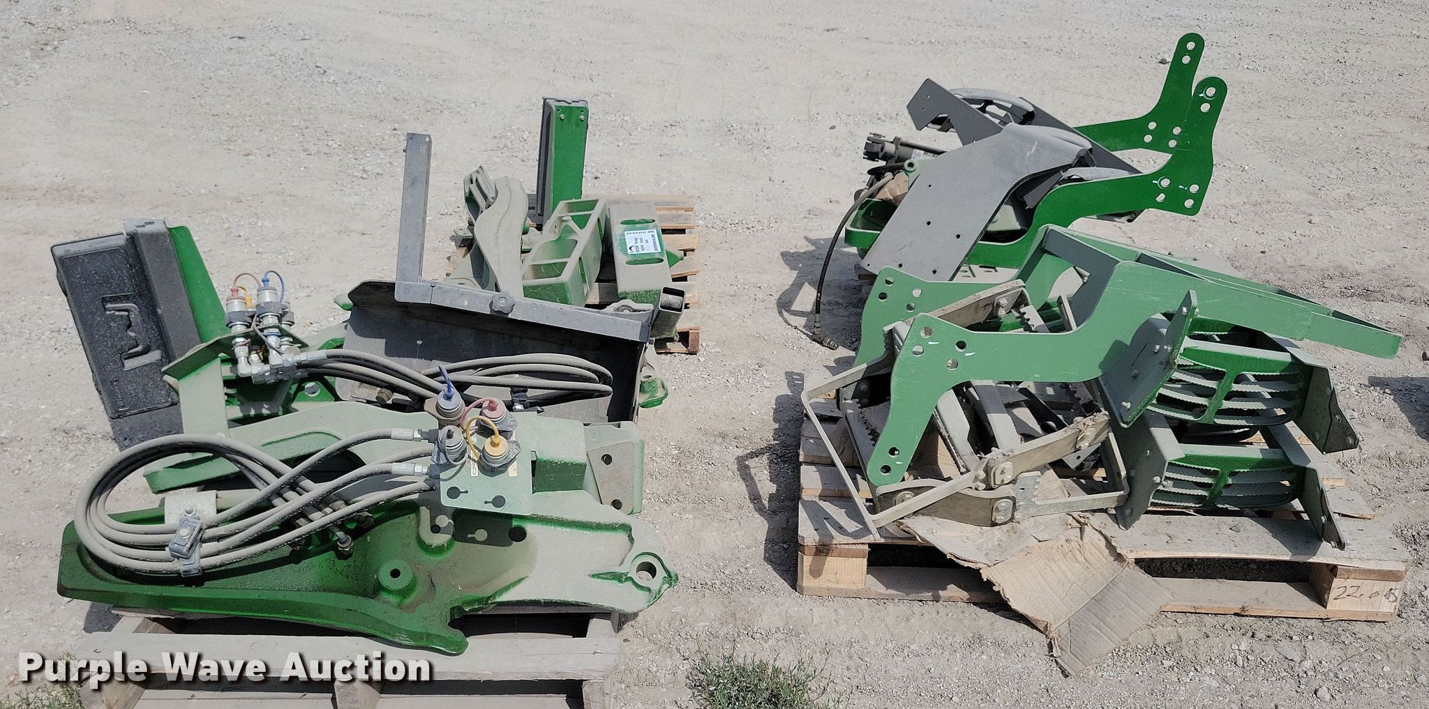 Purple Wave is selling a used Ag Tractor Loader or Attach. in Iowa. This item is a John Deere tractor parts with the following: Weight brackets, Front grill brackets, 14 to 47 kg suitcase weights, Steps, Loader brackets, Hydraulic, (4) front fenders