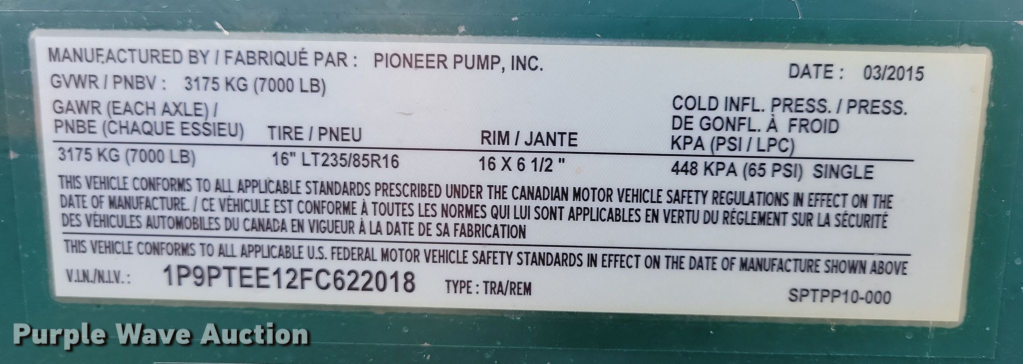 Purple Wave is selling a used Pump in South Dakota. This item is a 2015 Pioneer Pump P10015L72-H0-50-6 pump with the following: Hours: 9 on meter, VIN: 1P9PTEE12FC622018, Serial: PKG2385
