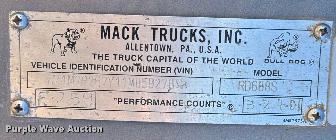 Purple Wave is selling a used Truck Chassis in Texas. This item is a 2001 Mack RD688S truck cab and chassis with the following: Miles: 173,125 on odometer, Hours: 10,301 on meter, VIN: 1M2P267Y11M059278, Unit #: 227