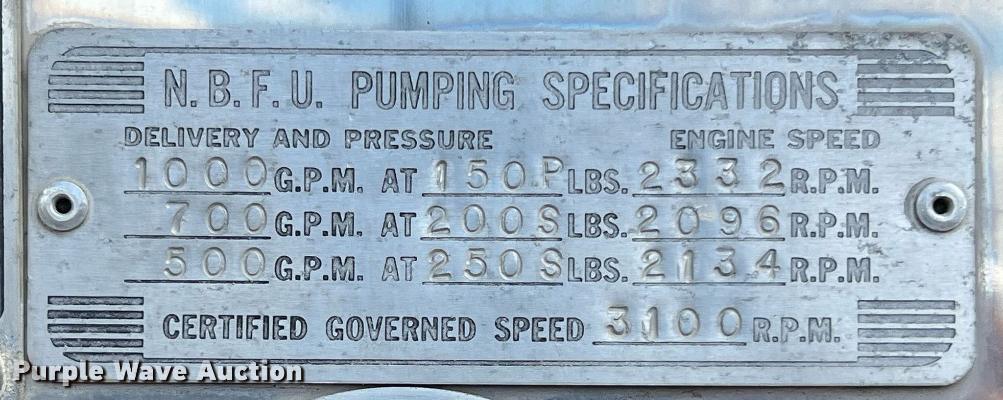 1970 American LaFrance pumper fire truck. Miles: 19,908 on odometer, Actual mileage unknown, VIN: 511997. Engine Cylinders: 6, Fuel type: Gas. Transmission Manual, Speed: 5. Chassis Axles: Single, Suspension: Spring, Brakes: Hydraulic. Interior Heat. Features Fire truck body Tank, Pump 1,000 gpm, Ground ladder. Tires Size: 9.00-20. Notes Non-operational unit. Texas title. Title distribution may be delayed up to 14 days from verification of funds. City of New Braunfels. New Braunfels, TX 78130