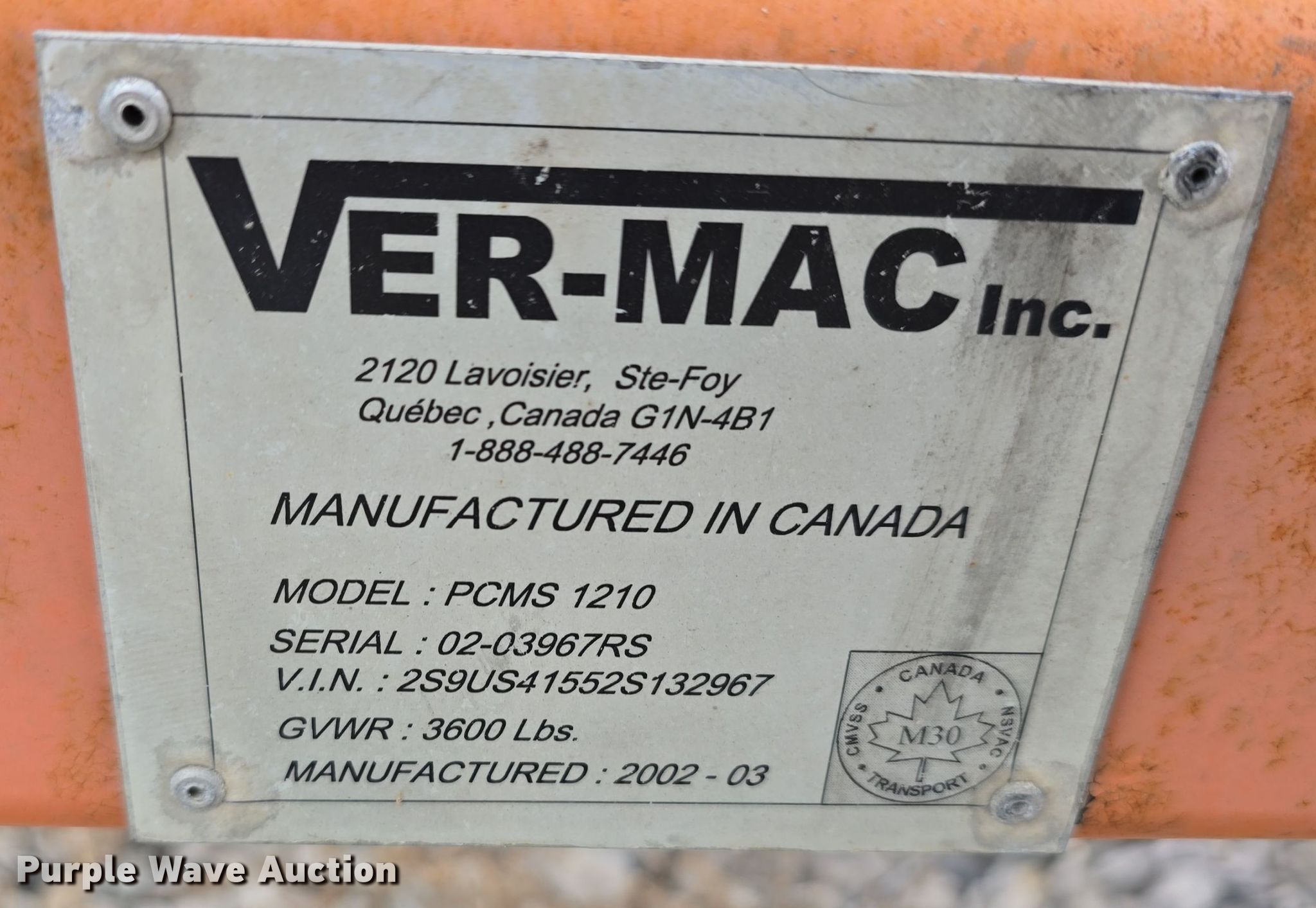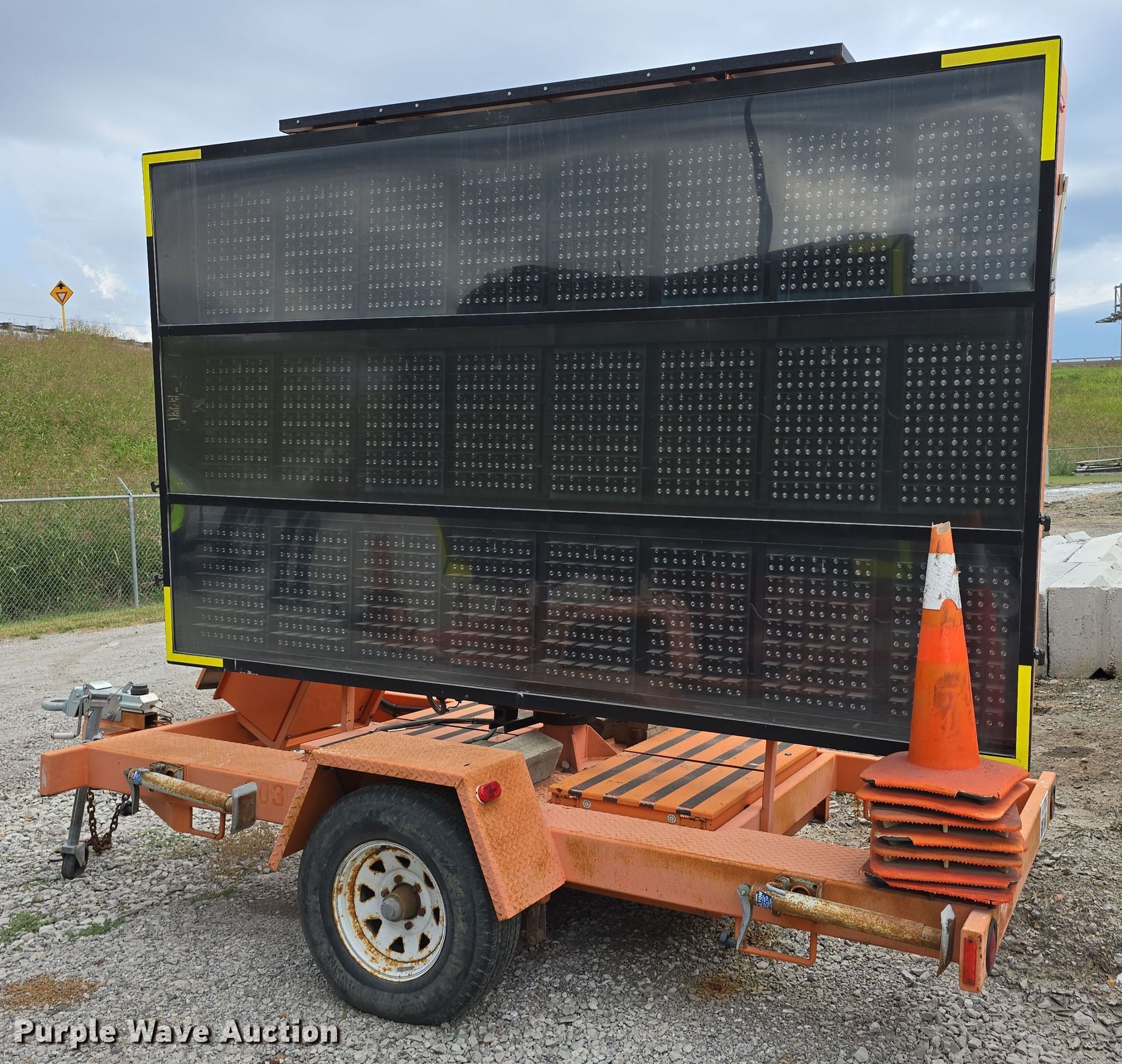 Purple Wave is selling a used Road Safety Equip. in Missouri. This item is a 2002 Ver-Mac Inc. PCMS 1210 message board trailer with the following: VIN: 2S9US41552S132967, Overall dimensions: 14' 6" L x 82" W, Display board dimensions: 11' L x 79" H