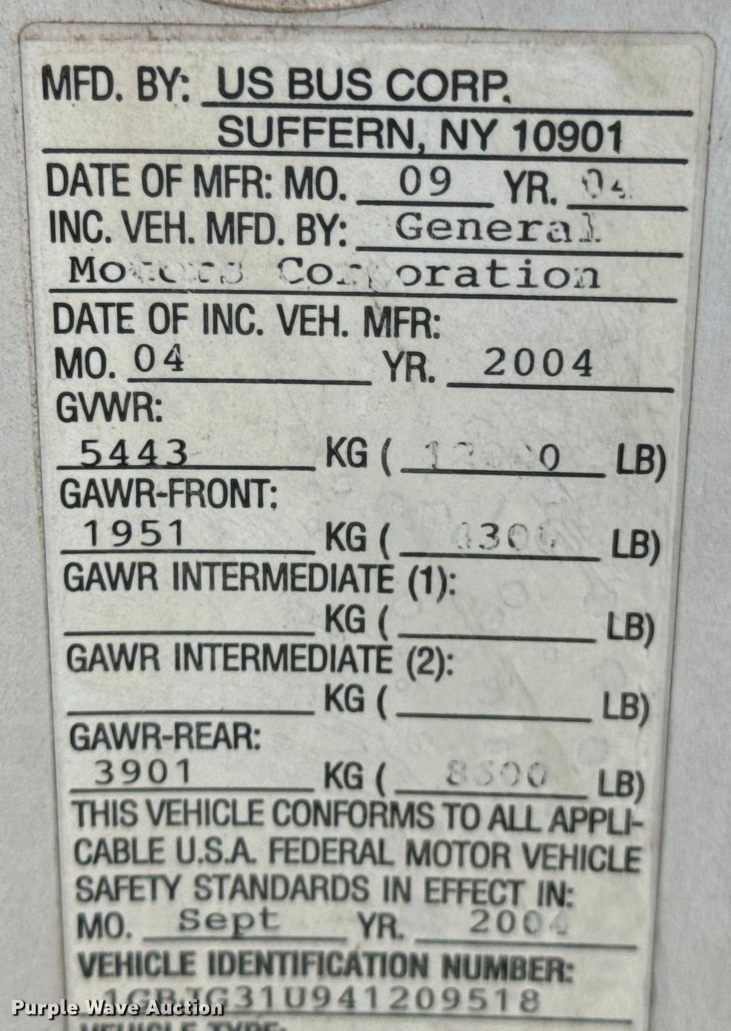 Purple Wave is selling a used Bus in Kansas. This item is a 2004 Chevrolet Express G3500 shuttle bus with the following: Miles: 97,186 on odometer, VIN: 1GBJG31U941209518