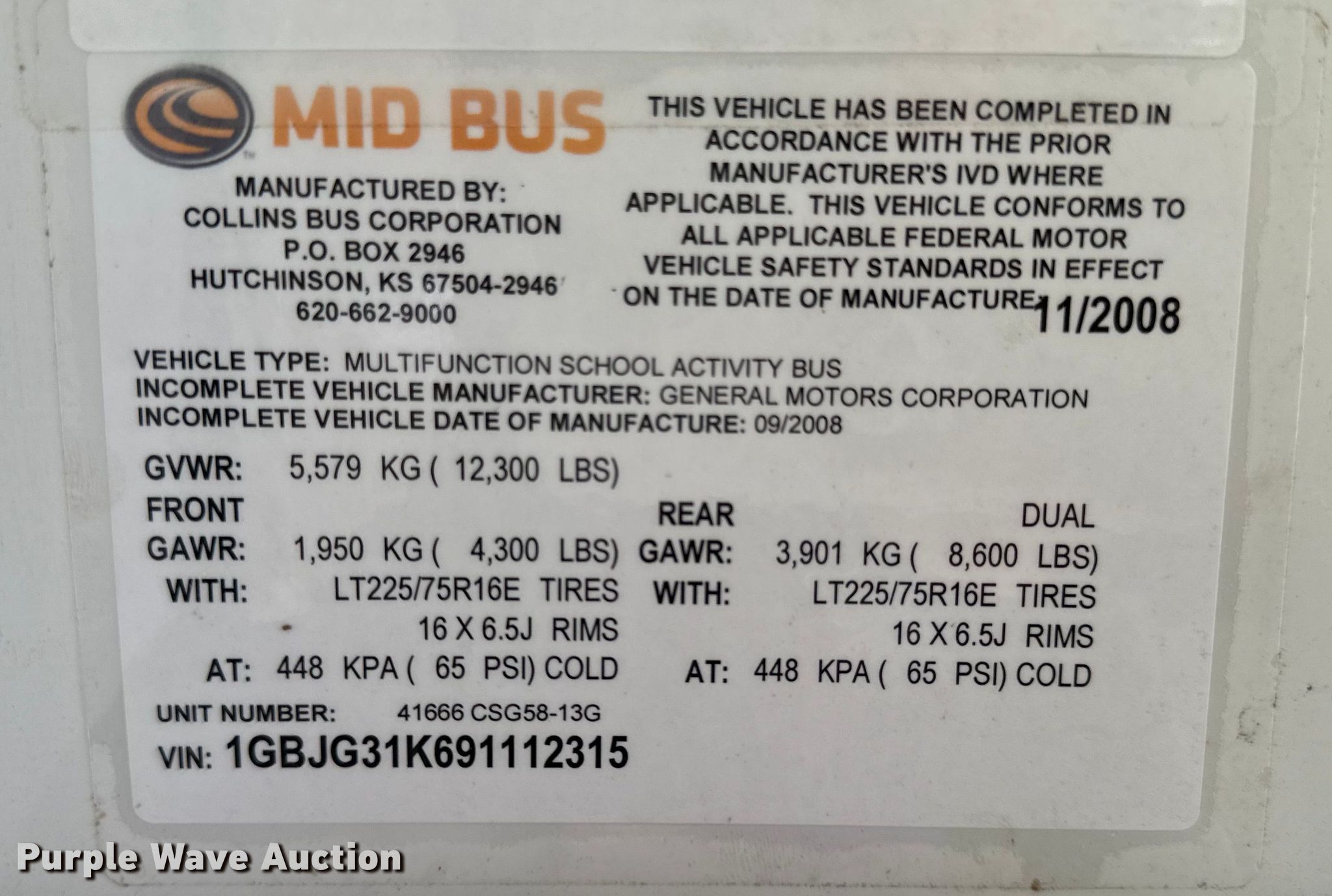 Purple Wave is selling a used Bus in Kansas. This item is a 2009 Chevrolet Express 3500 shuttle bus with the following: Miles: 49,903 on odometer, VIN: 1GBJG31K691112315